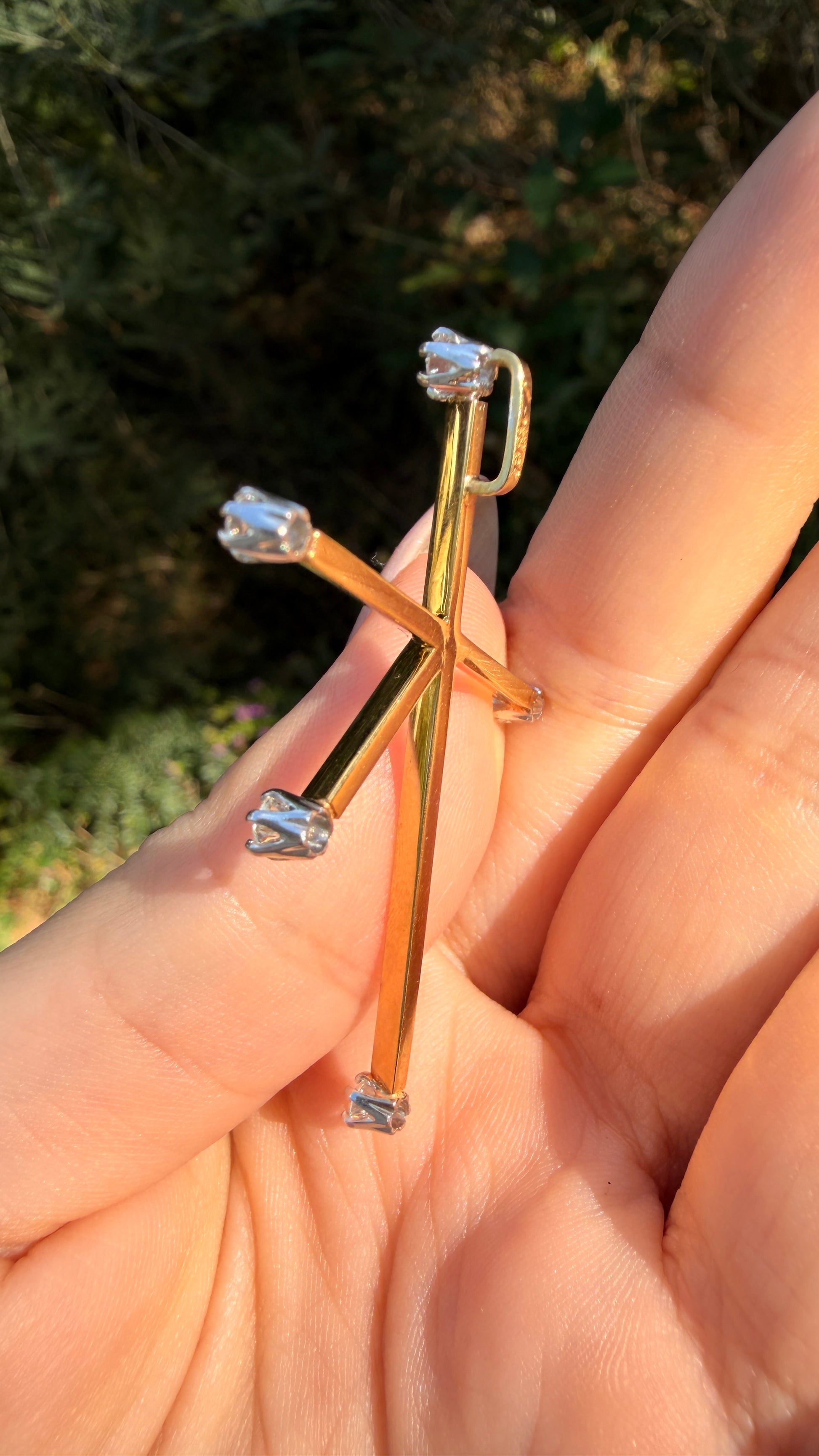A beautiful Vintage yellow 18K approx .3 ctw diamond southern cross constellation pendant with special meaning associated with seeking direction and wisdom. Totally solid, weighs over 4 grams. Round cut diamonds are more grey in color set in white gold with a ton of sparkle, SI/I clarity yet no visible carbon under 10x loupe.
