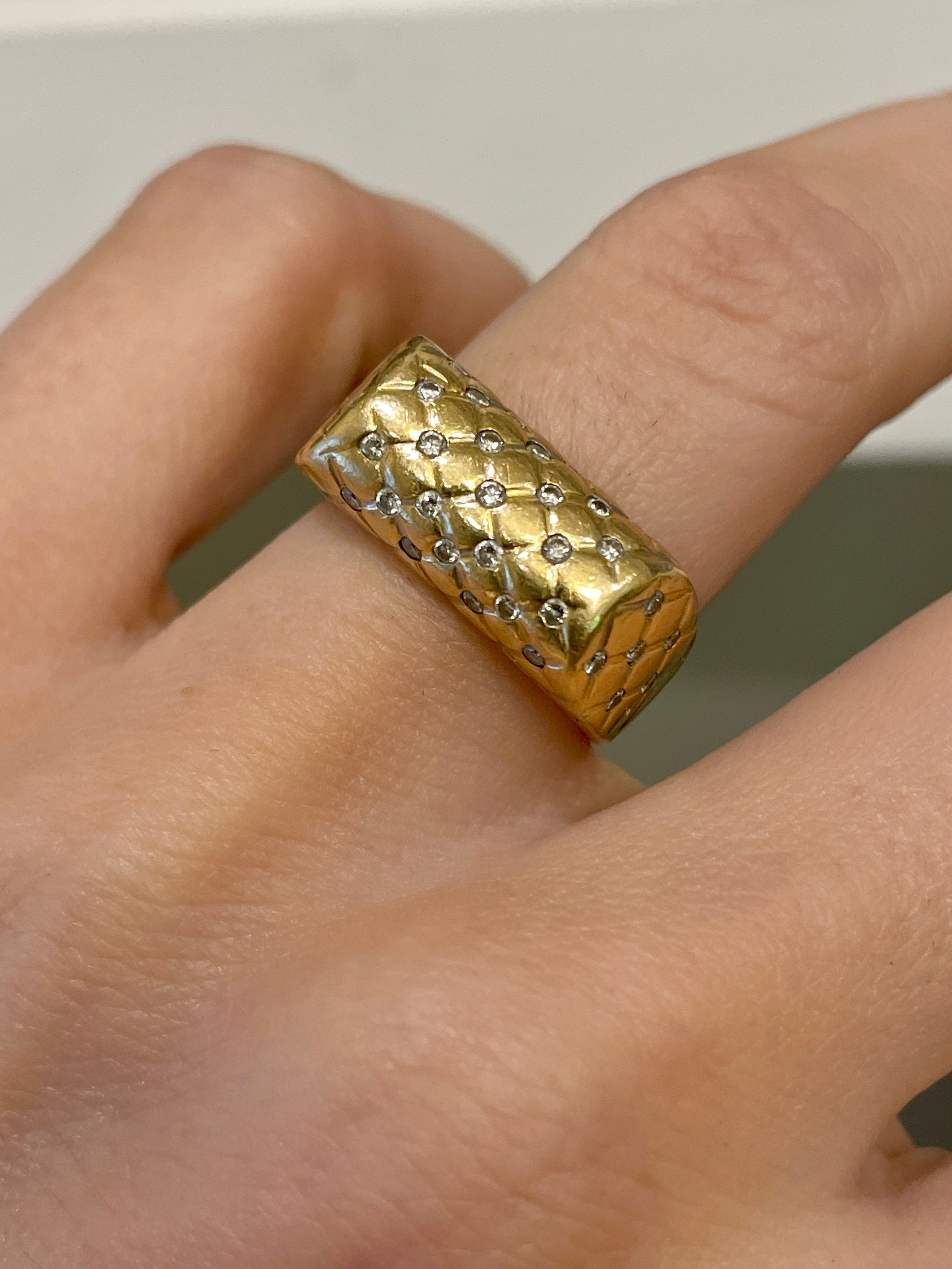 A super sweet Vintage yellow 18K approx .4 ctw diamond quilted pattern squared band, size 6. Sizable. Fabulous and reminds me of a famous handbag! HI color, SI clarity diamonds add a nice amount of sparkle incorporated into the pattern. Measures 8.6 mm wide. Weighs 9.2 grams. Hallmarked 18K. Very good preowned condition.
