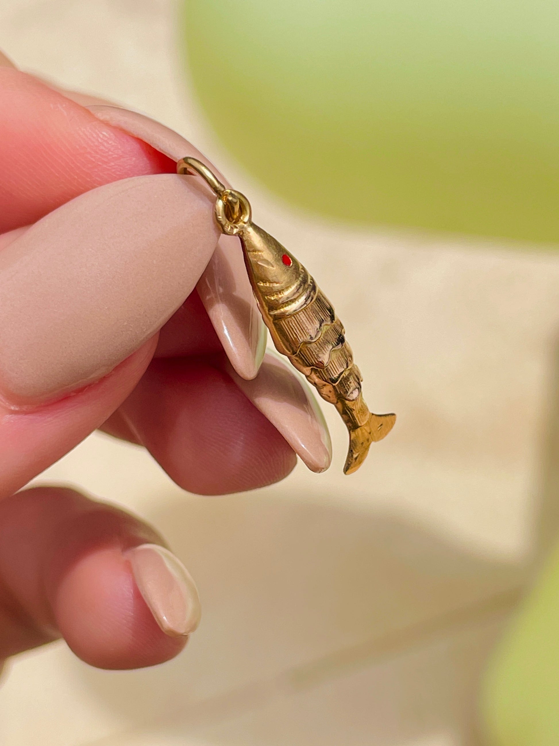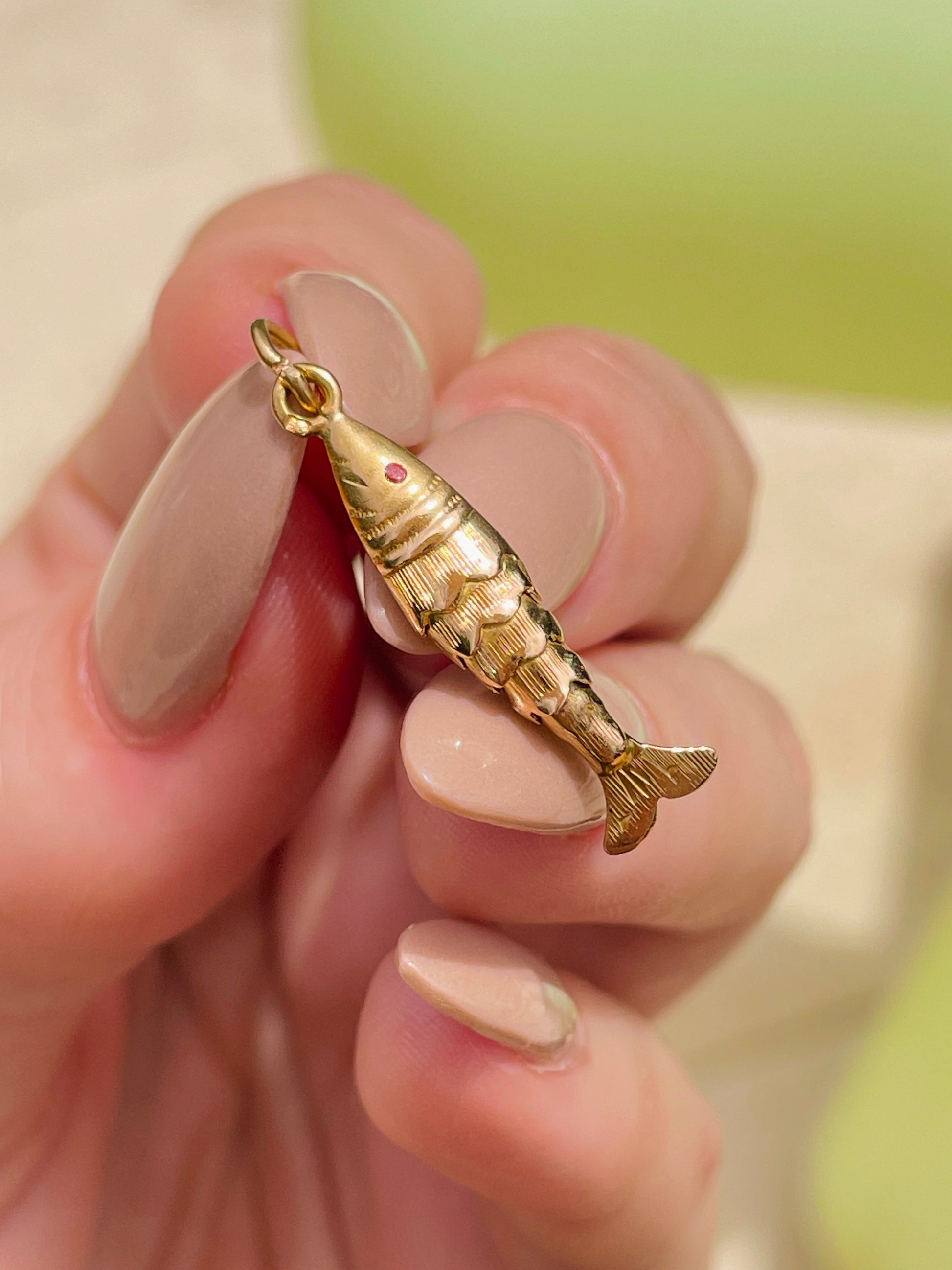 A cute Vintage yellow 18K articulated fish with red eye. Measures 29.4 mm long x 6.6 mm wide. Weighs 1.3 grams. Very good preowned condition.