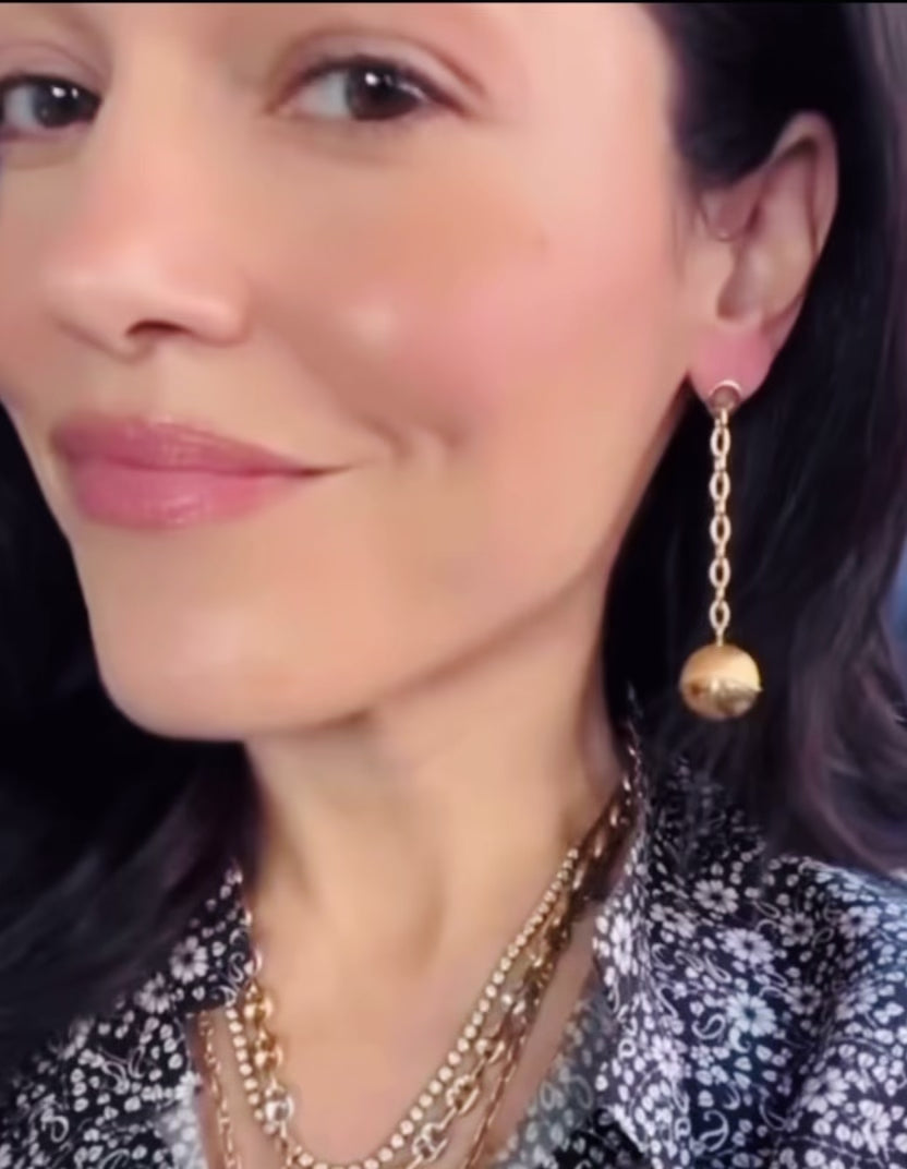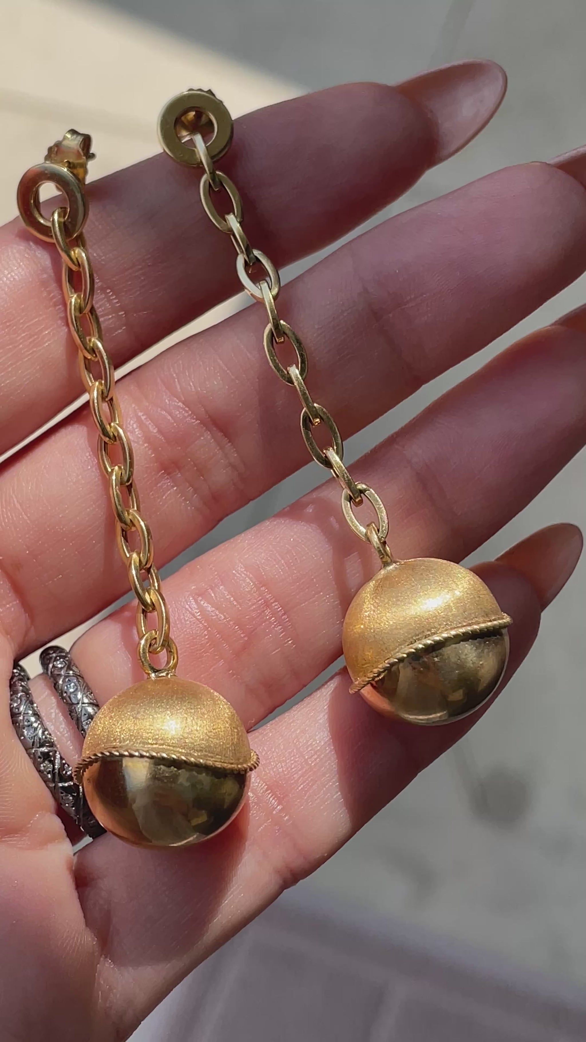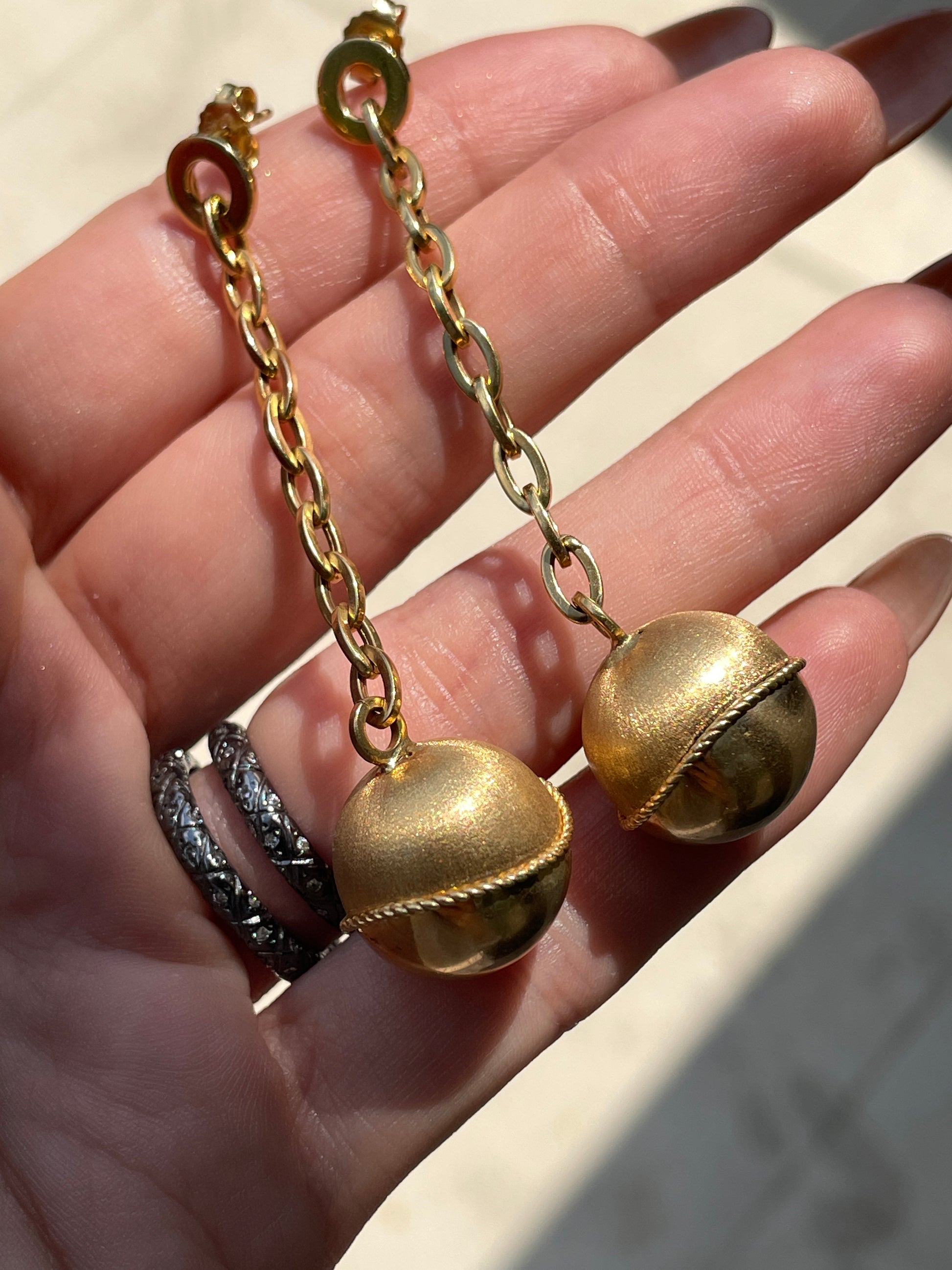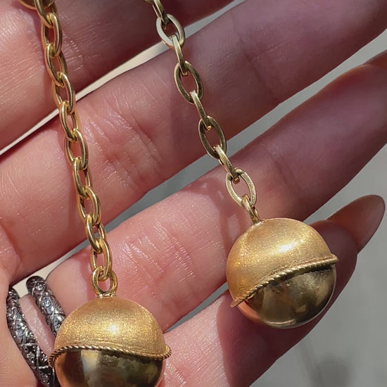 These are so fun! Vintage yellow 18K ball and chain post dangle earrings that make a statement but aren't super heavy! Measure 2.7 inches long. Ball is a combination of textured and polished finish and measures .7 inch x .6 inch. Weighs 9.5 grams combined. Beautiful movement on the ear. Very good preowned condition.