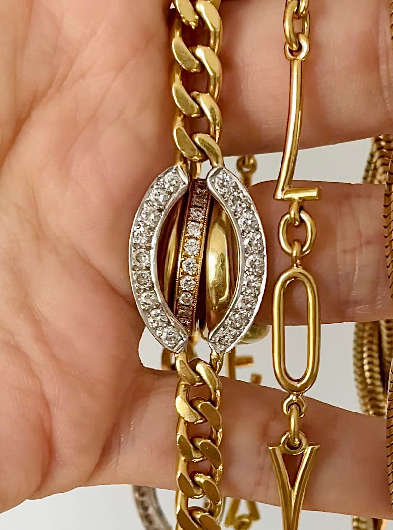 Dream chain alert! Vintage yellow 18K Chimento Designer 2.3 ctw diamond station curb chain, 35.5 inch with the most buttery color. Absolutely beautiful on. Diamond stations are white gold with open back settings to emphasize the diamond sparkle. Stations are 16.6 mm widest, and curb chain, which is totally solid, is 6.2 mm wide. Box clasp with side safety is secure and chain is fully hallmarked for Chimento designer and for 18K gold.