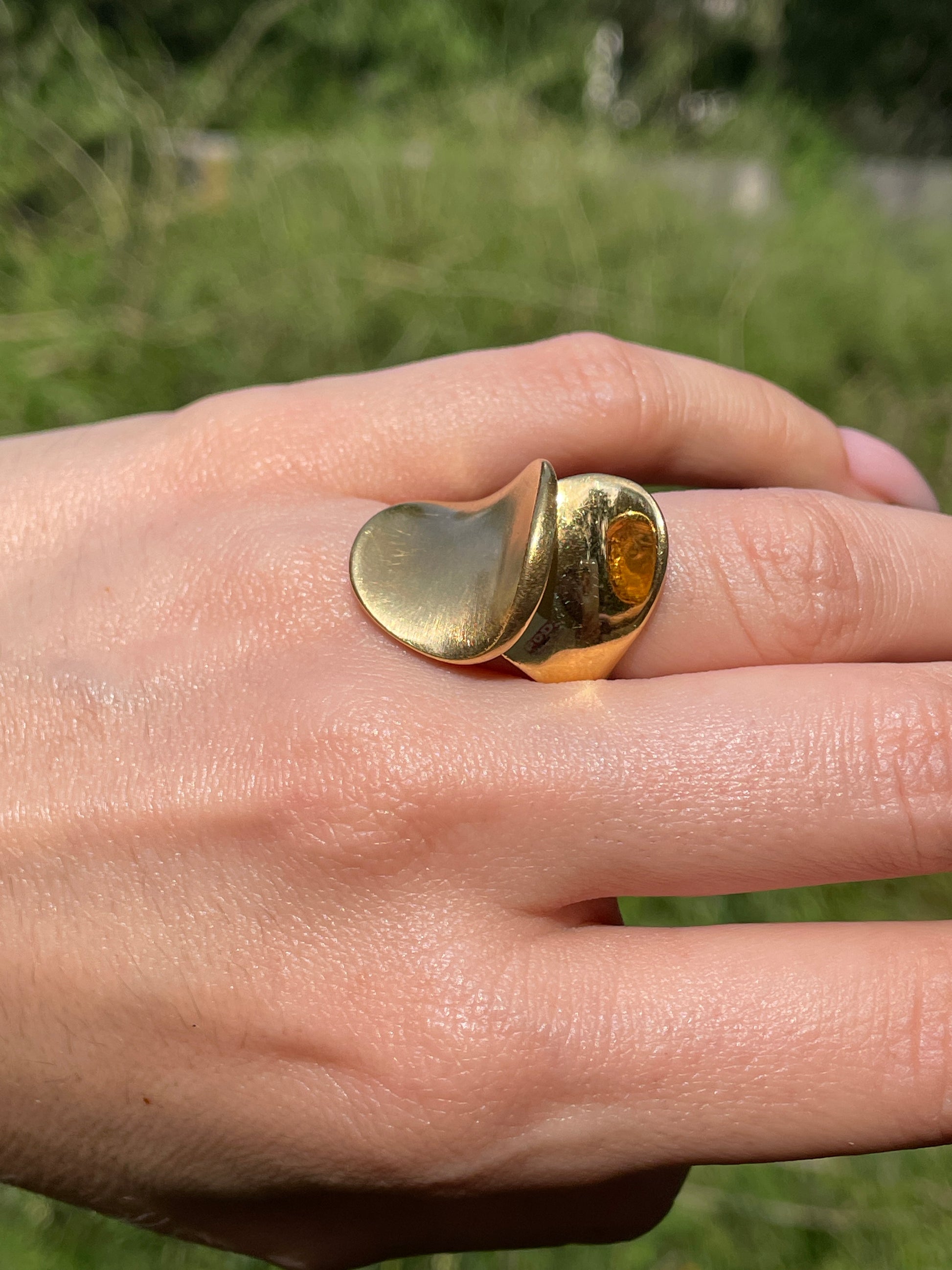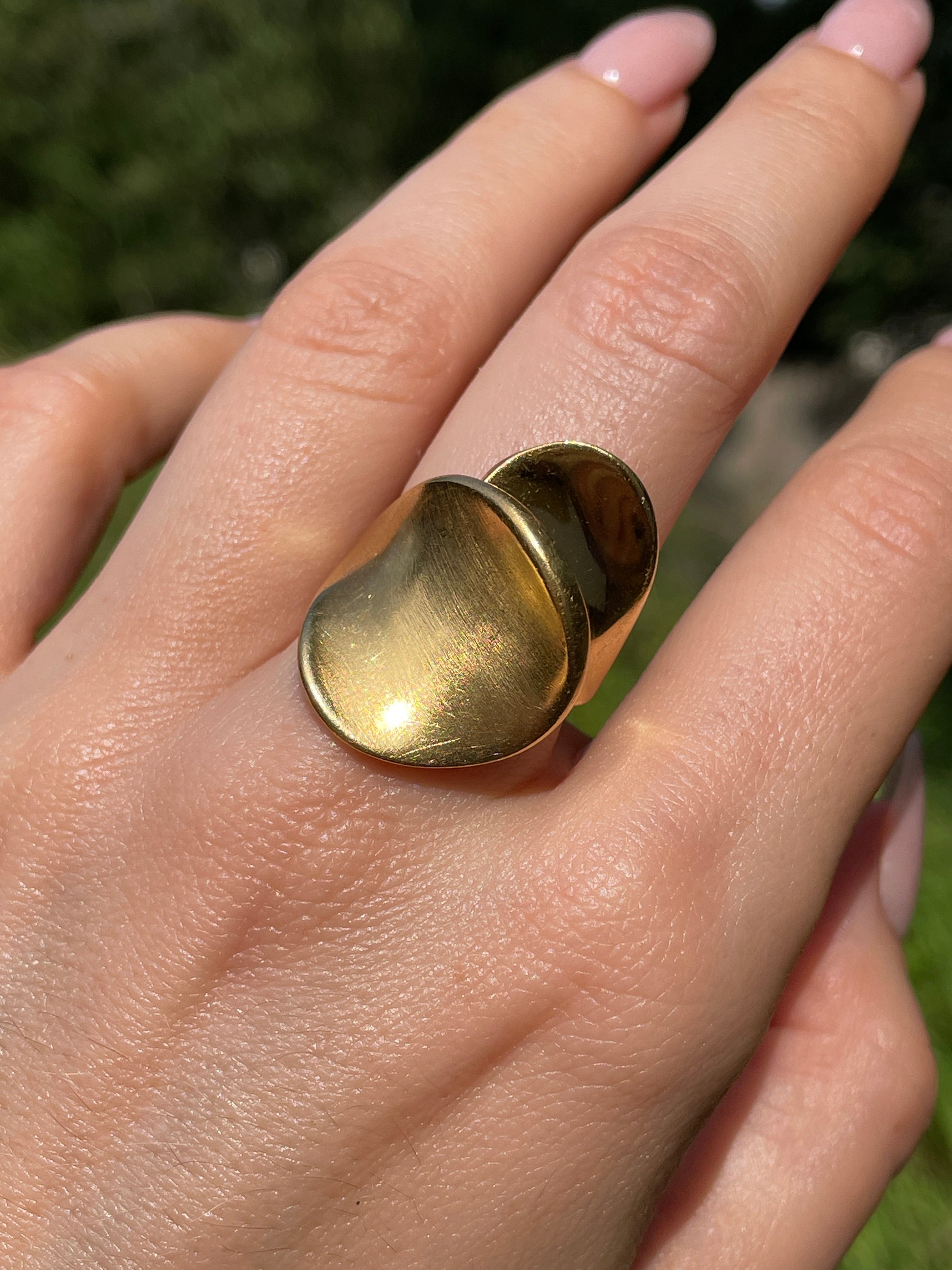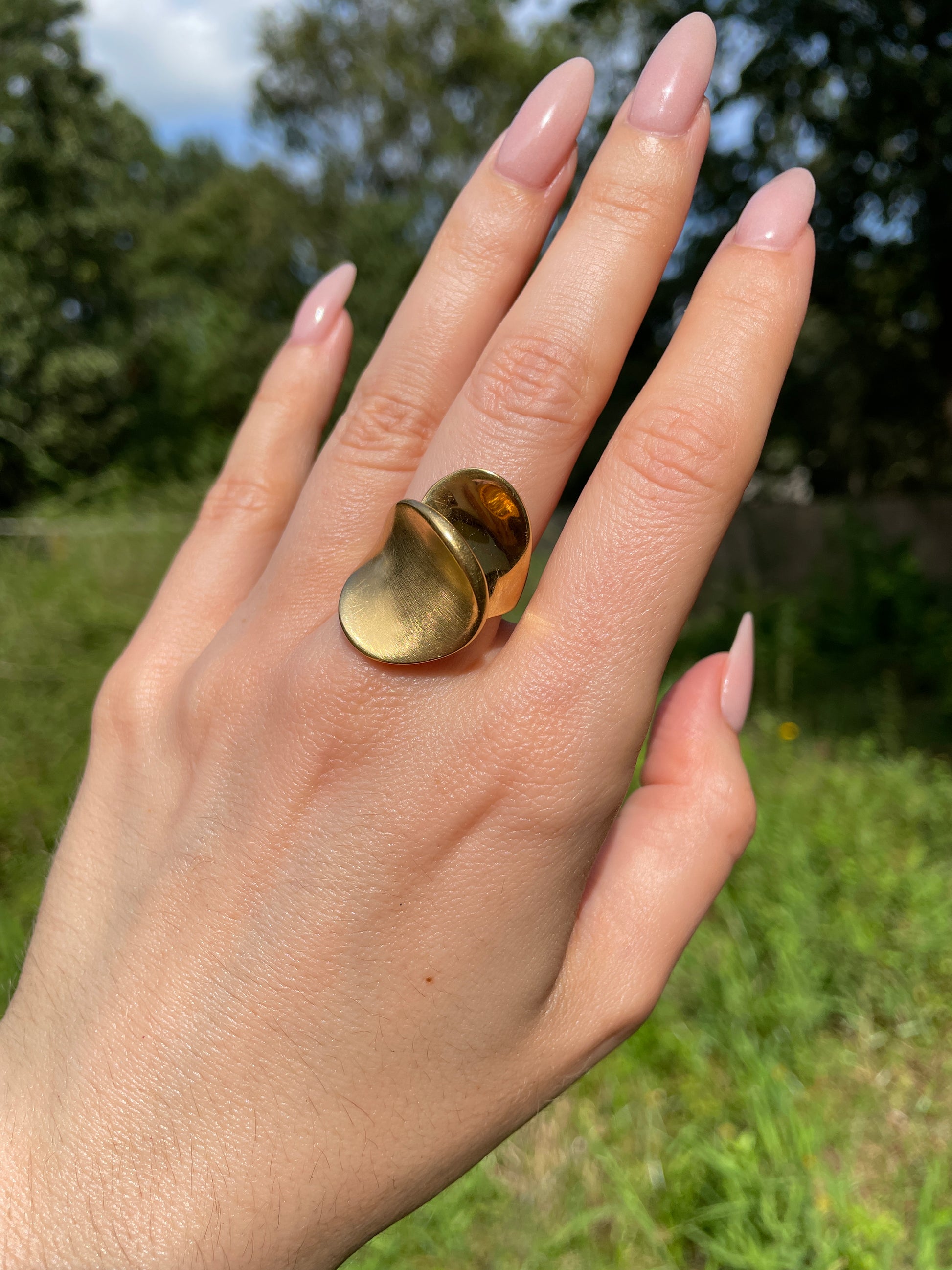 One petal is polished while the other is satin finish, adding to the striking character and dimension of this statement ring. Weighs 12.2 grams. Hallmarked '750' for 18K gold and has an unidentified maker's hallmark. In excellent preowned vintage condition.