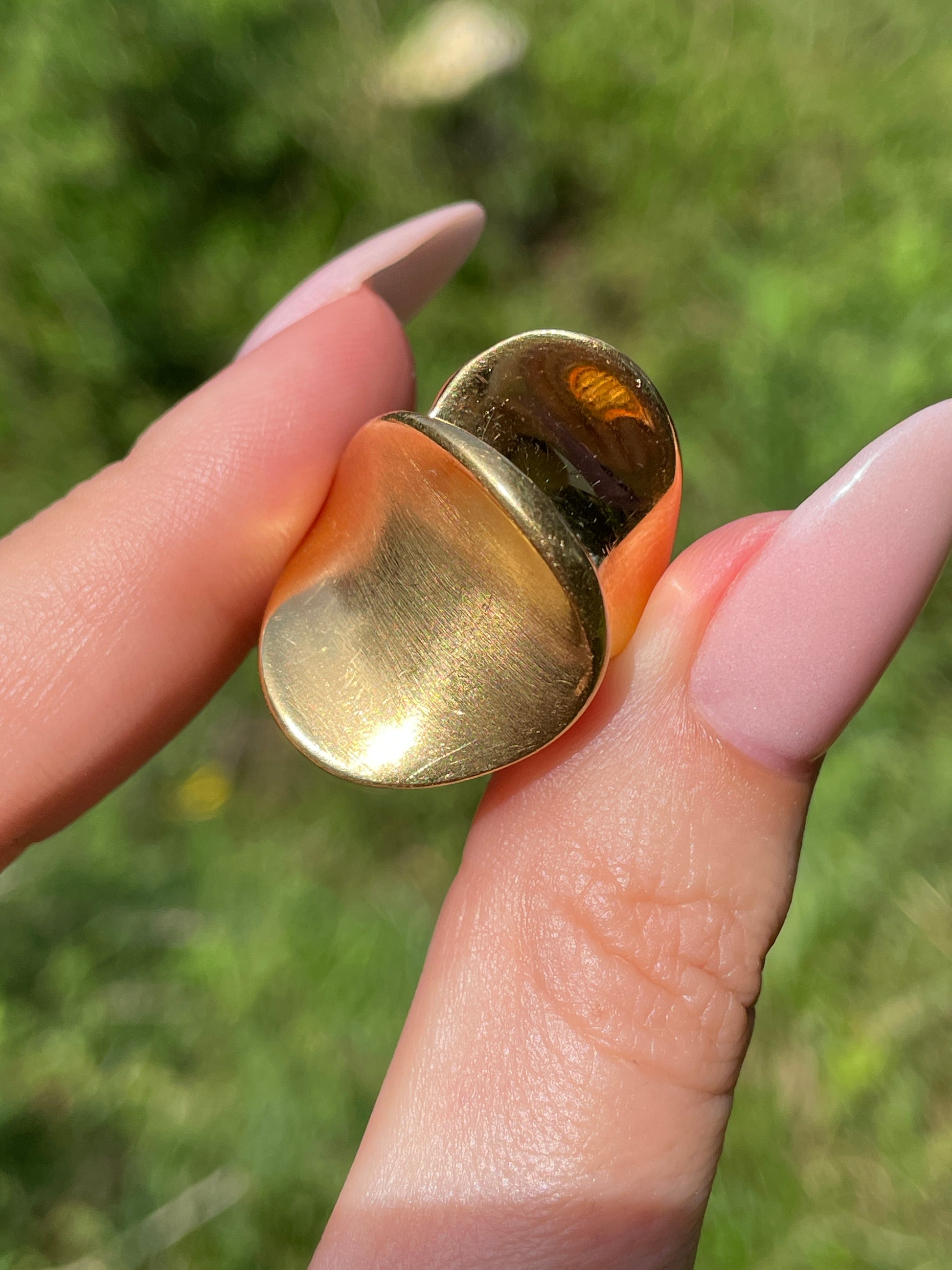 A Vintage yellow 18K crossed petals ring that measures Size 6 on the sizer but fits like 6.25 due to a bit of room accommodated by the design. May be sized up or down**. Fantastic statement coverage of 27.6 mm wide on the finger.