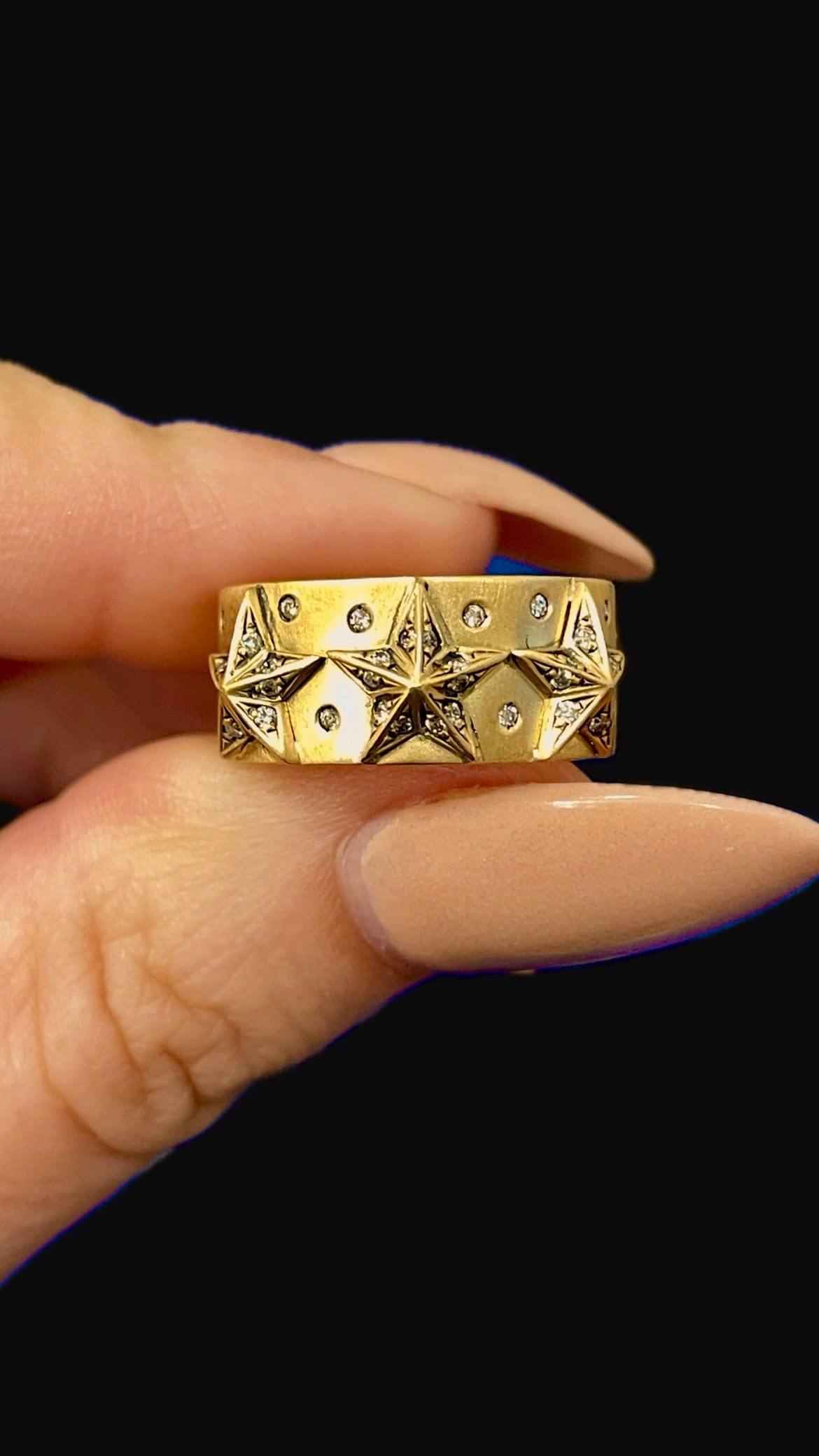A super sweet Estate yellow 18K approx .3 ctw diamond star wide band, fits like size 6.5 due to width. Fabulous look! Matte finish on the band and stars are three dimensional. Measures 8.6 mm wide. Weighs 7.5 grams. Hallmarked 750 for 18K gold and unidentified partial markers mark (EL). Very good preowned condition.