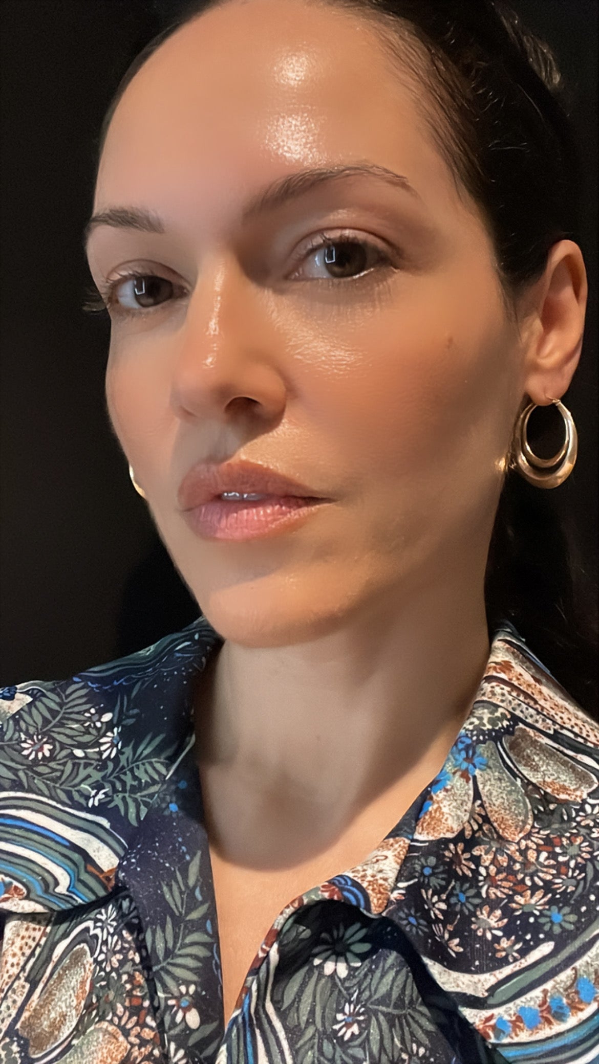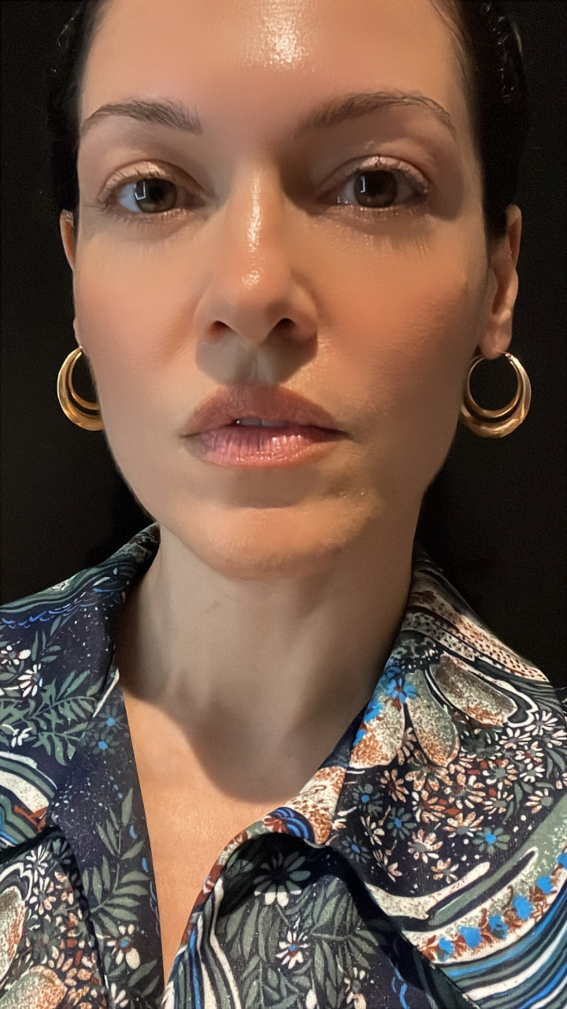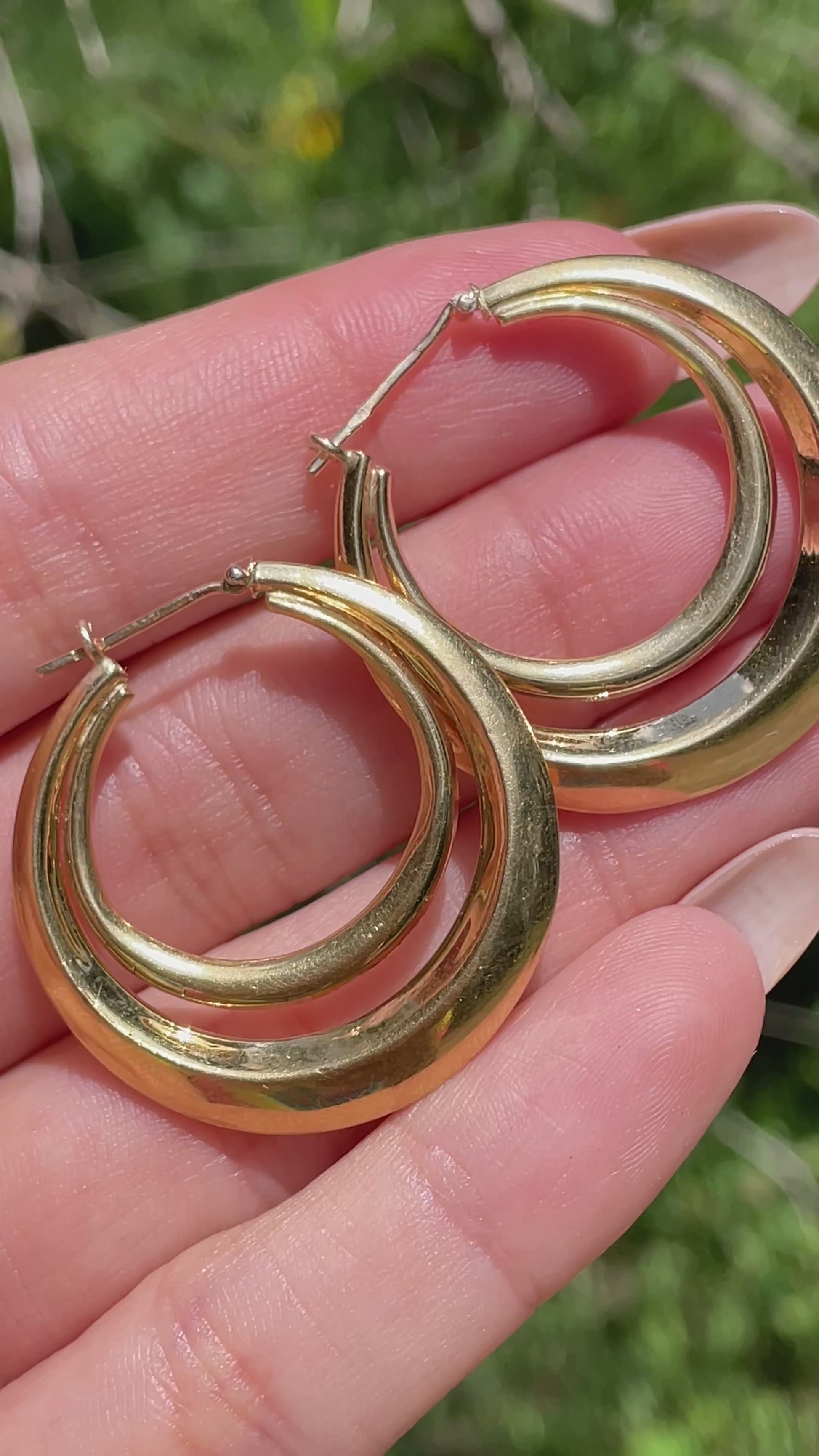 A super chic pair of Vintage yellow 18K double hoop earrings with hinge posts. A few small dings in the gold that aren’t very noticeable. Measure 31.6 mm long from post and 31.5 mm across. Weighs 4.6 grams. In good preowned condition.
