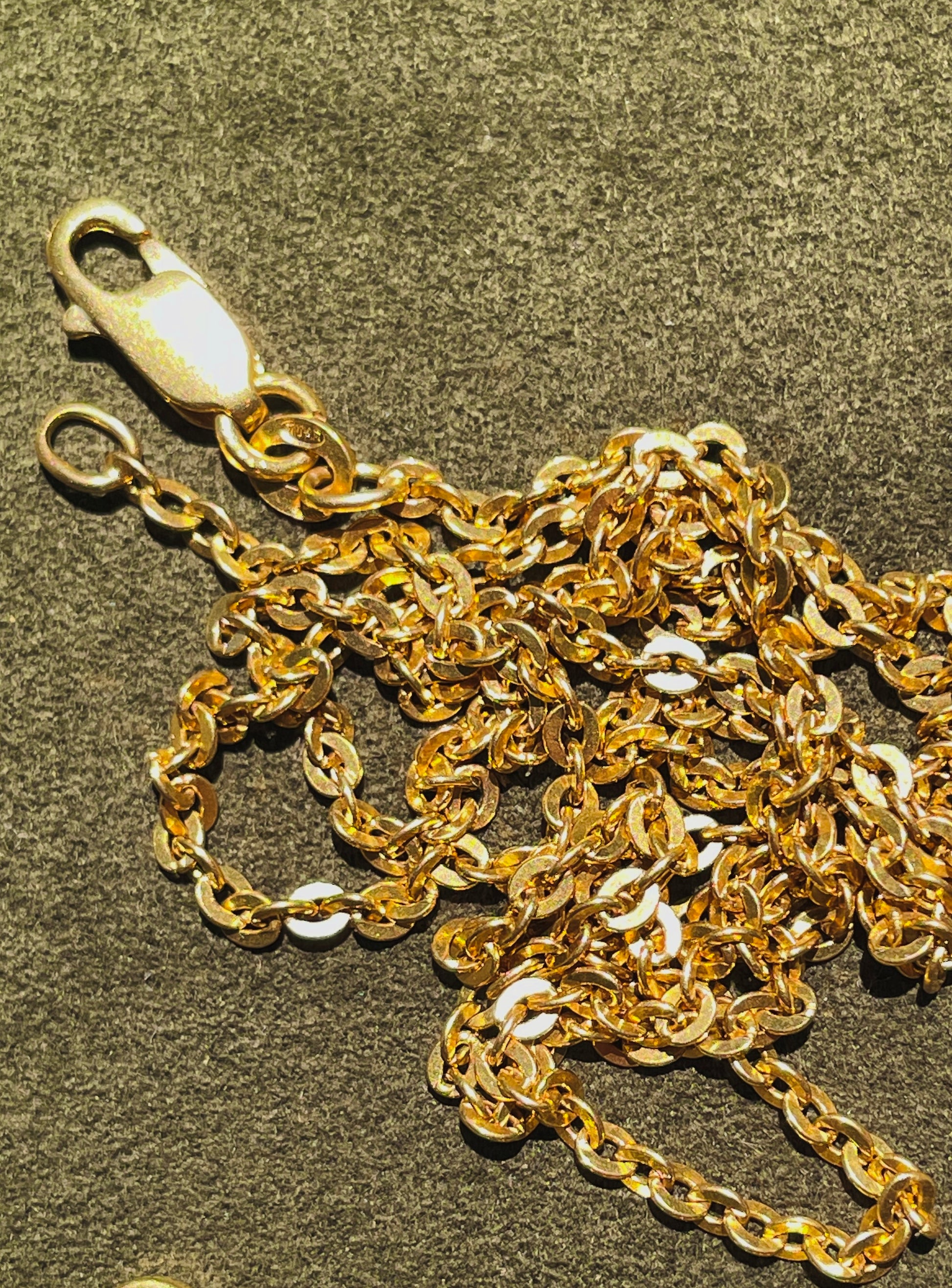 Such a great wearable Vintage yellow 18K flat cable chain by UnoAerre Italian maker, 27 inch long with lobster clasp. A totally solid link that is super durable and great for charms and for wearing everyday. Measures 2.3 mm wide. Weighs over 9.8 grams. In very good preowned vintage condition with no bends or damage. Hallmarked.