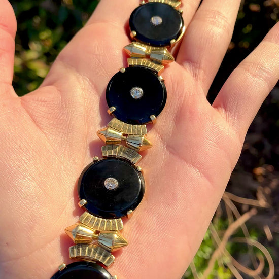 Vintage yellow 18K gold approx .9 ctw old cut diamond and onyx disc bracelet, 7 inch