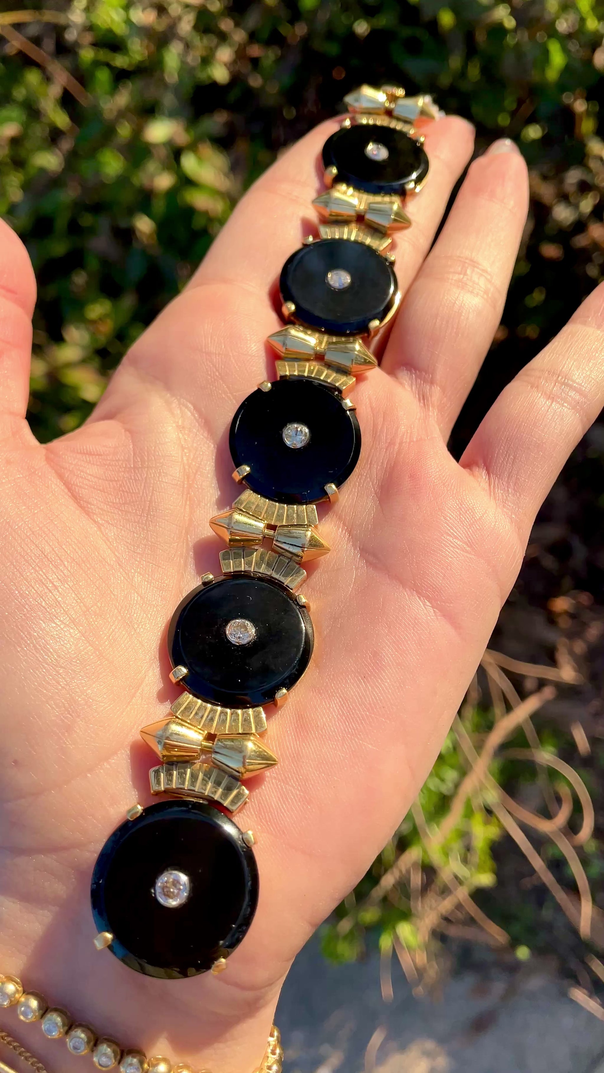 A striking Vintage yellow 18K gold approx .9 ctw old cut diamond and onyx disc bracelet, 7 inch. Measures 22 mm wide. Weighs 46 grams. Gorgeous craftsmanship. Only minor wear on onyx and no noticeable chips. In very good preowned condition.