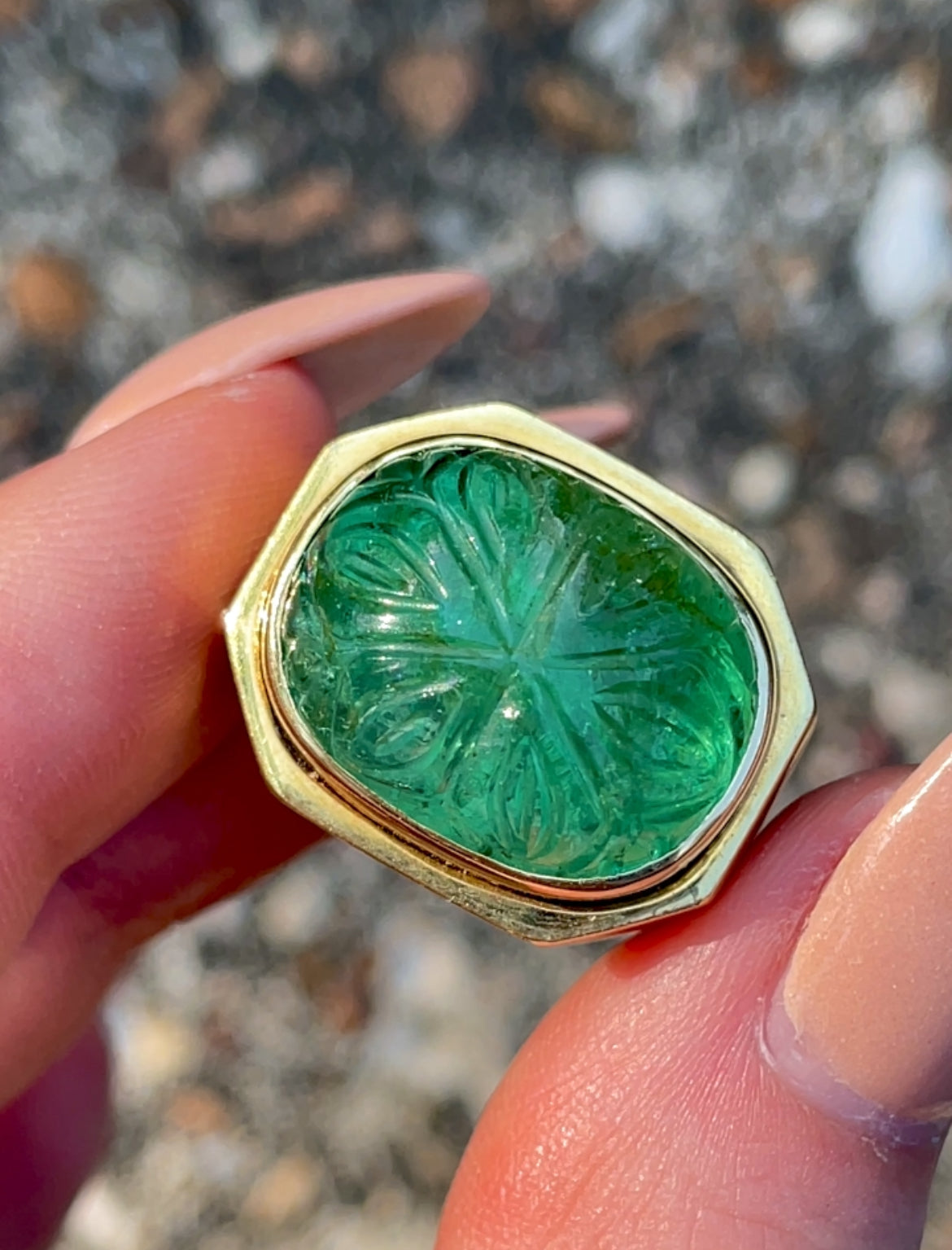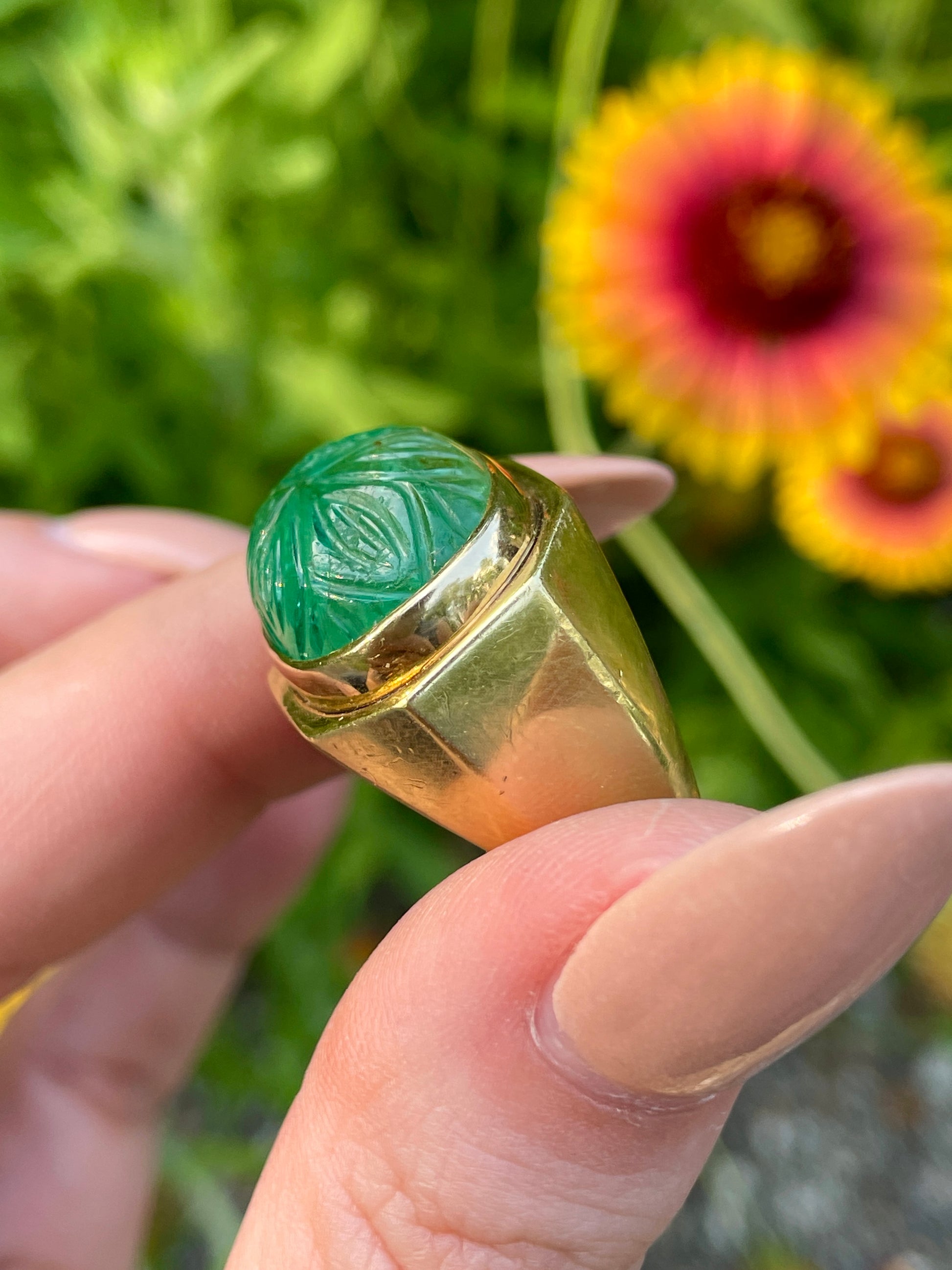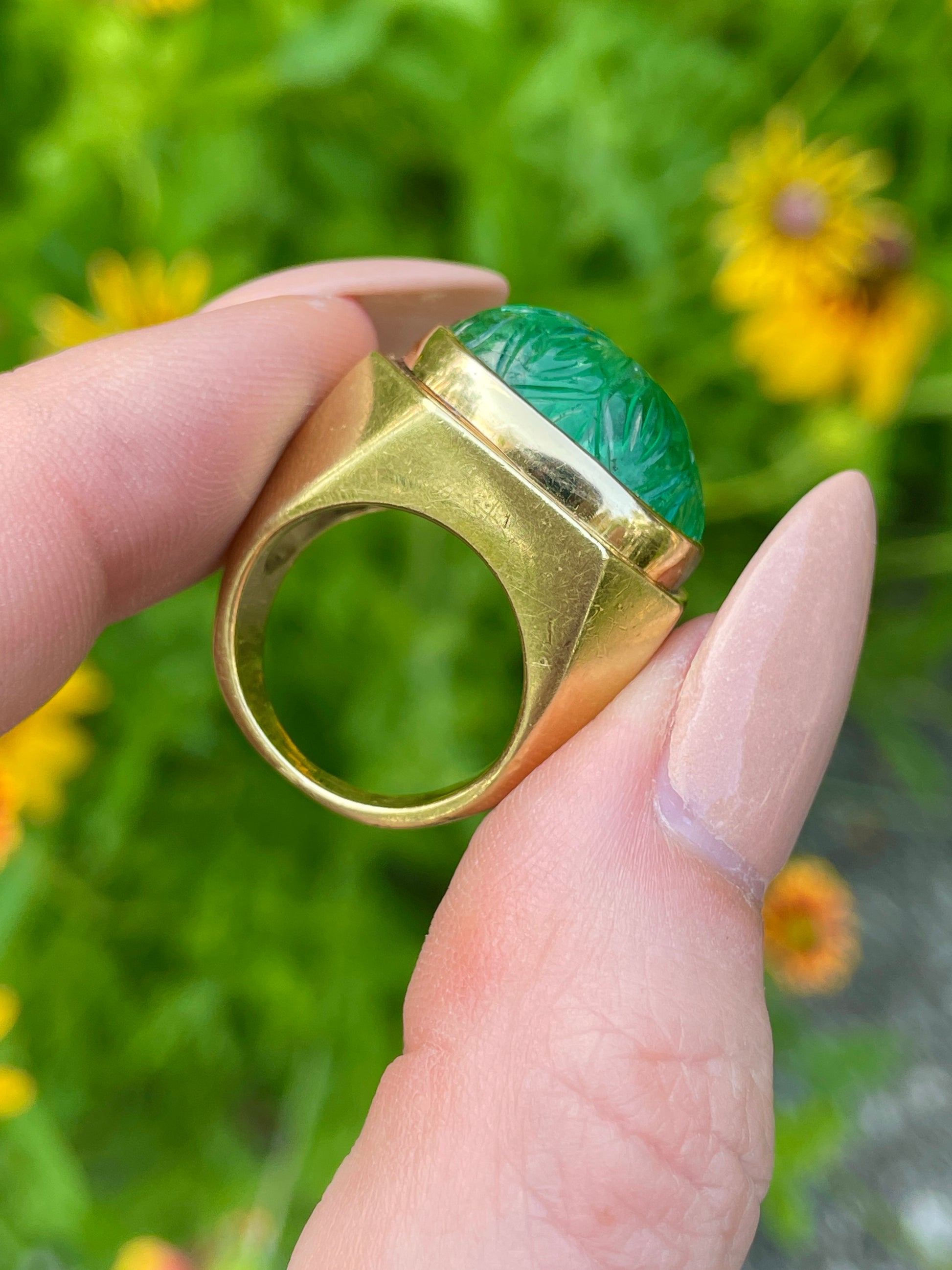 Absolutely gorgeous Vintage yellow 18K gold approx over 5 ctw carved natural emerald ring, size 5 and sizable up or down 2 sizes. The cabochon emerald is beautifully carved in a subtle floral design and the stone is especially rich in color with natural inclusions that add to the intriguing character of this natural stone. Set in a heavy yellow 18K gold raised bezel and geometric setting which is such a beautiful pairing with the emerald. Absolutely gorgeous when worn.