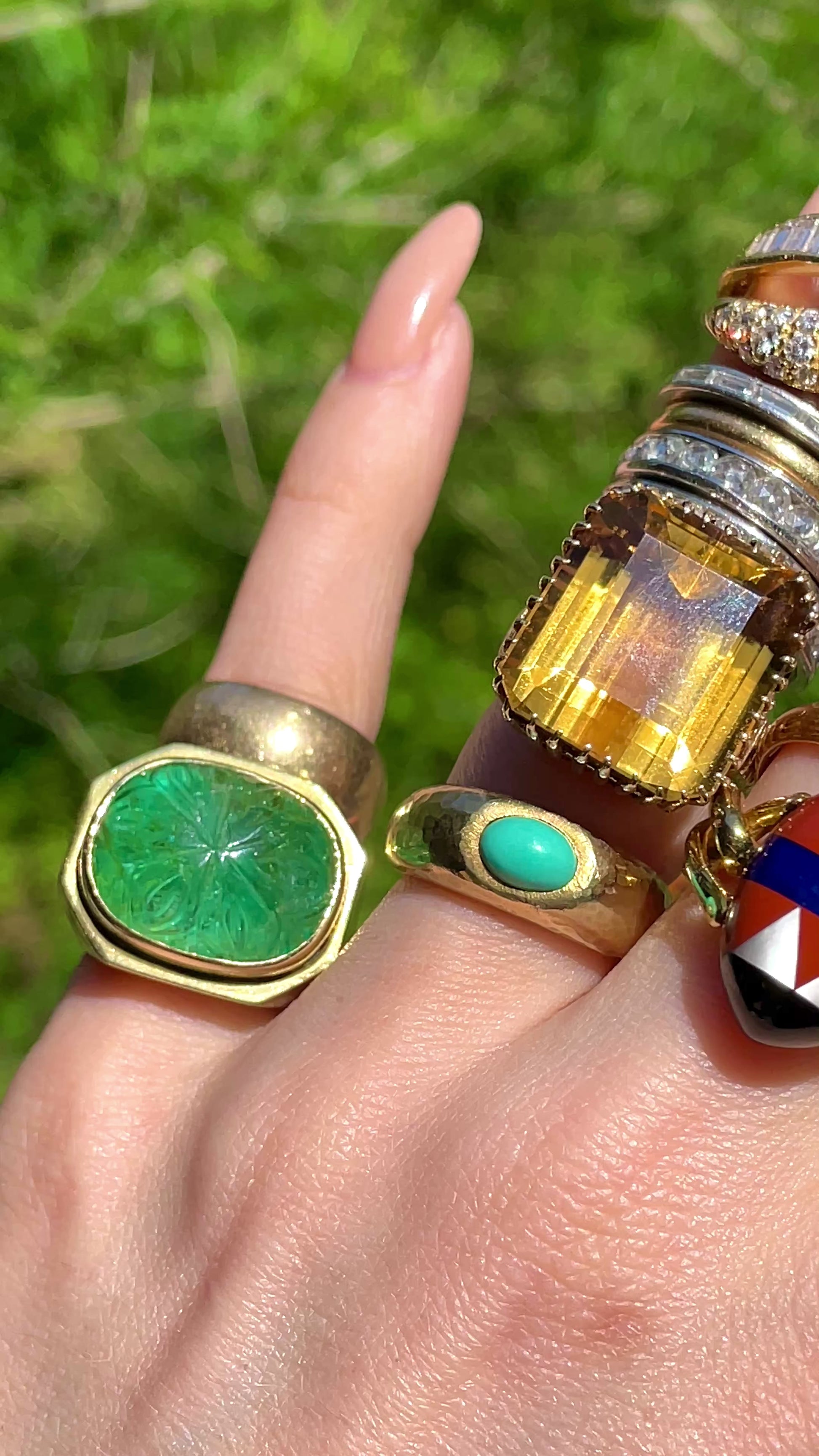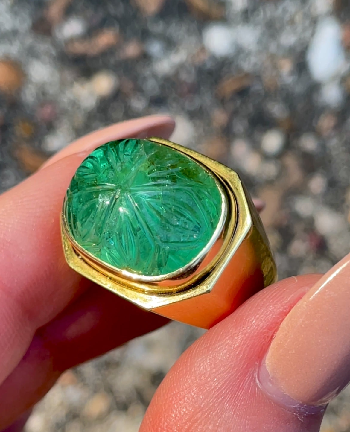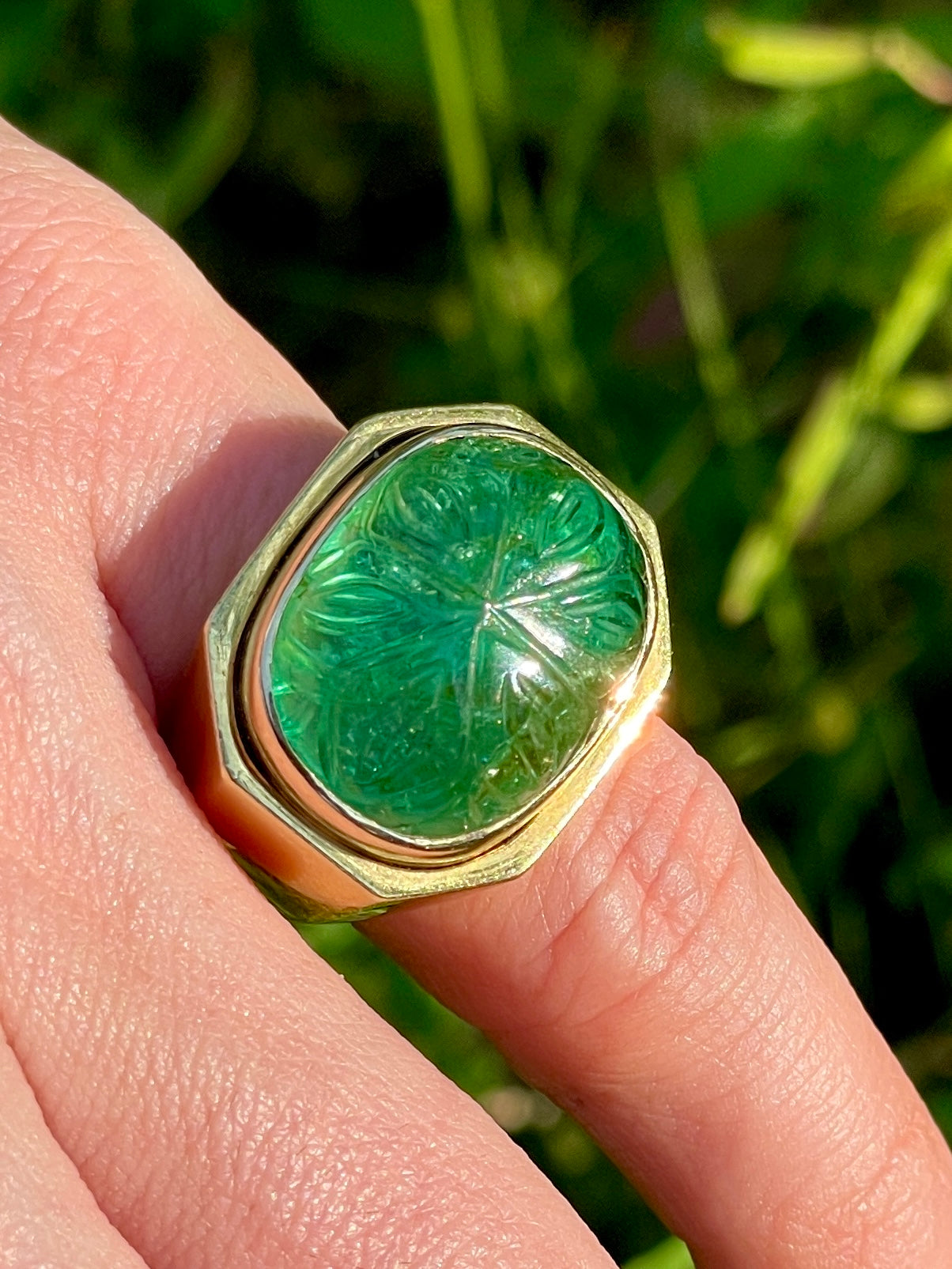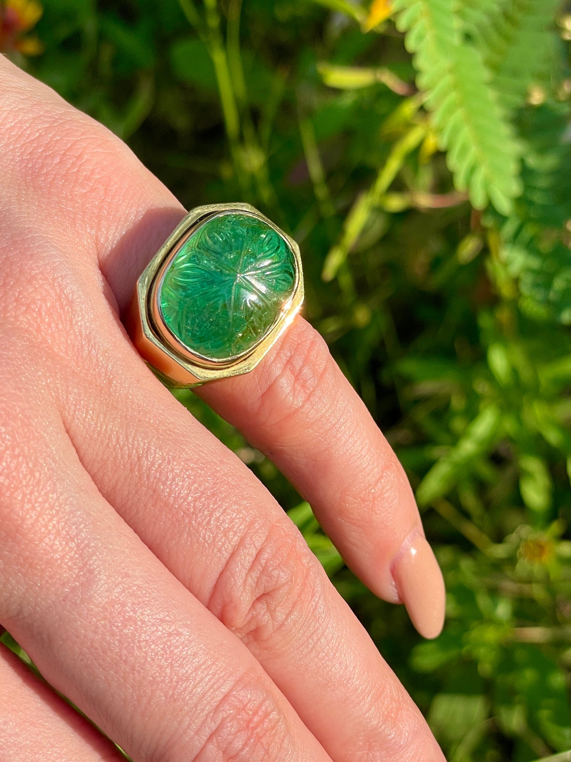 Absolutely gorgeous Vintage yellow 18K gold approx over 5 ctw carved natural emerald ring, size 5 and sizable up or down 2 sizes. The cabochon emerald is beautifully carved in a subtle floral design and the stone is especially rich in color with natural inclusions that add to the intriguing character of this natural stone. Set in a heavy yellow 18K gold raised bezel and geometric setting which is such a beautiful pairing with the emerald. Absolutely gorgeous when worn.
