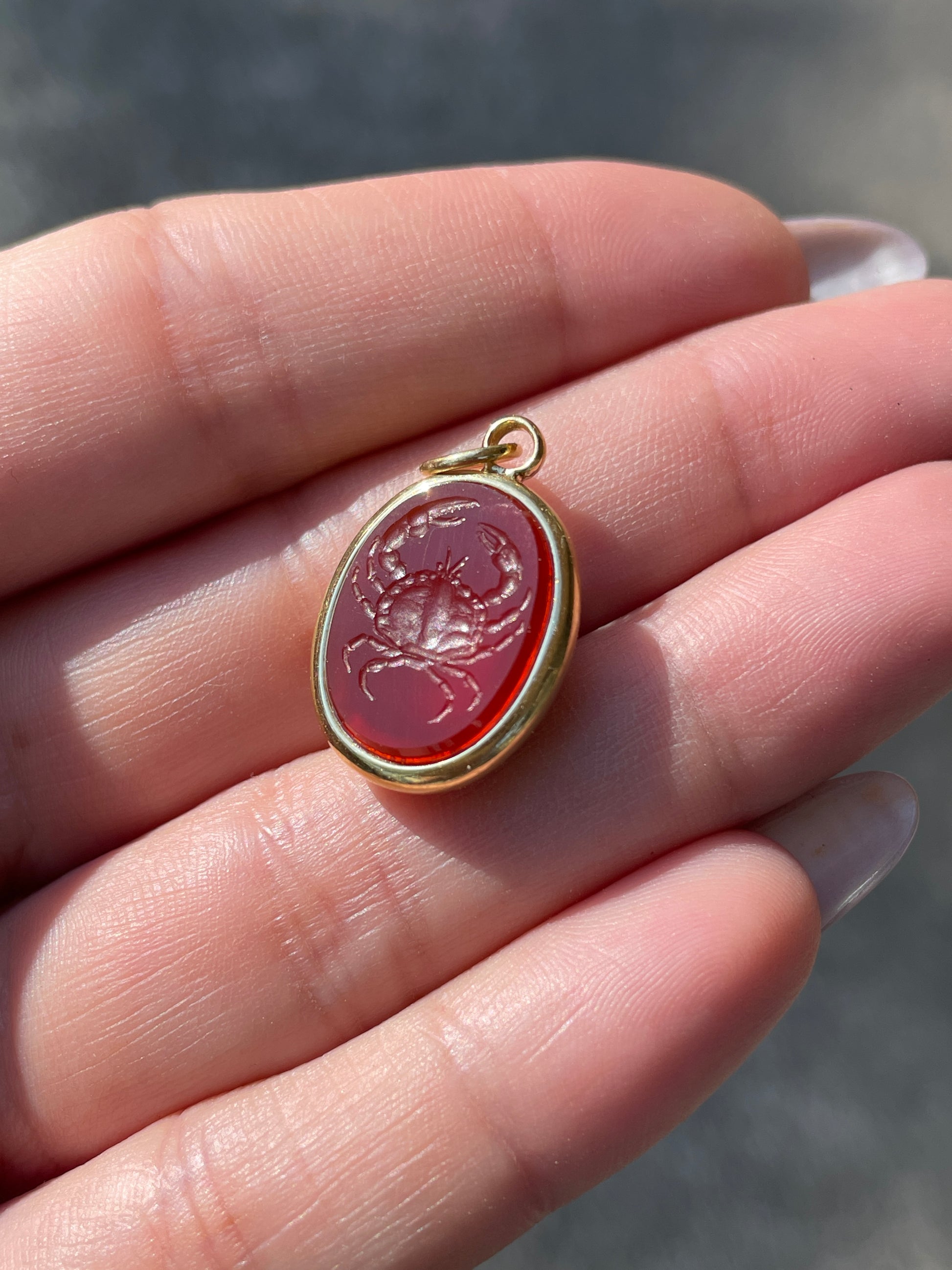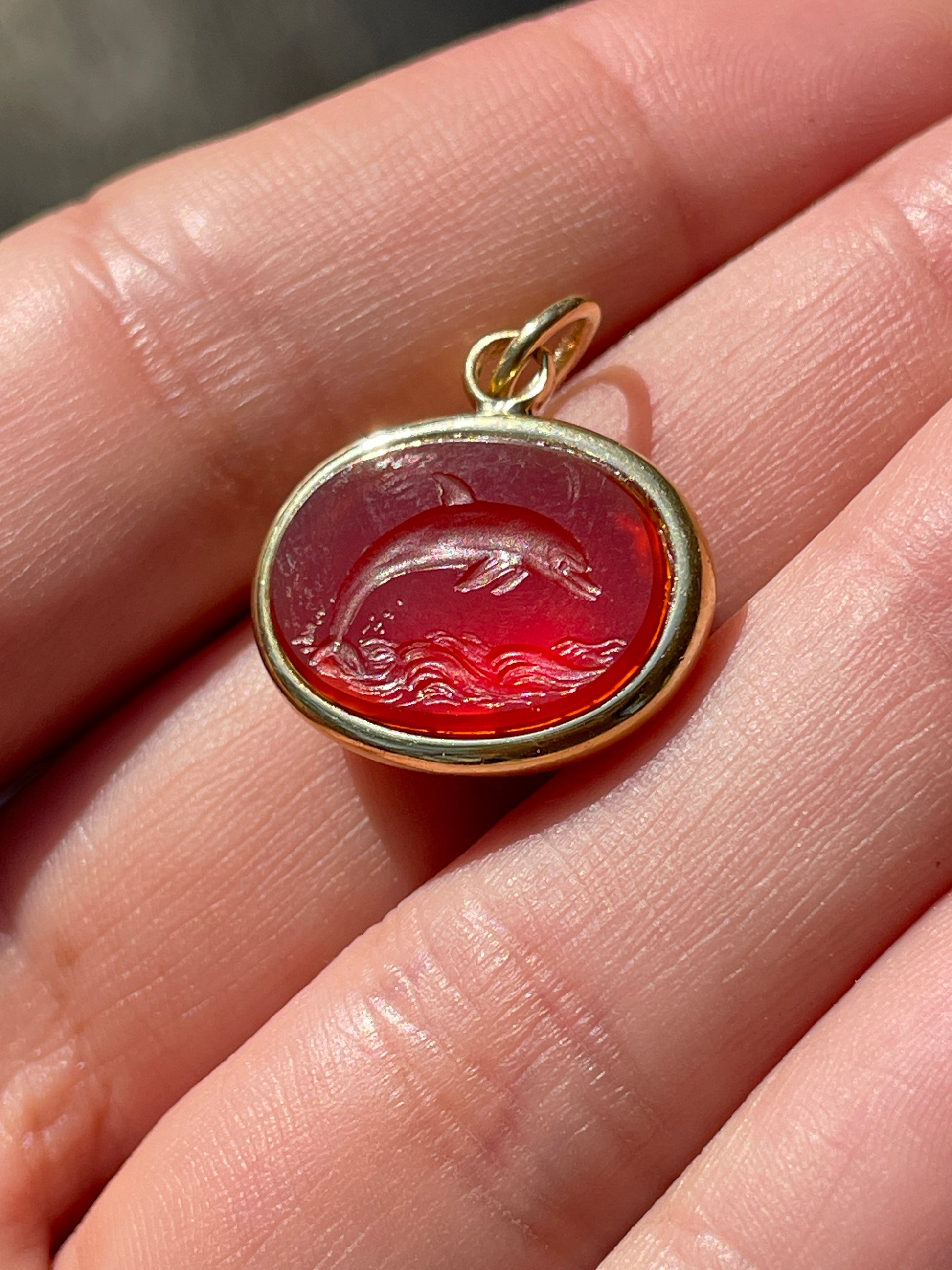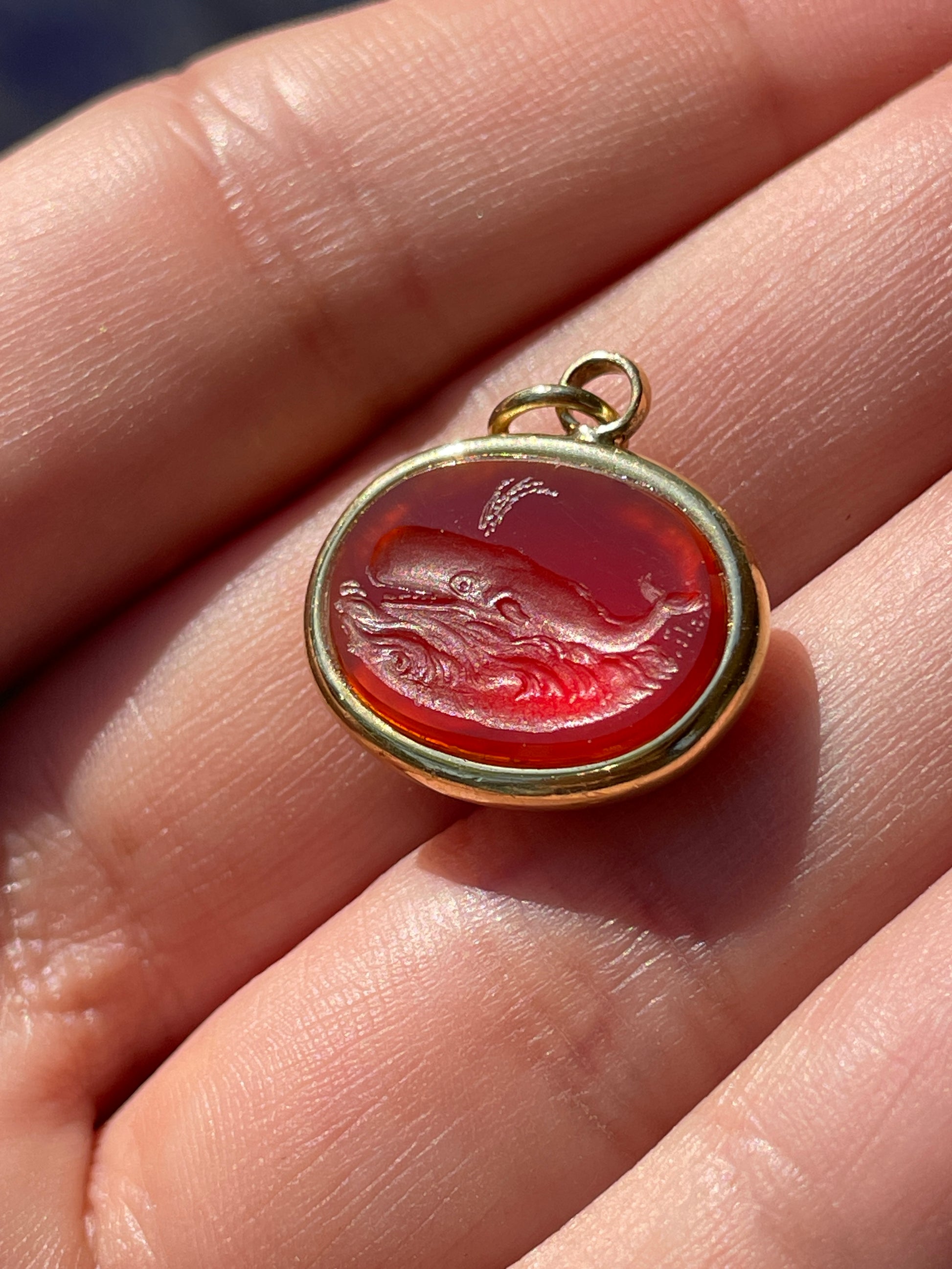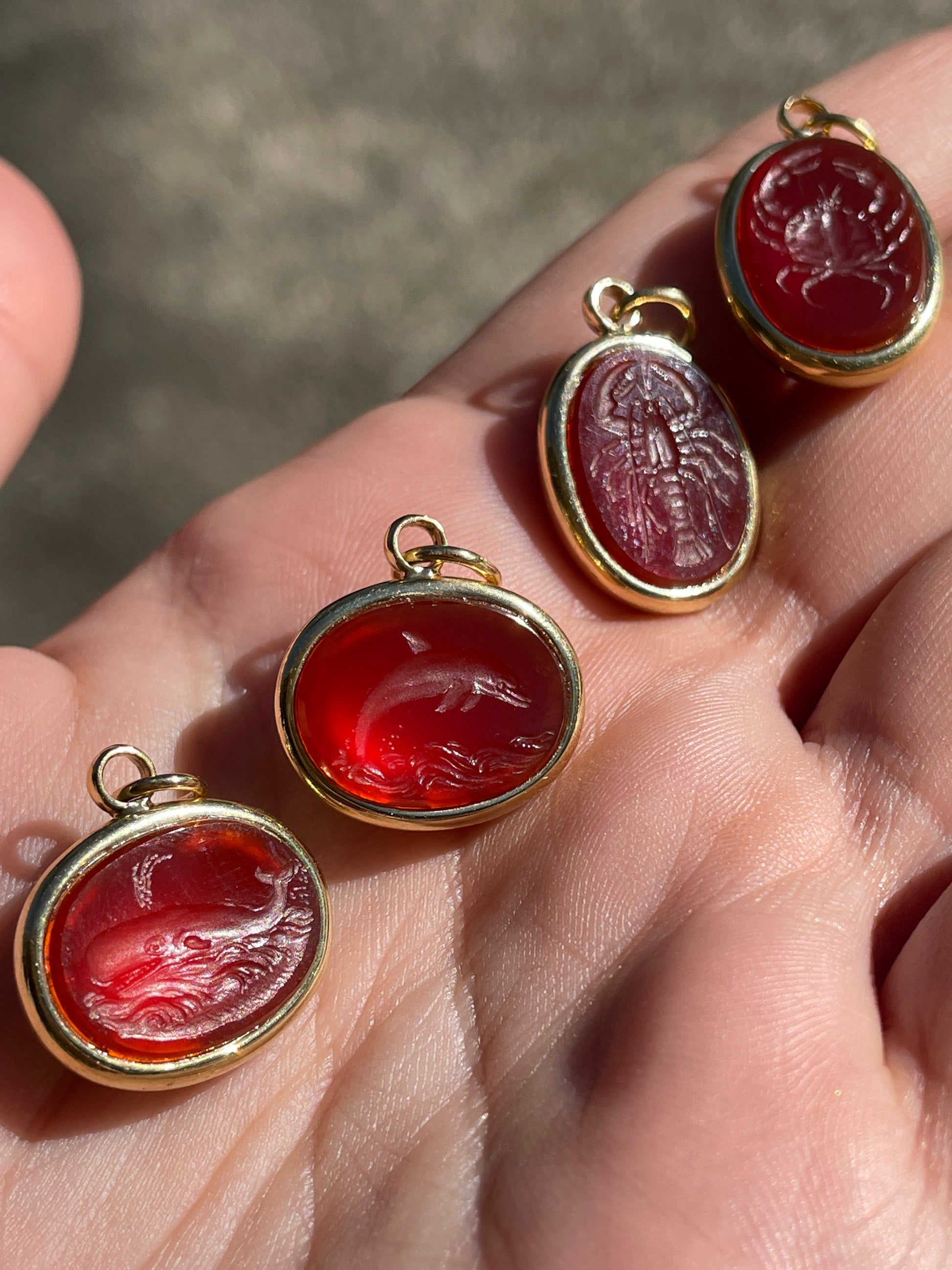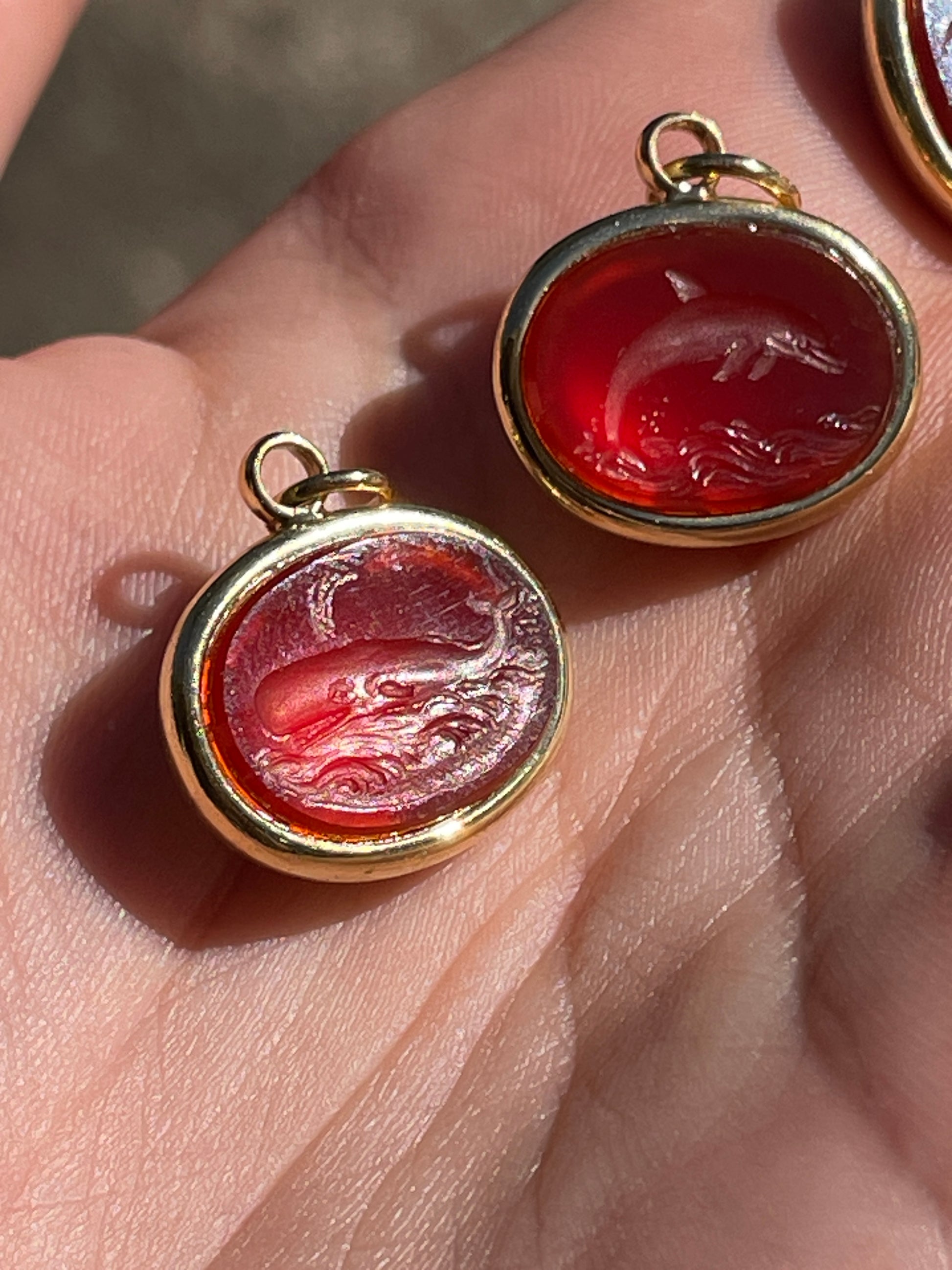 Vintage yellow 18K carved carnelian aquatic animal pebble pendants