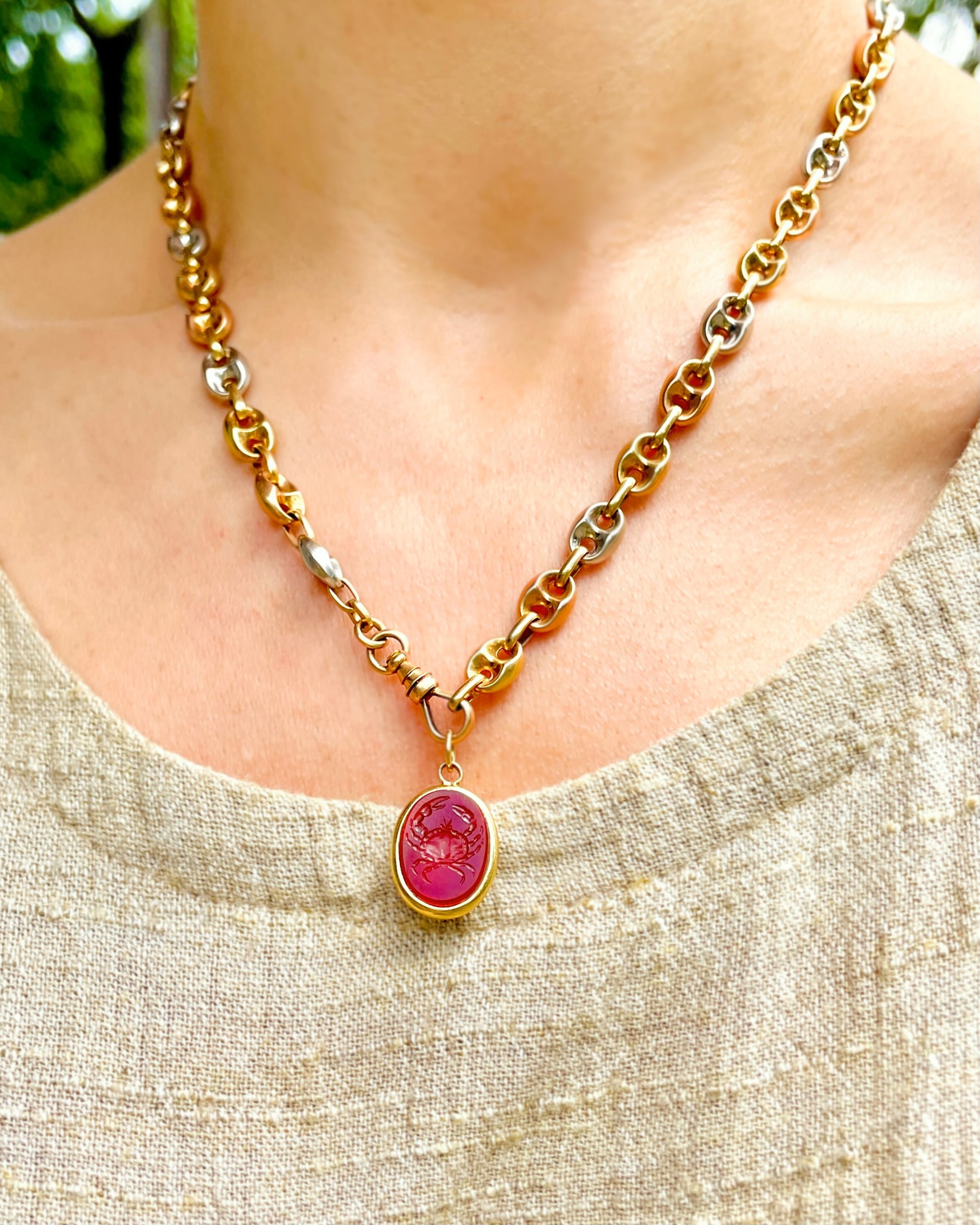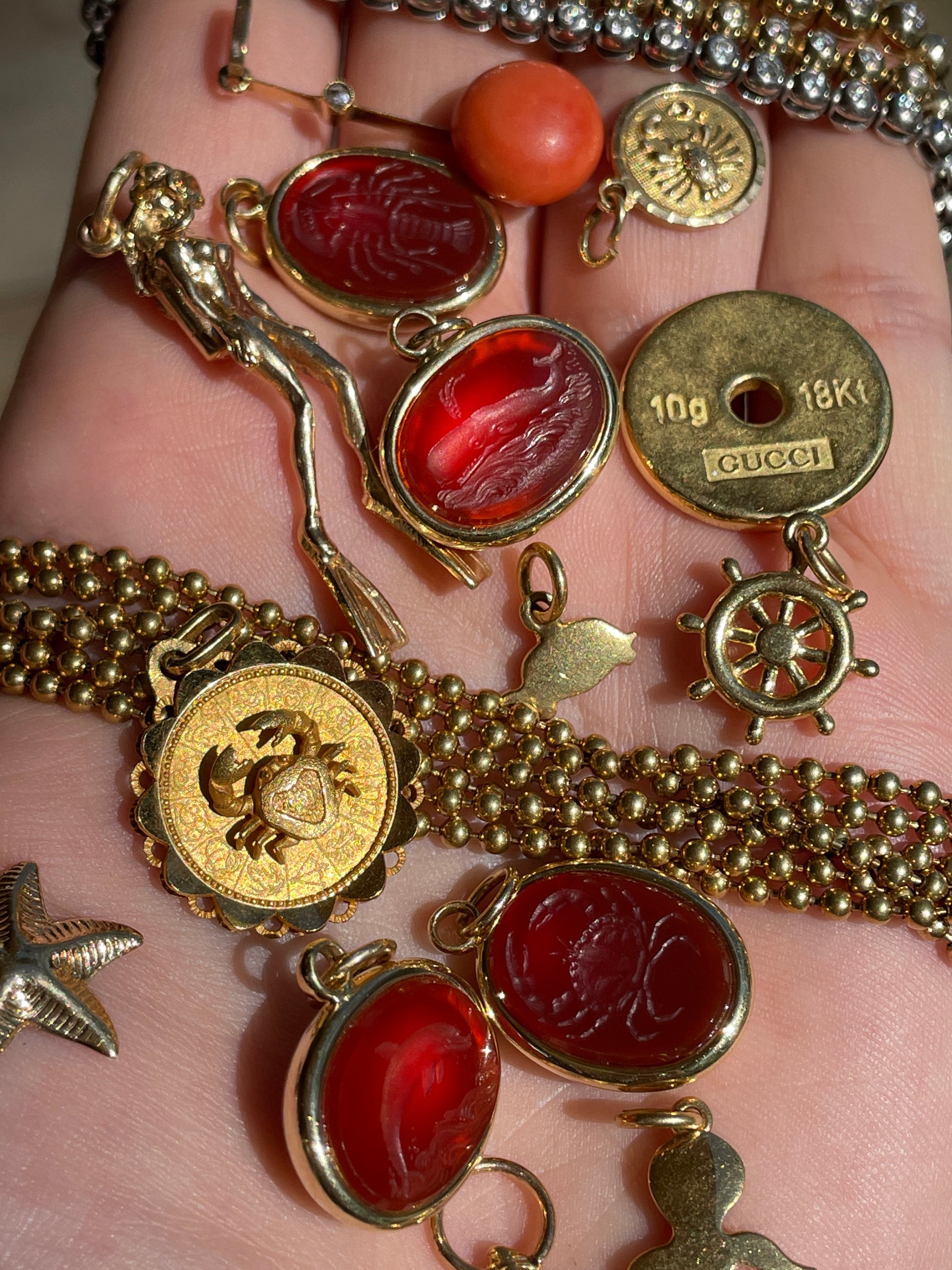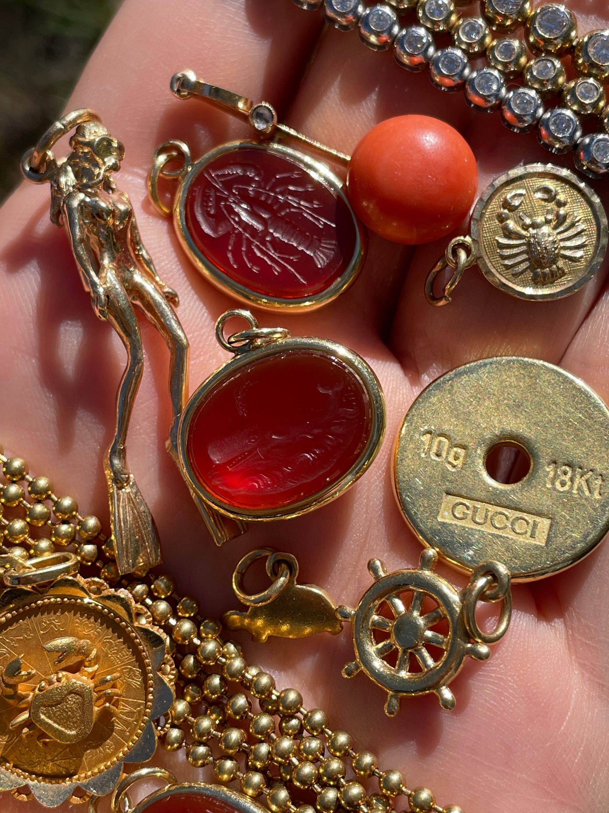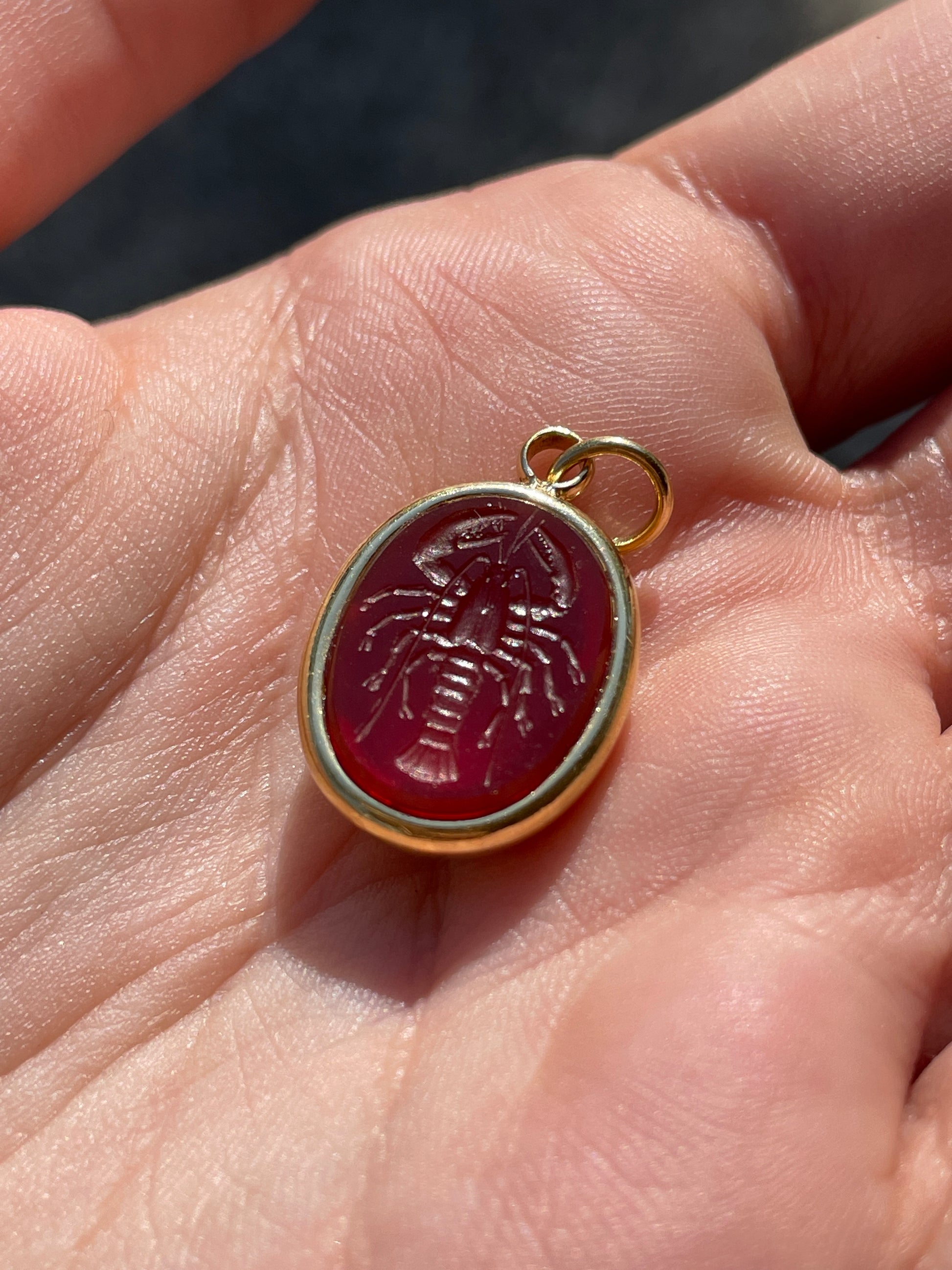 These Vintage yellow 18K carnelian aquatic animal pebble pendants are fabulous examples of intricate stone carving, and they can be worn 2 different ways! Each is one of a kind. I just love the detailed hand carvings in each, depicting different aquatic animals, as well as the bubbly pebble shape. The carnelian stone is somewhat translucent so the color shifts with amount of light from brighter to darker red. They are sold separately. In very good preowned vintage condition.