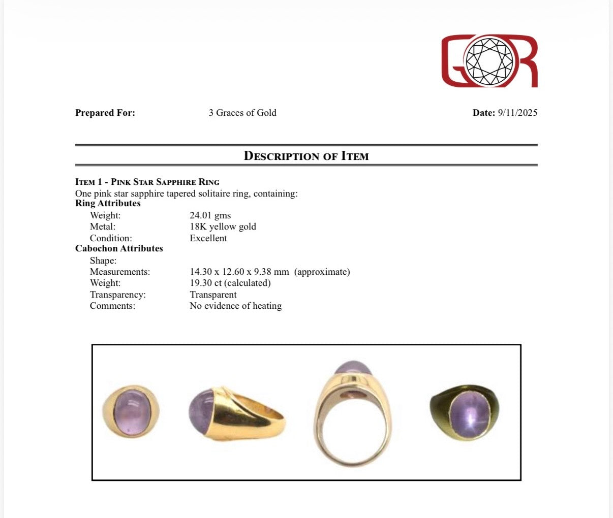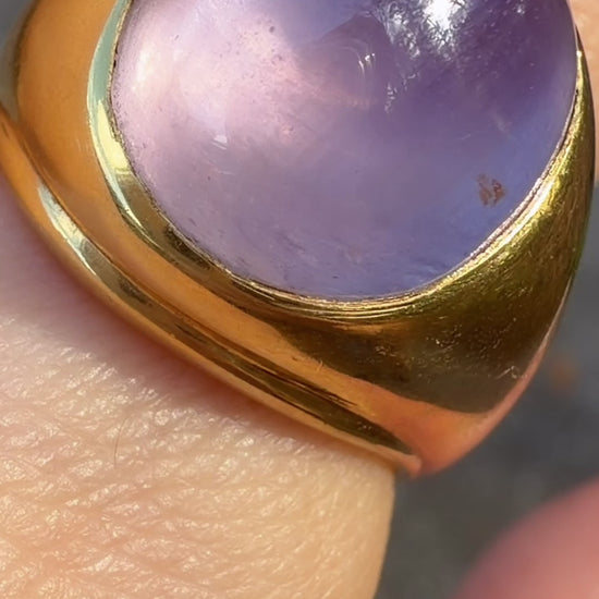 An absolutely stunning and ethereal Vintage yellow 18K natural unheated 19.3 ctw purple pink sapphire cabochon flush set ring, size 8.5 sizable. Comes with recent gemological assessment and appraisal. Ring is in excellent preowned condition, set with an extremely glowy natural unheated purple pink 19.3ctw cabochon measuring 14.3 x 12.6 x 9.4 mm approx with no evidence of heating with visible silky threads and no visible wear. Mesmerizing in any light with a spectrum of lavender purple to more pink-purple depending on lighting conditions.