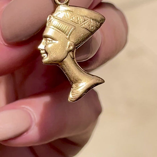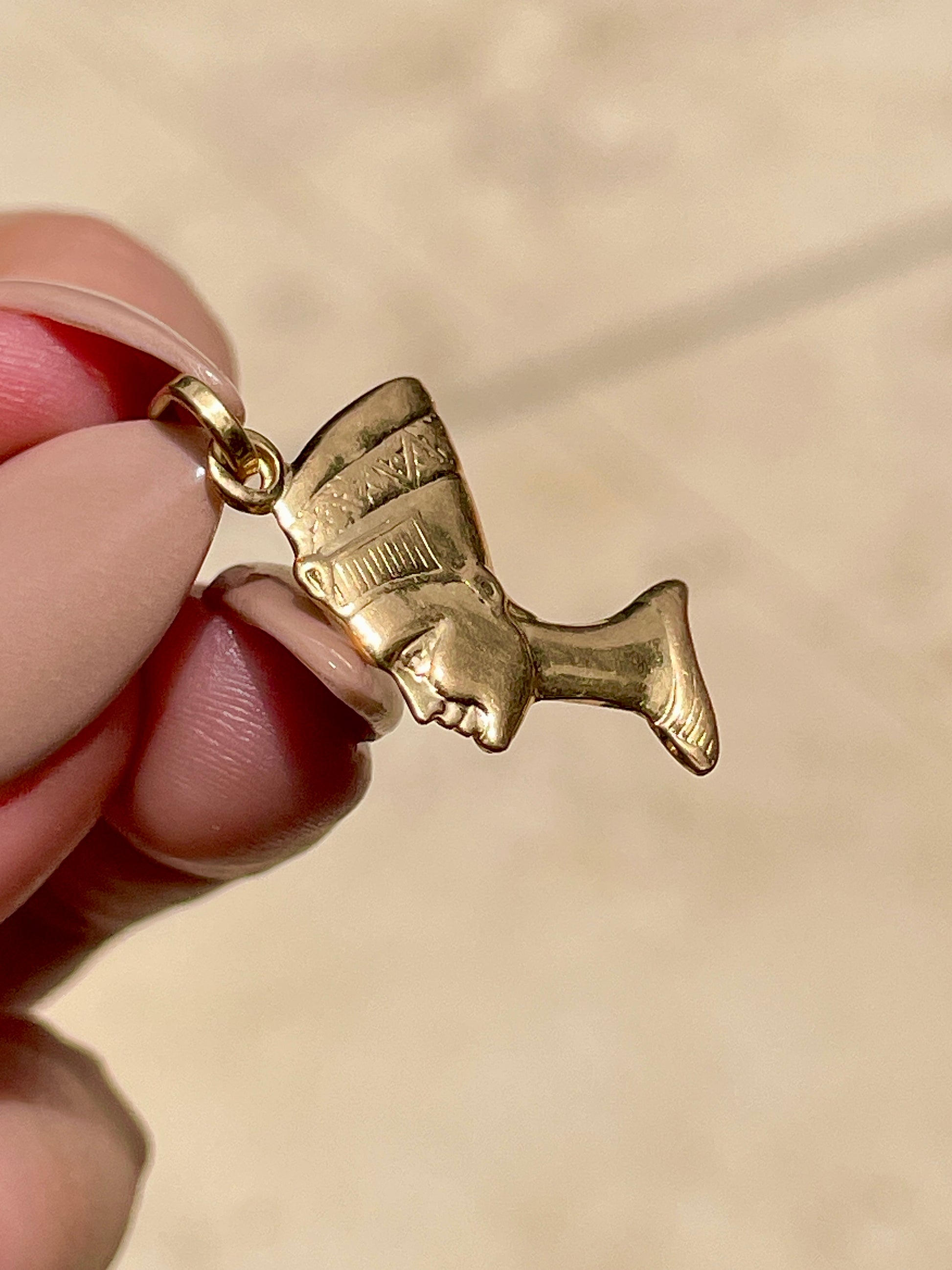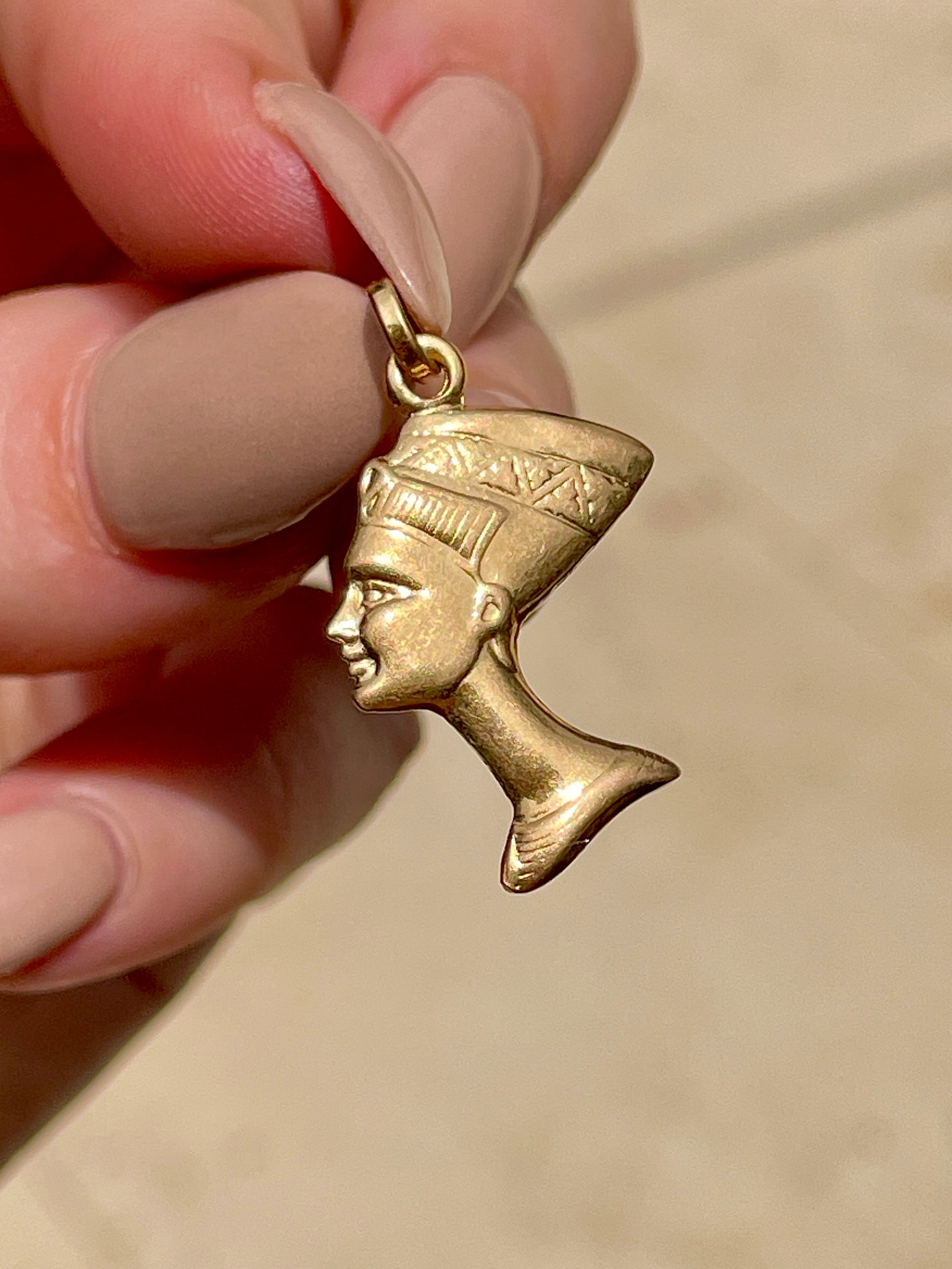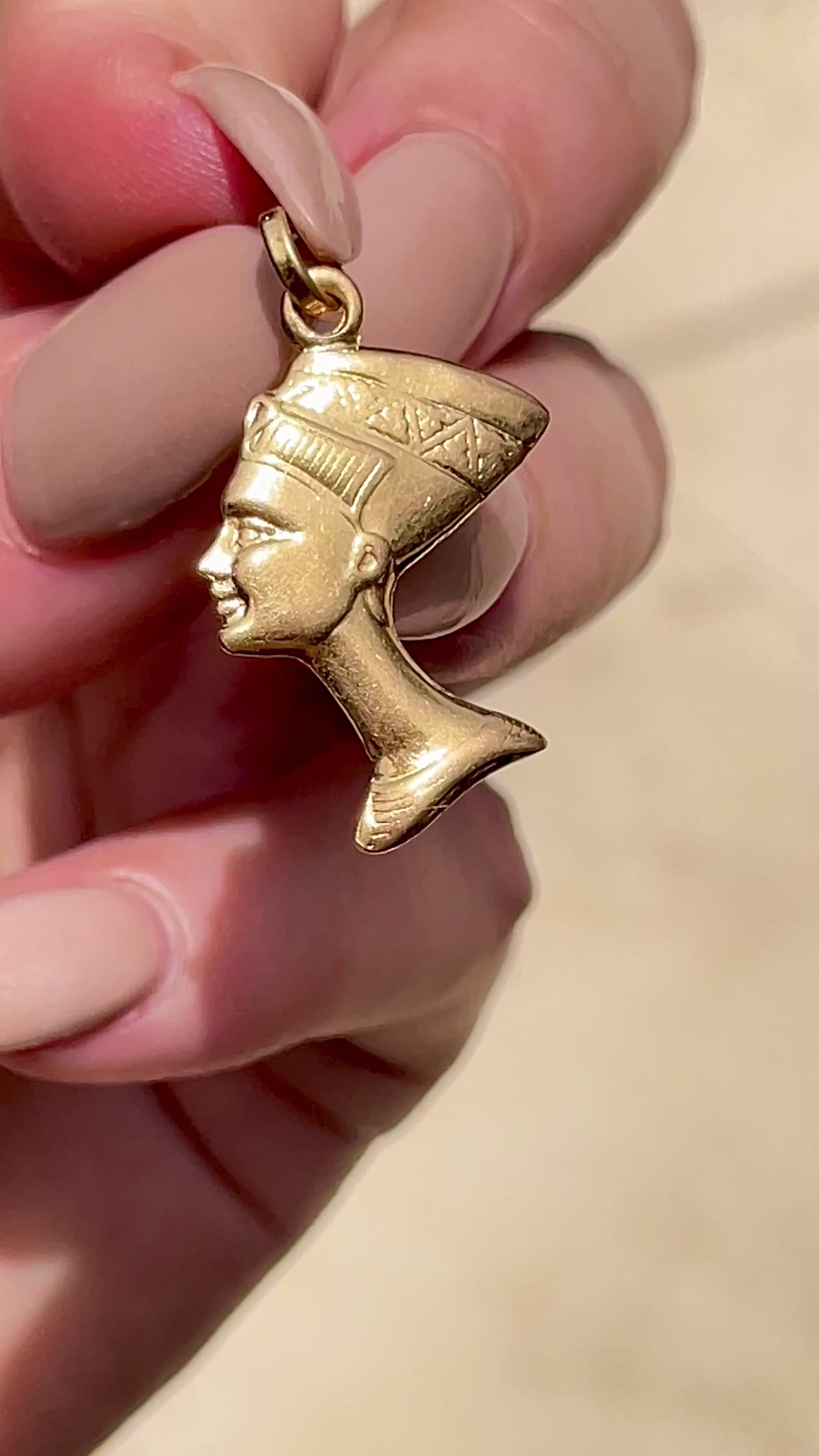 A pretty Vintage yellow 18K Nefertiti charm. Really like the shape and dimension of this one. Measures 31.8 mm long x 17.2 mm wide. Hallmarked 750 for 18K gold. Weighs 2.8 grams. Very good preowned condition.