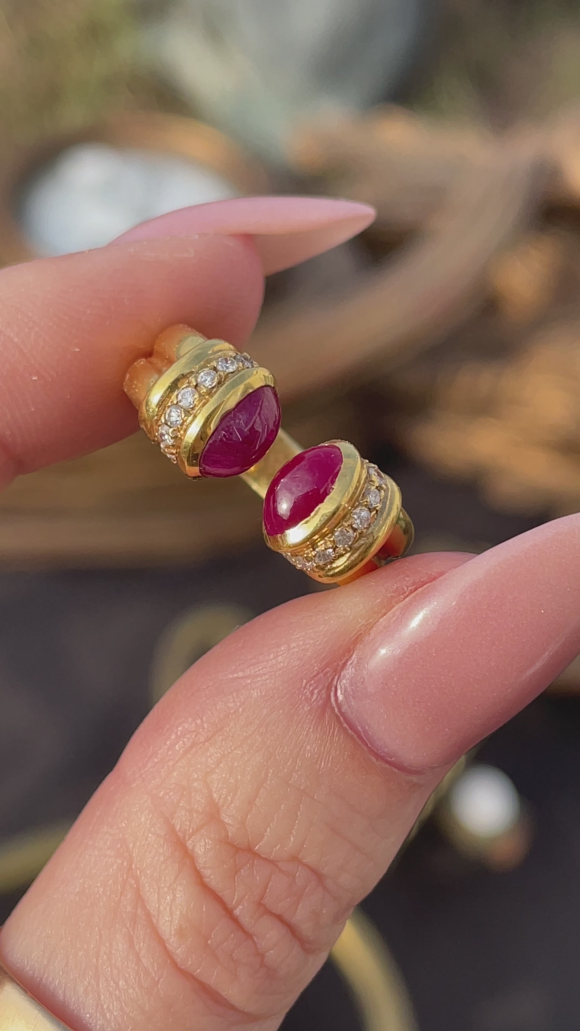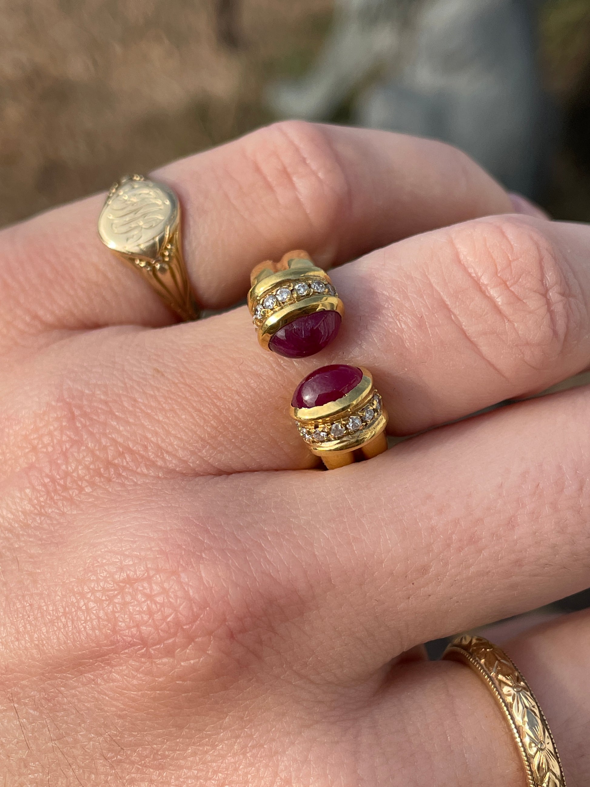 Love this style! So flattering on the hand and such a good look. Vintage 18K ruby open cabochon ring with .1 ctw of small diamonds punctuating the ends, size 5.5-5.75. Sizable. One ruby cabochon has a small chip under magnification. Both stones are super rich and saturated in color, and the 18K gold is very buttery in hue. Ring measures 8.2 mm widest. Weighs 7 grams. In very good preowned vintage condition.