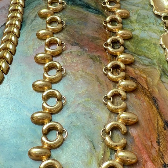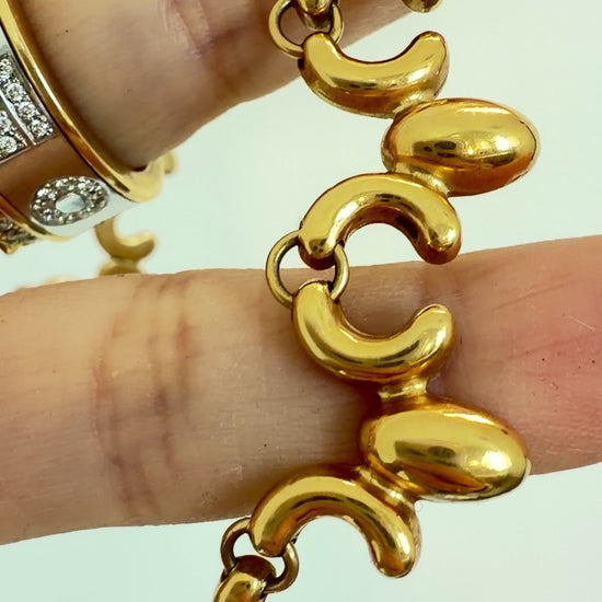 A stunning and unique Vintage yellow 18K ornate articulated chain, 17.25 inch, with an organic rounded petal design reminiscent of Native American squash blossom necklaces. A very expressive voluminous link that is nicely articulated to drap along the chest and collarbone. Measures 13.6 mm widest with bolt clasp. Weighs 29.7 grams. Very well made piece in very good preowned condition, no meaningful dents.