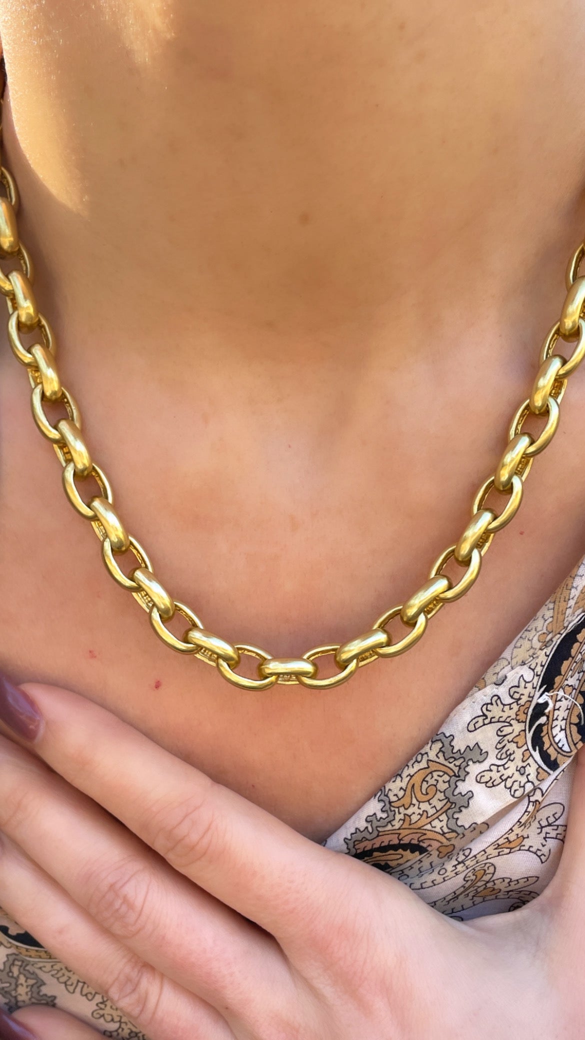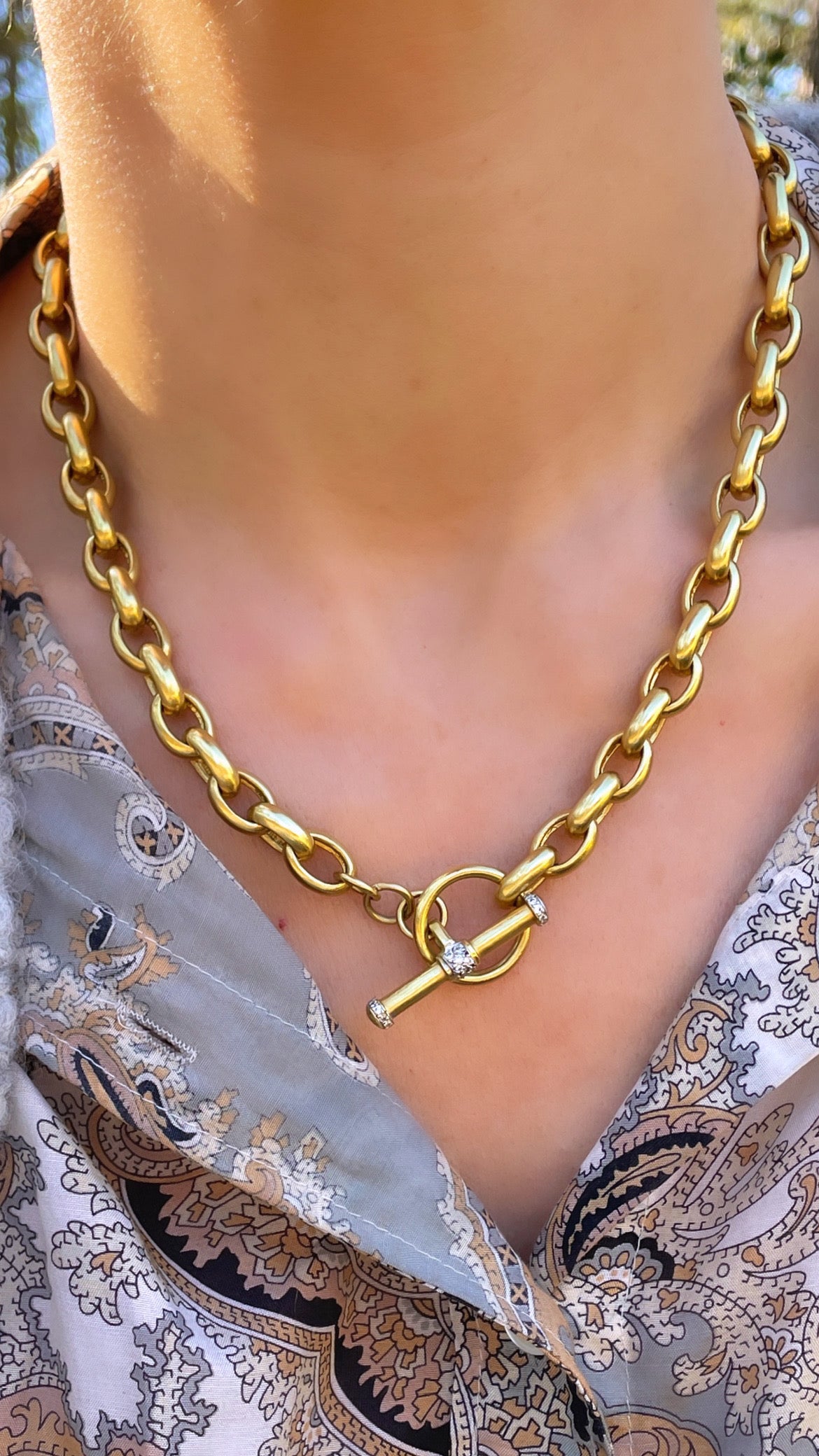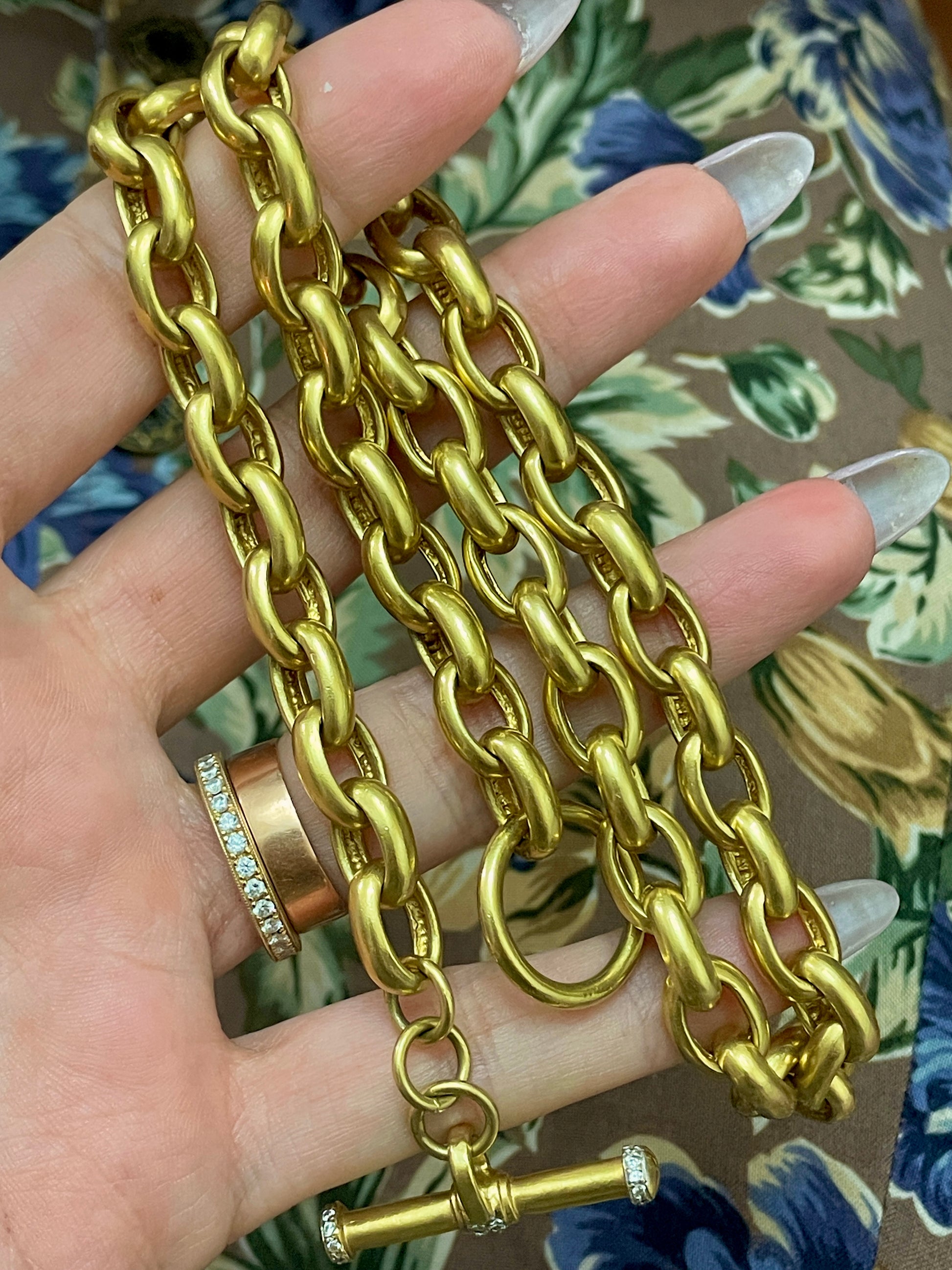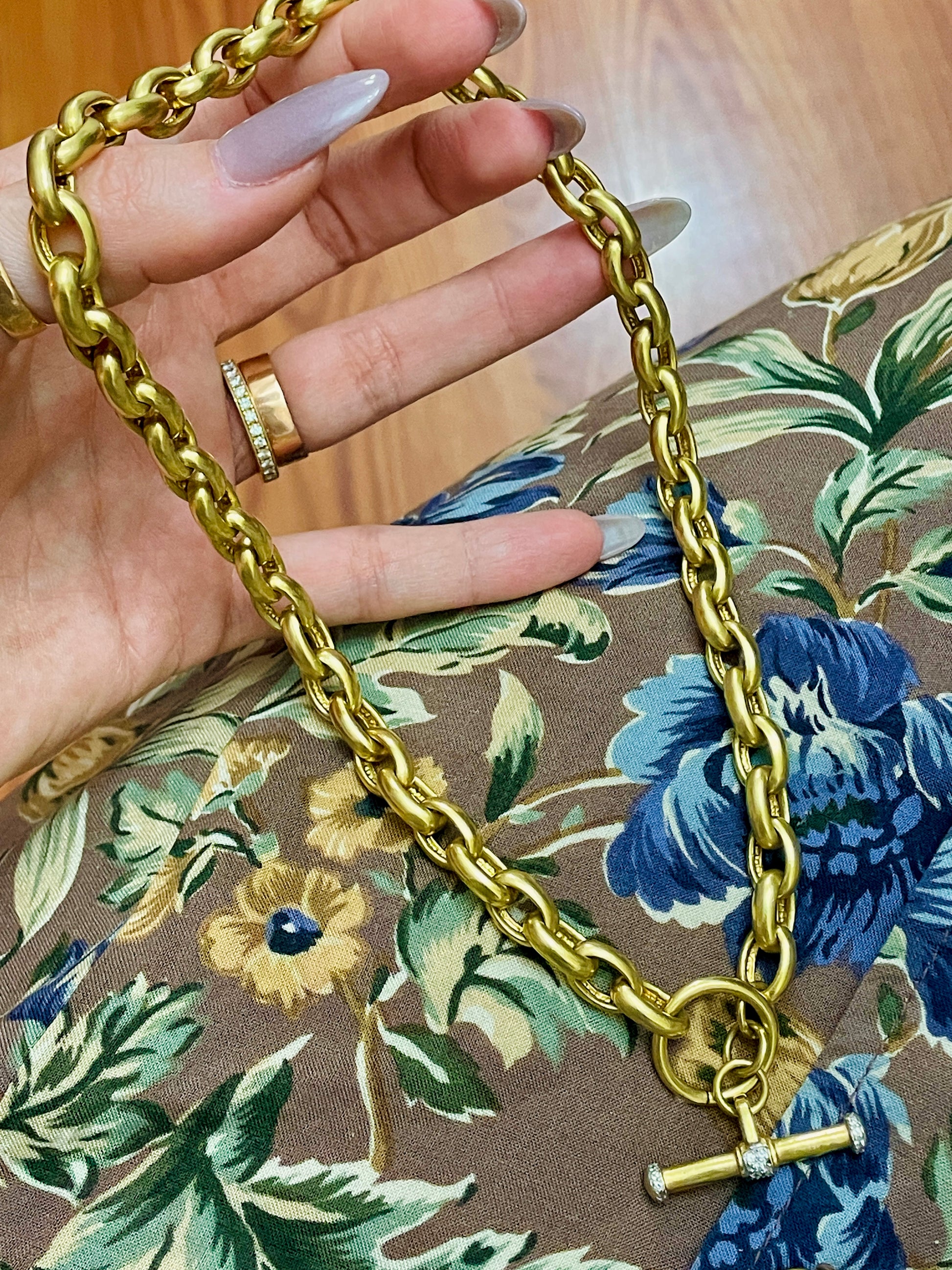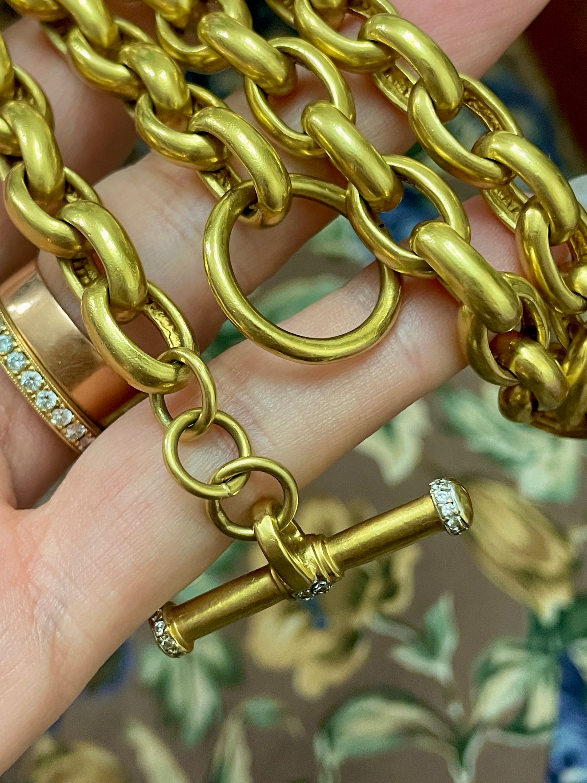 A fantastic solid construction oval link rich yellow 18K gold toggle clasp chain with approx .2 ctw of diamonds that can be worn so many beautiful ways! Adore the bold yet classic look of this buttery 18K chain with truly rounded links that drapes so well. Finish is very glowy on the links. Approx .2 ctw diamonds set in the toggle bar. Measures 9.1mm wide, and weighs a heavy and comforting 116.8 grams. In very good preowned condition.