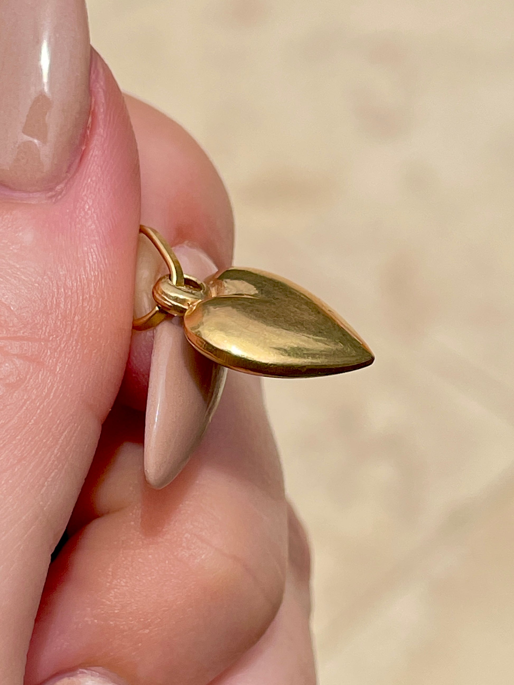 A classic polished Vintage yellow 18K heart charm. Really buttery in color. Either very thickly constructed or totally solid construction. Measures 22.9 mm long x 13.5 mm wide. Hallmarked 750 for 18K gold. Weighs 2 grams. Very good preowned condition.