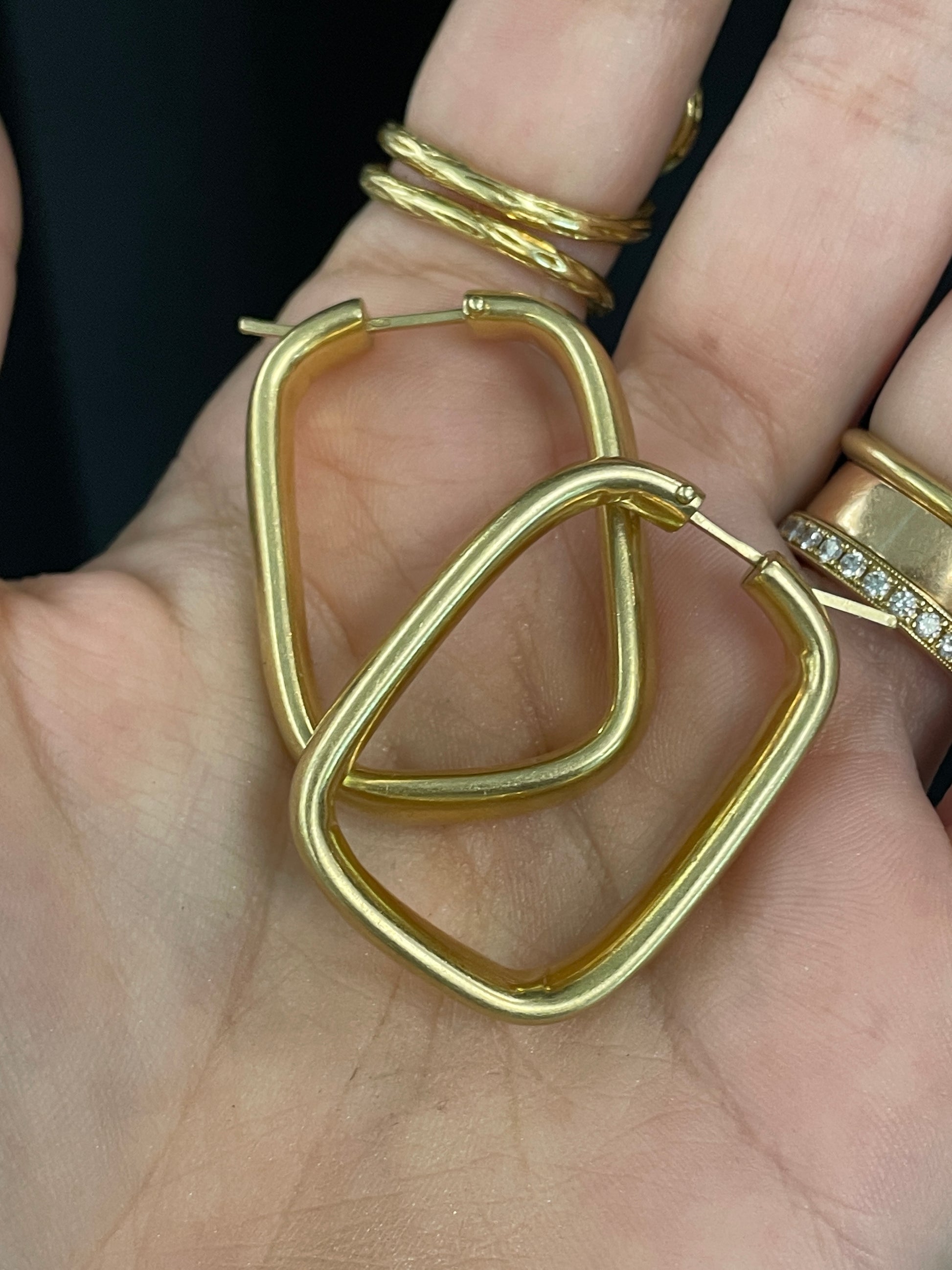 A pair of Vintage yellow 19K matte finish post hoops, .4 inch diameter and 3.9 mm wide. Weigh 3.3 grams combined. In very good preowned condition.