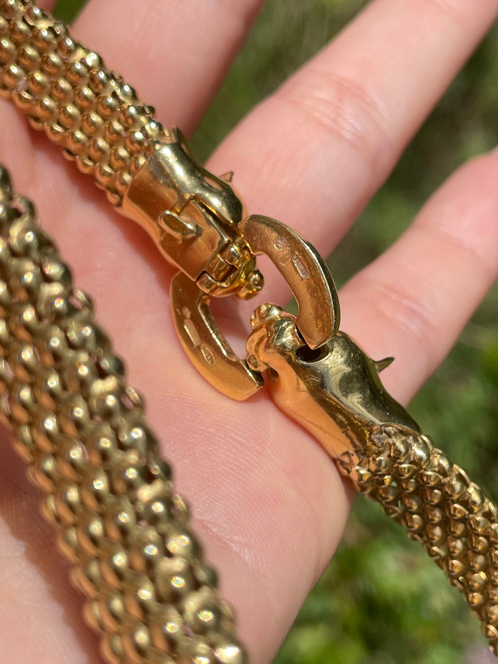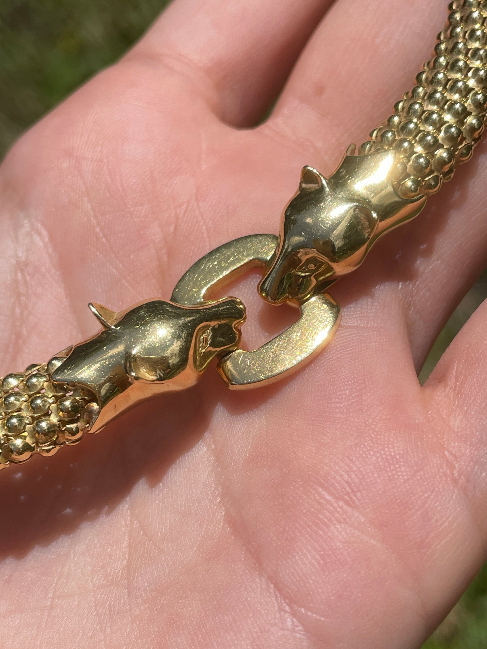 Vintage yellow 18K Riccardo Masella designer Panther clasp bead link collar necklace, 16 inch