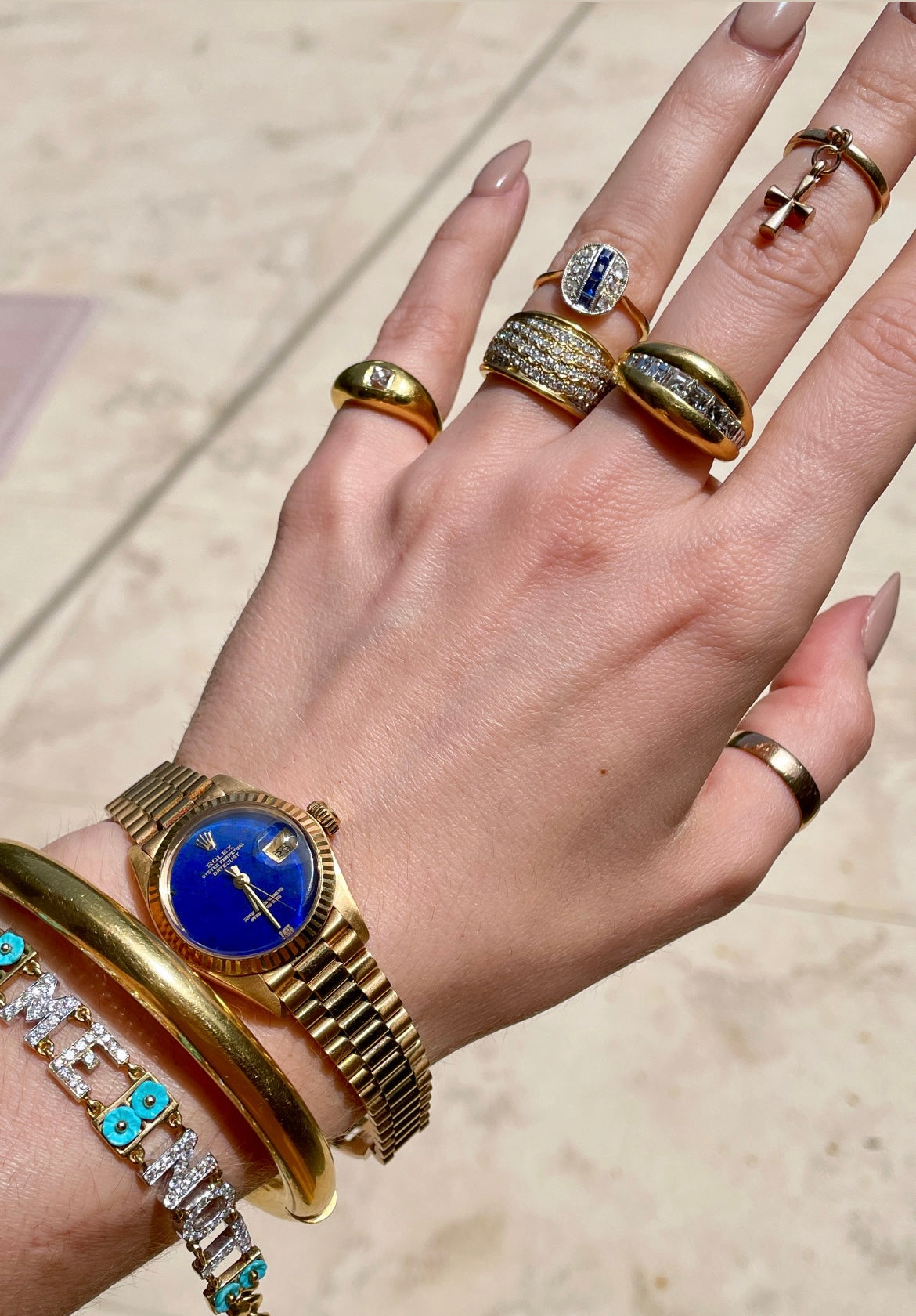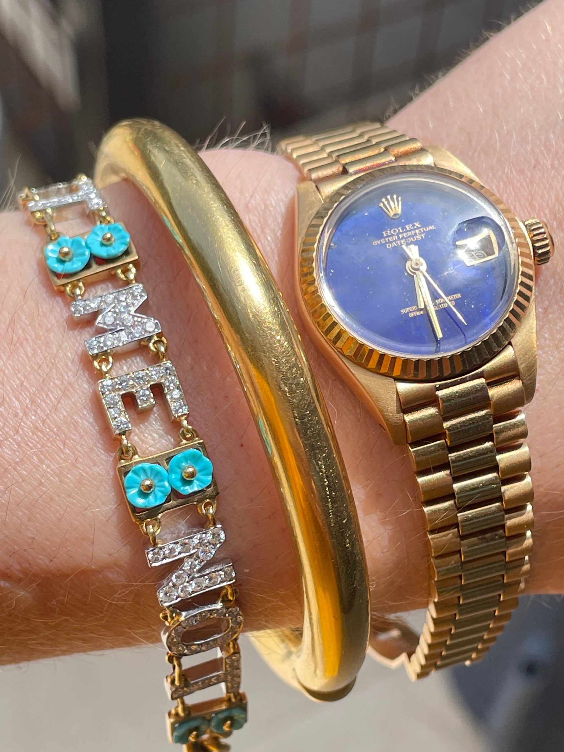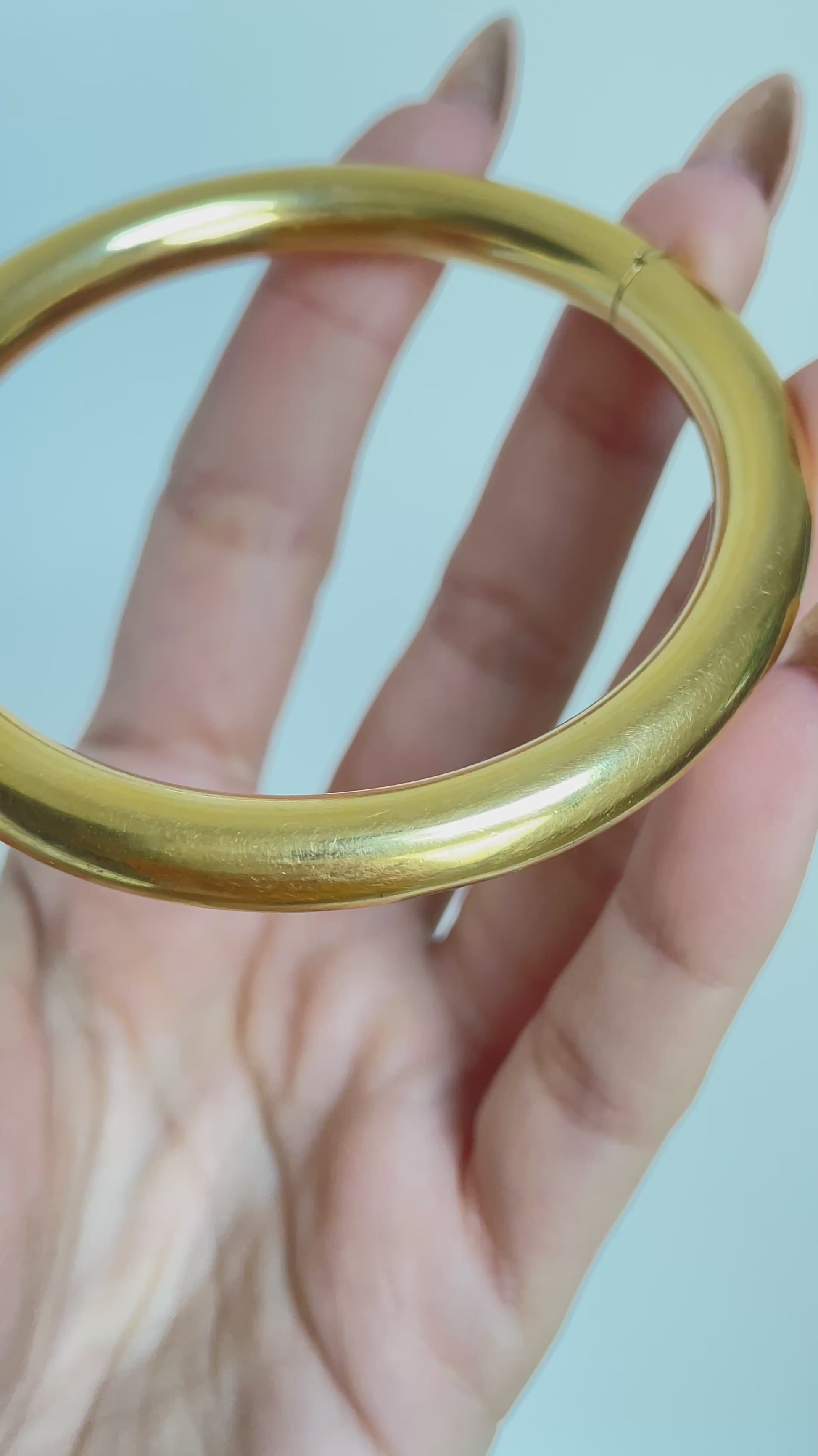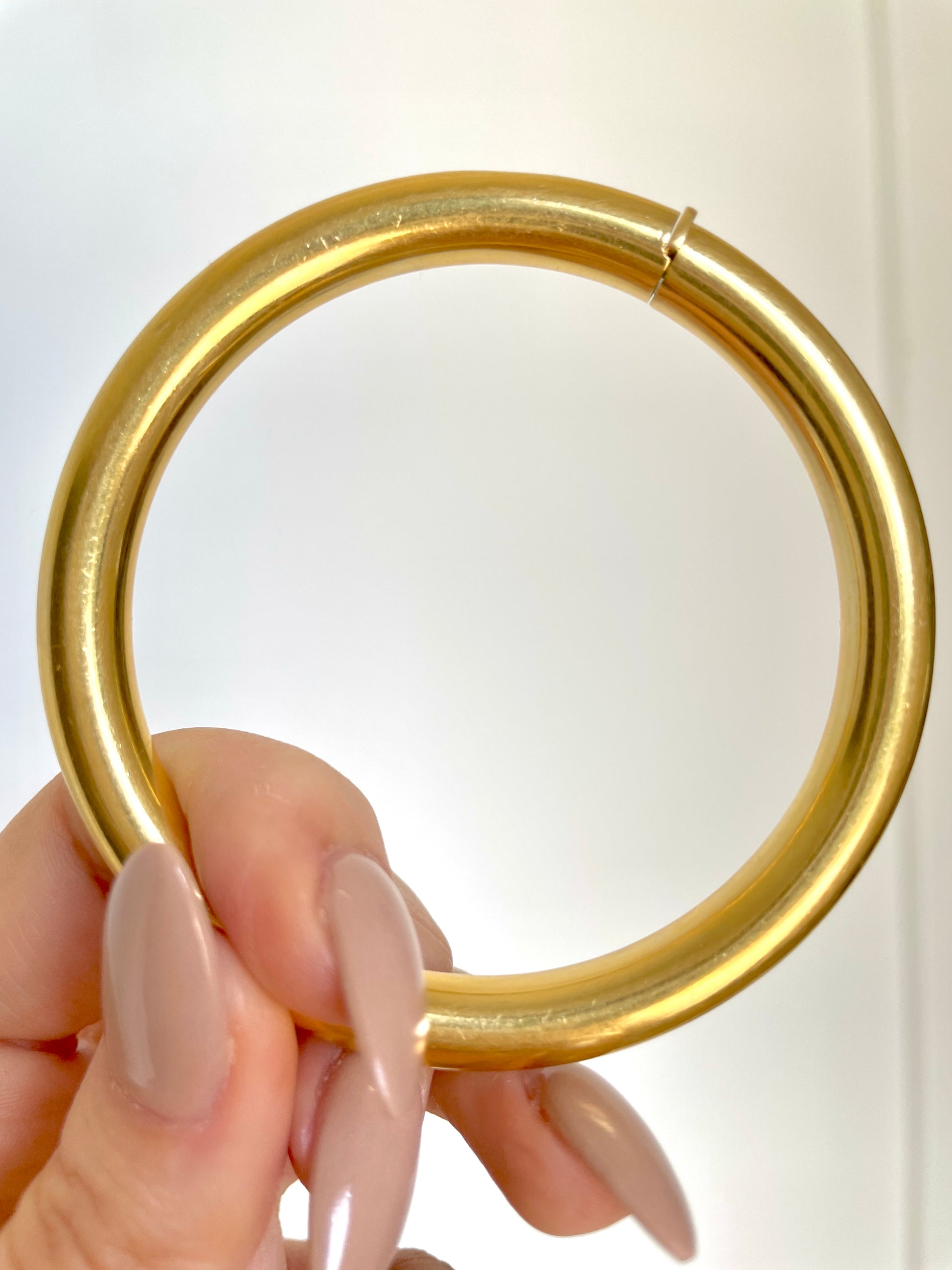 Super chic Vintage yellow 18K round hinge bangle. Best I’ve found in this style and I absolutely love it. Interior measurement is 2.3 by 2.3 inch, equating to 7.2 inch. Width is 7.5 mm. Super nicely made with minimal wear for age. Clasp is really streamlined with built in double latch safety. Weighs 34.4 grams. AR 662 mark for Italian maker and 750 for 18K gold. Hallmarked.