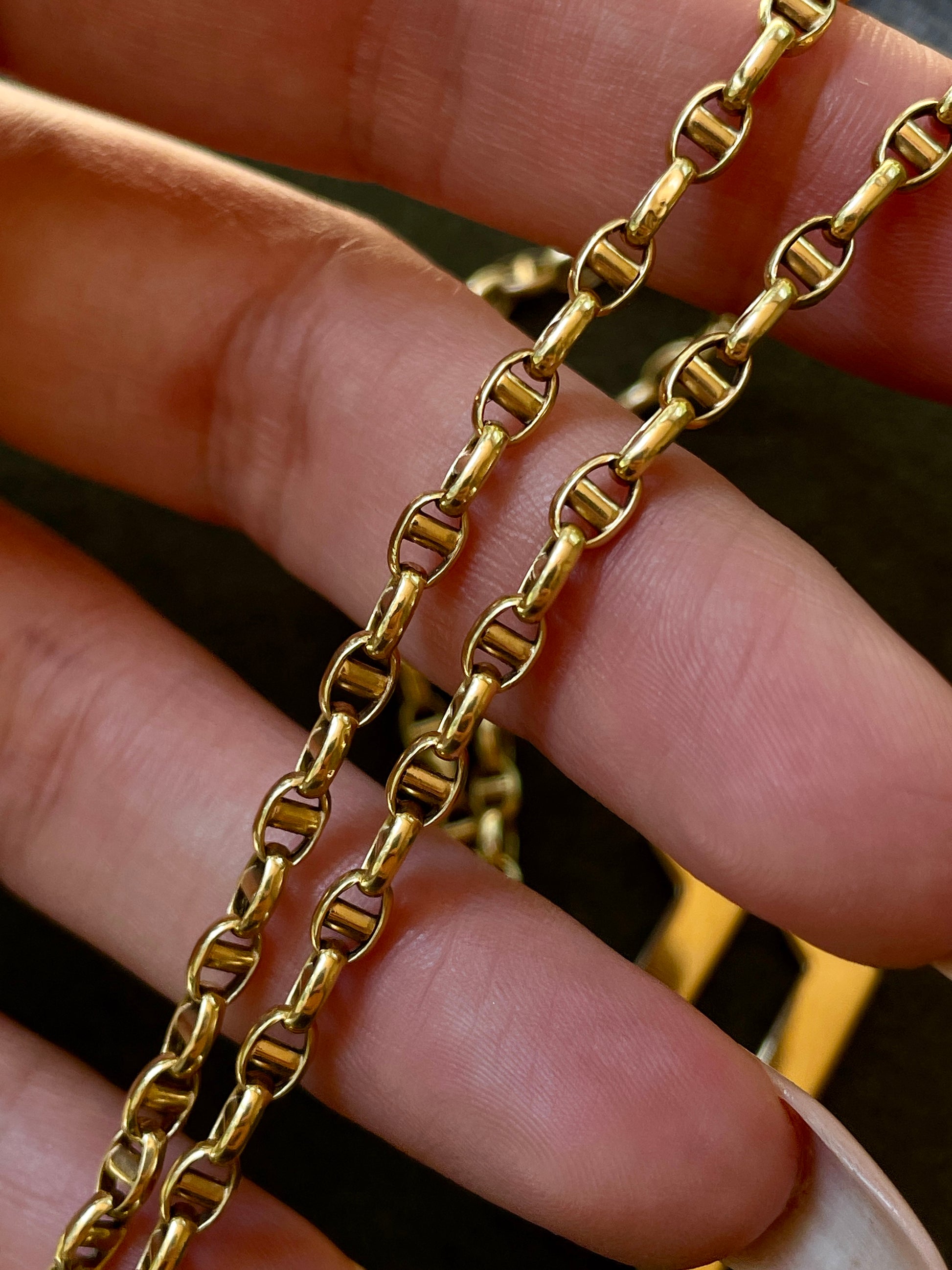 Great one! Vintage yellow 18K round mariner chain, 20.5 inch. A semi hollow link that has a great scale and look solo or with charms. Measures 3.5 mm wide. Weighs 7.7 grams. In good preowned vintage condition with some very minor (hard to find) dents closer to the clasp.