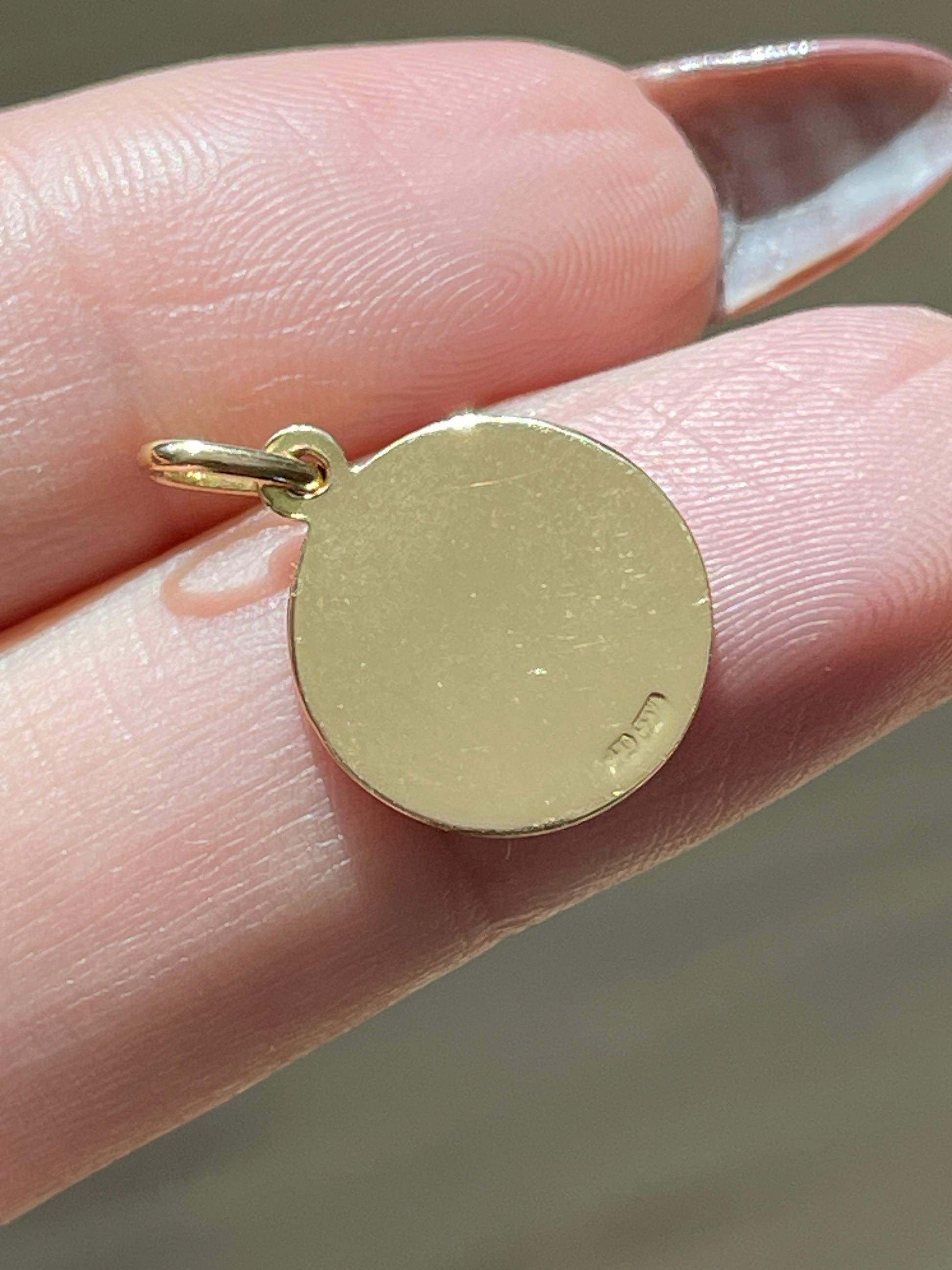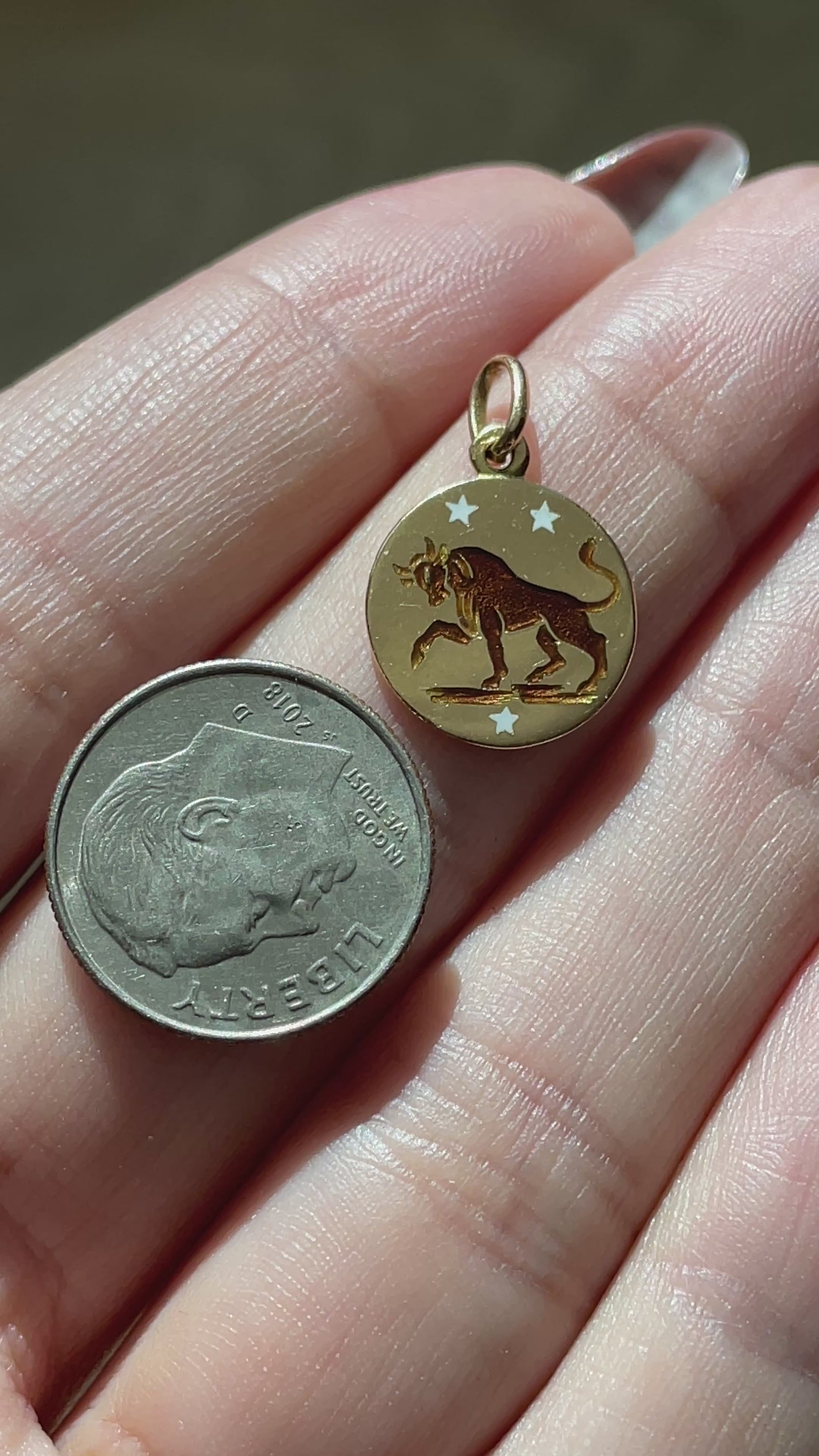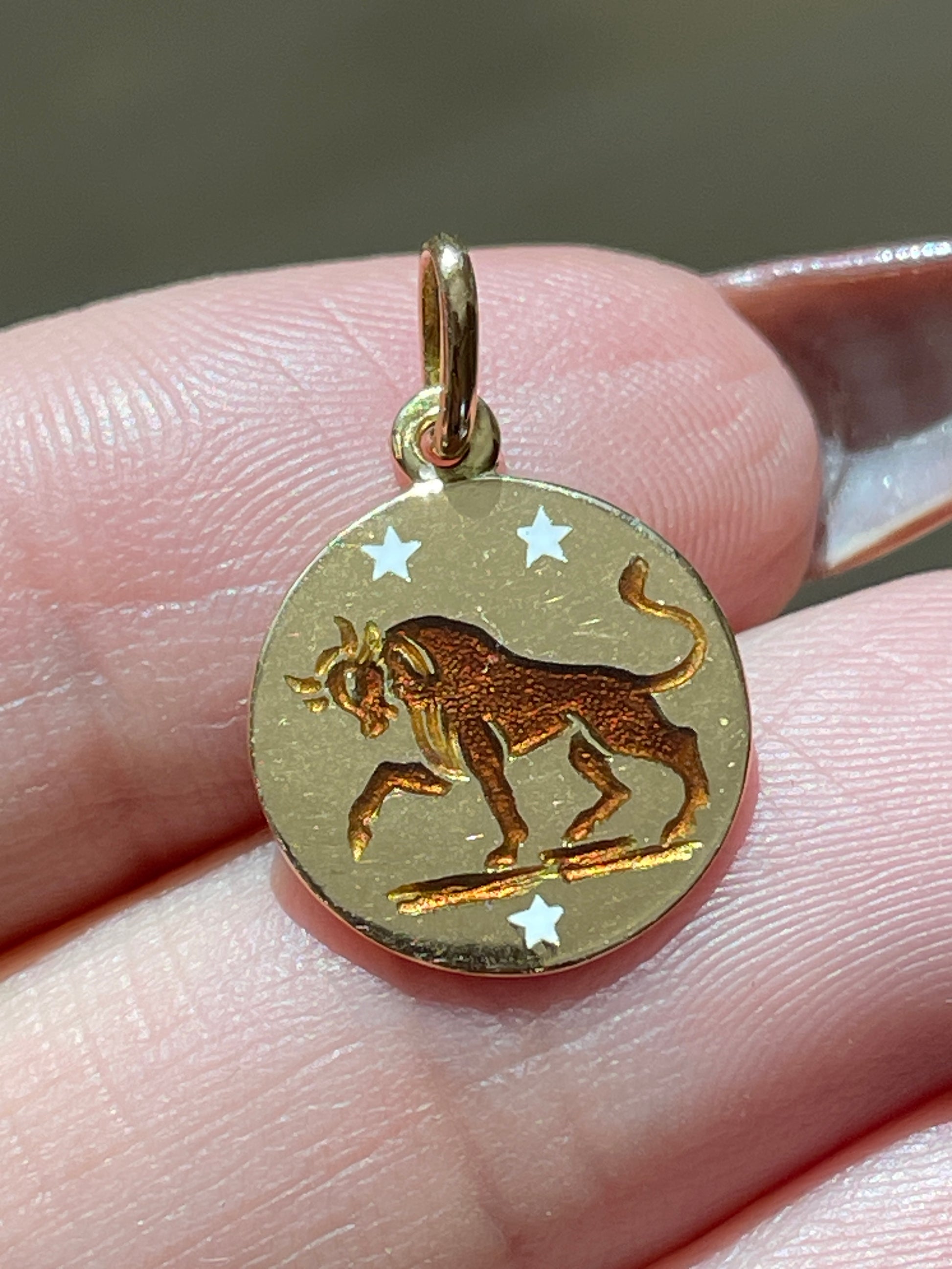 A detailed Vintage yellow 18K small enamel Taurus charm. Measures 19 mm long with bale and 13 mm across. Details in red and white enamel with 3 white stars. Weighs 1.6 grams. Small enamel wear and overall in very good preowned vintage condition. Hallmarked 750 for 18K and other hard to read marks.