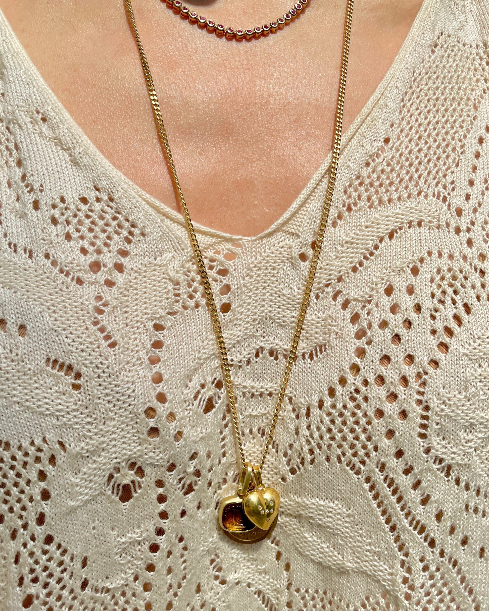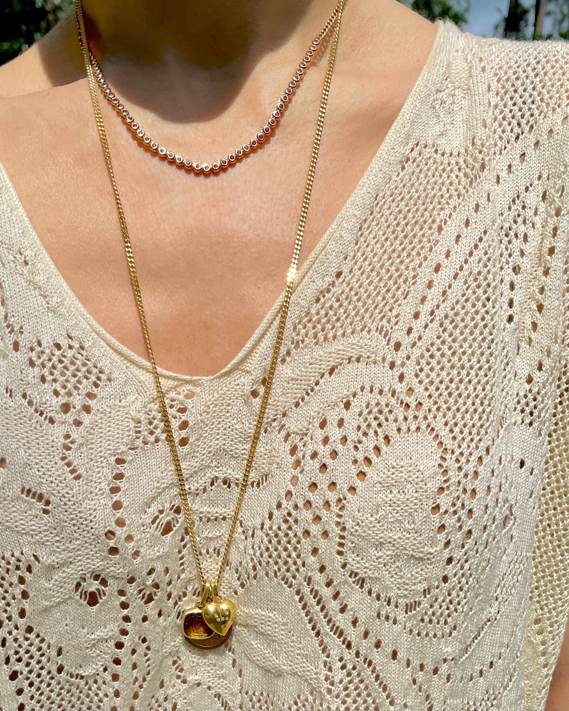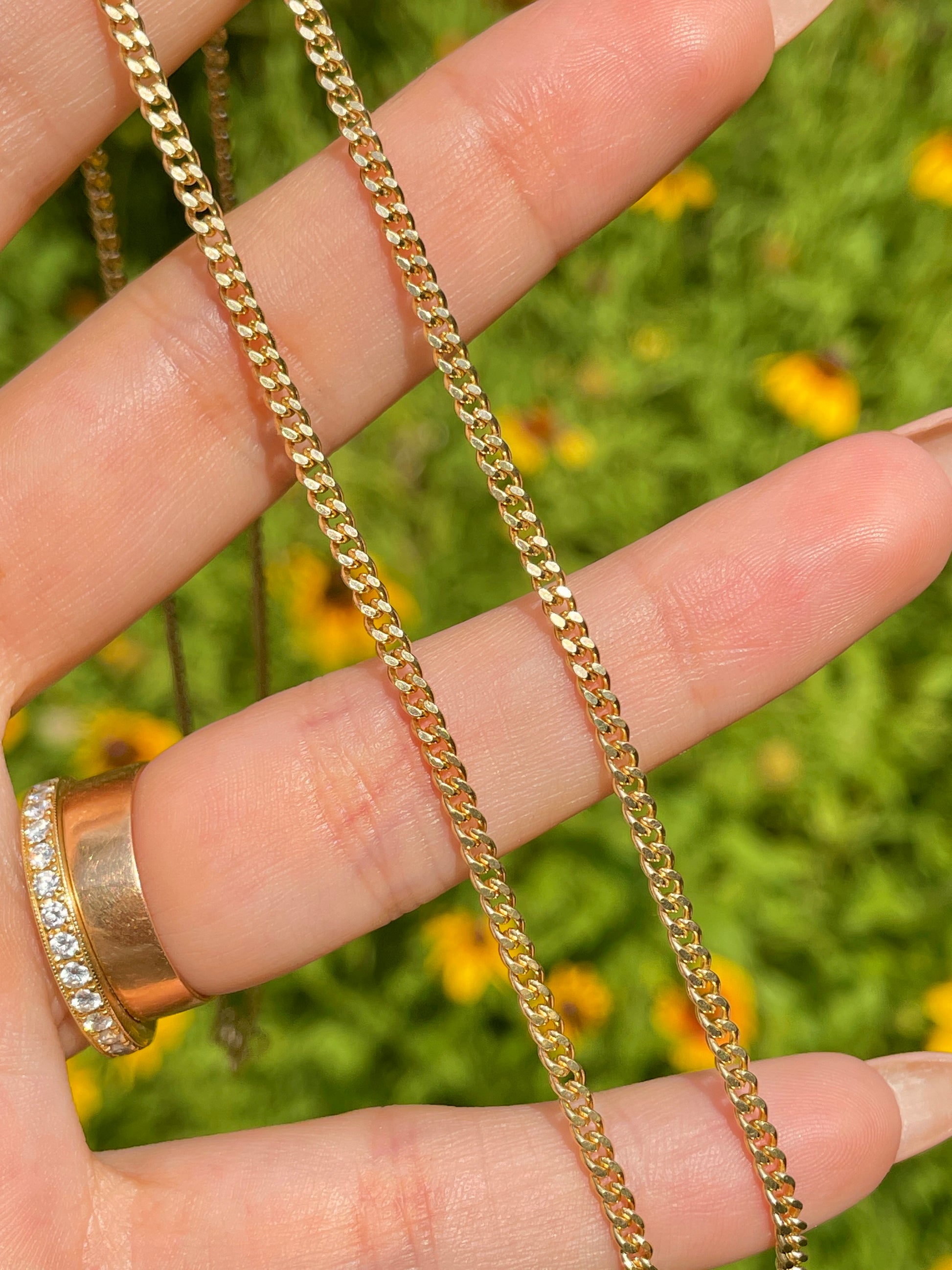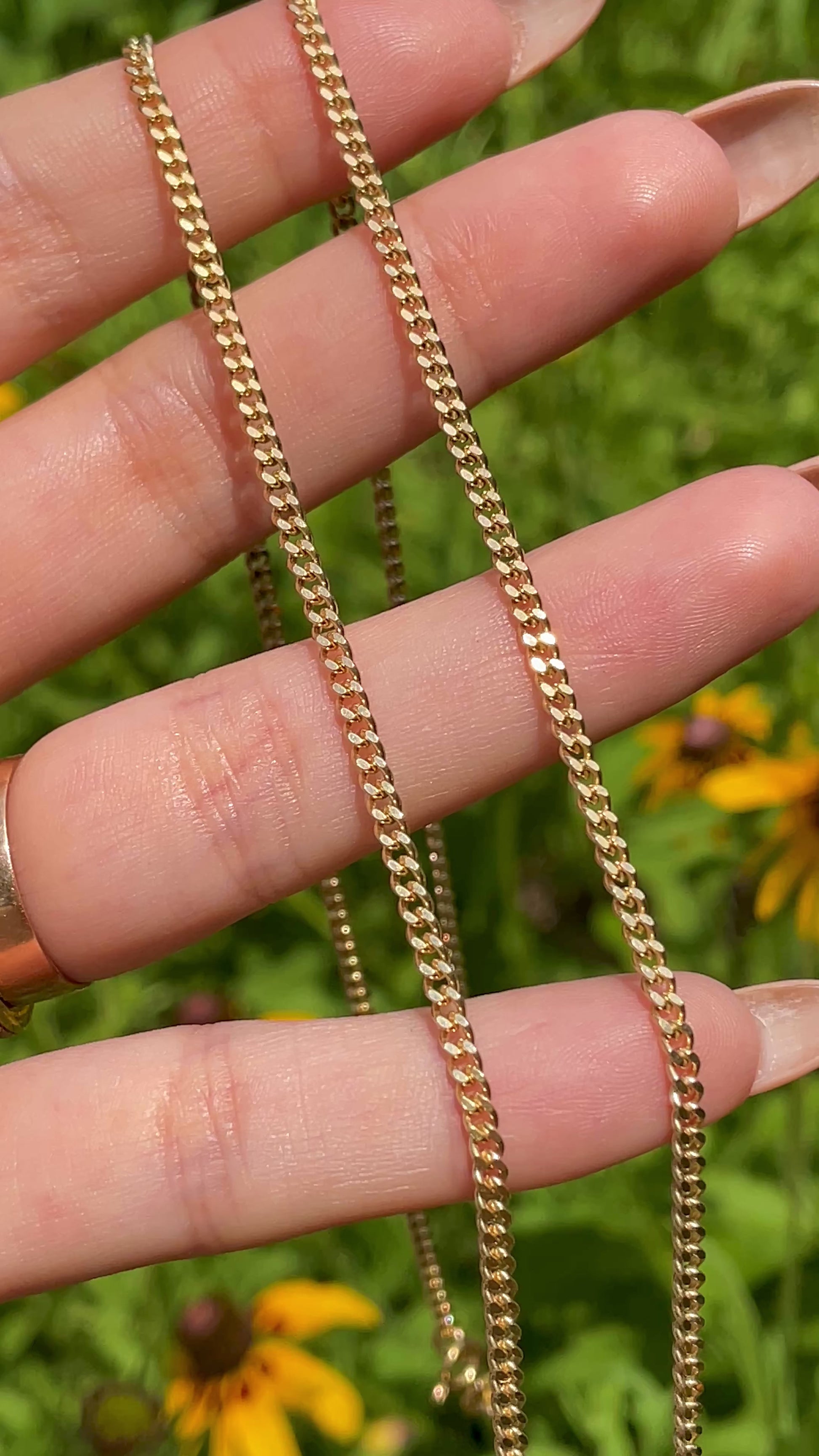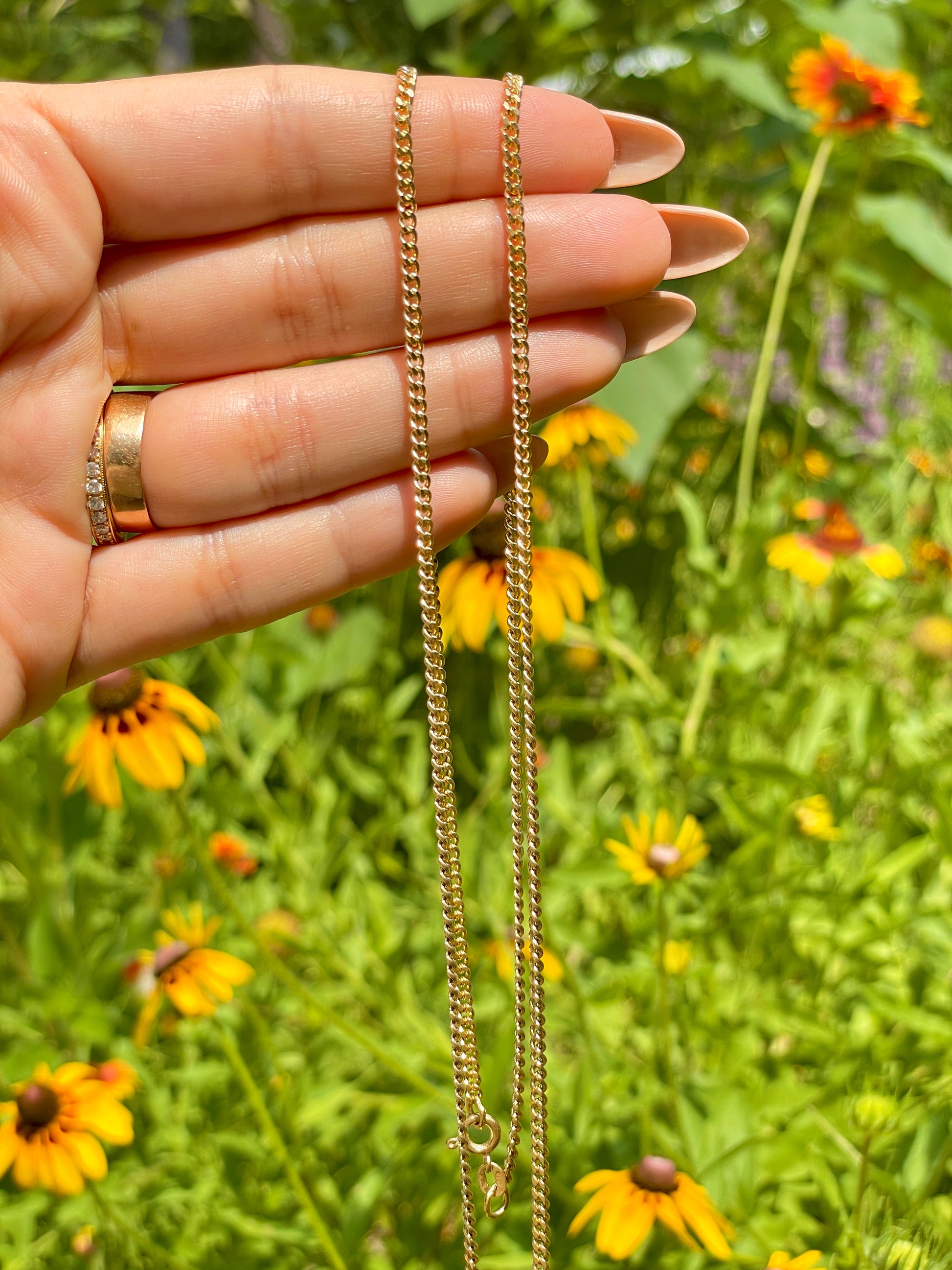 Another staple in a length that is SO flattering to wear long with gold charms! A Vintage yellow 18K solid curb link chain, 28.25 inch long. Yellow gold links are totally solid. Measures 2.5 mm wide. Weighs 15.7 grams, with secure C clasp. In very good preowned vintage condition.