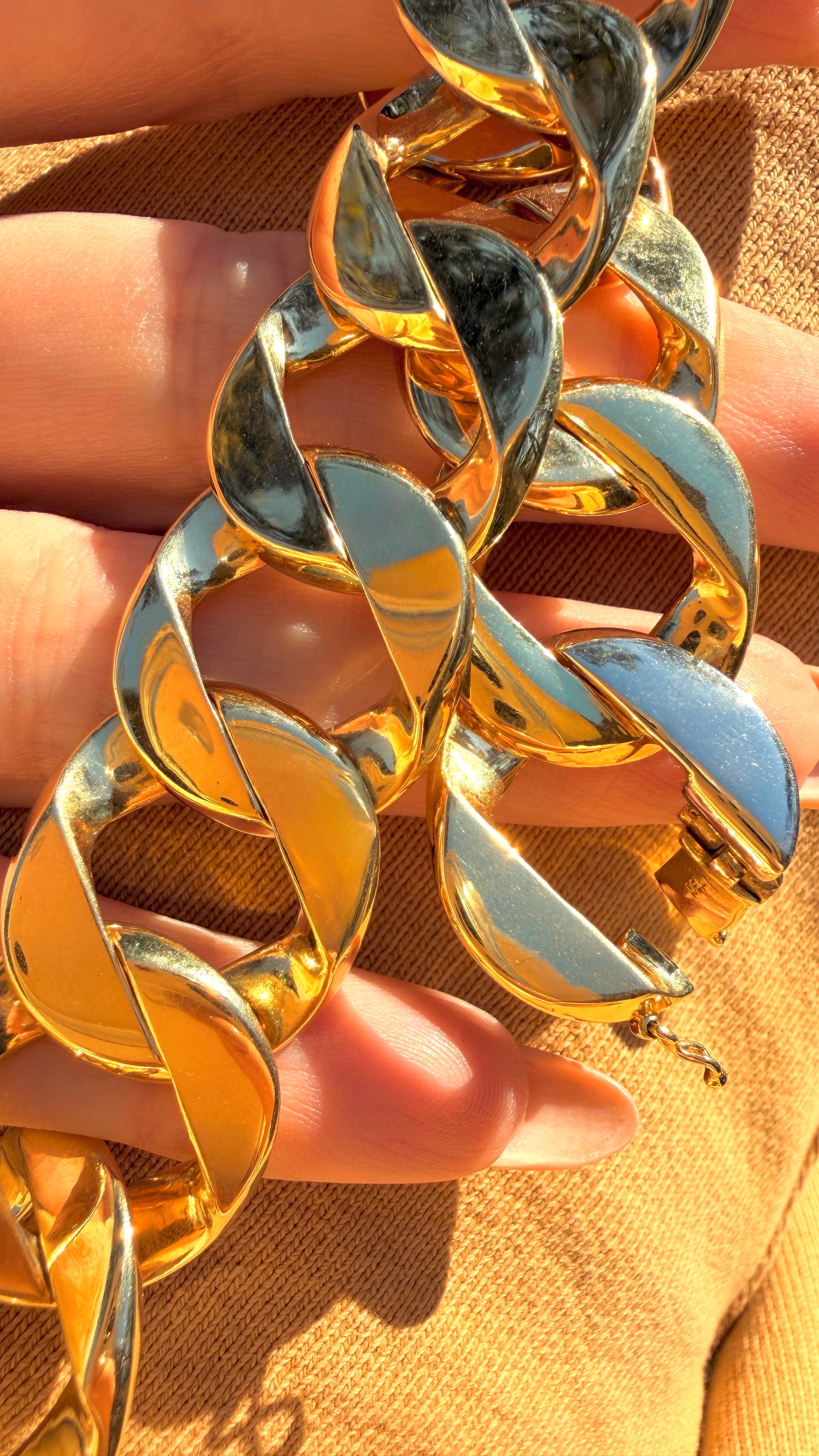 A gorgeous Vintage true yellow 18K gold totally solid wide curb bracelet with continuous clasp and safety, 8 inch (fits like 7.25 inch due to width). This is such an attractive link and very very similar to the Verdura “Garbo” curb worn by Greta Garbo (theirs is 20.3mm wide and retails for $36.5K, this one is almost identical at 19.9mm width). Amazing bold and totally solid heavy links, same on both sides. Sizable in 5/8 inch increments (will fit a little smaller). Weighs over 94.8 grams. Hallmarked 750.