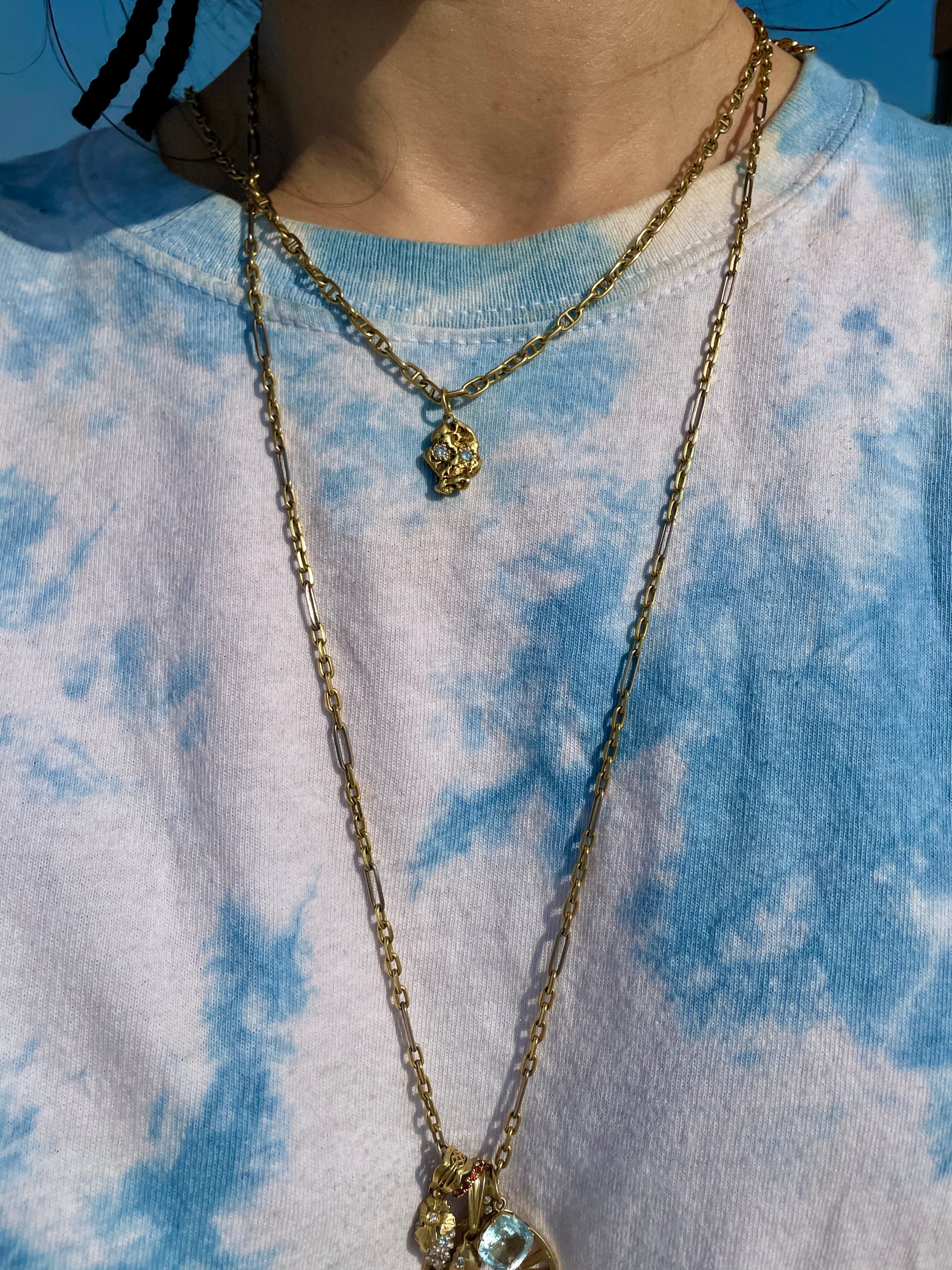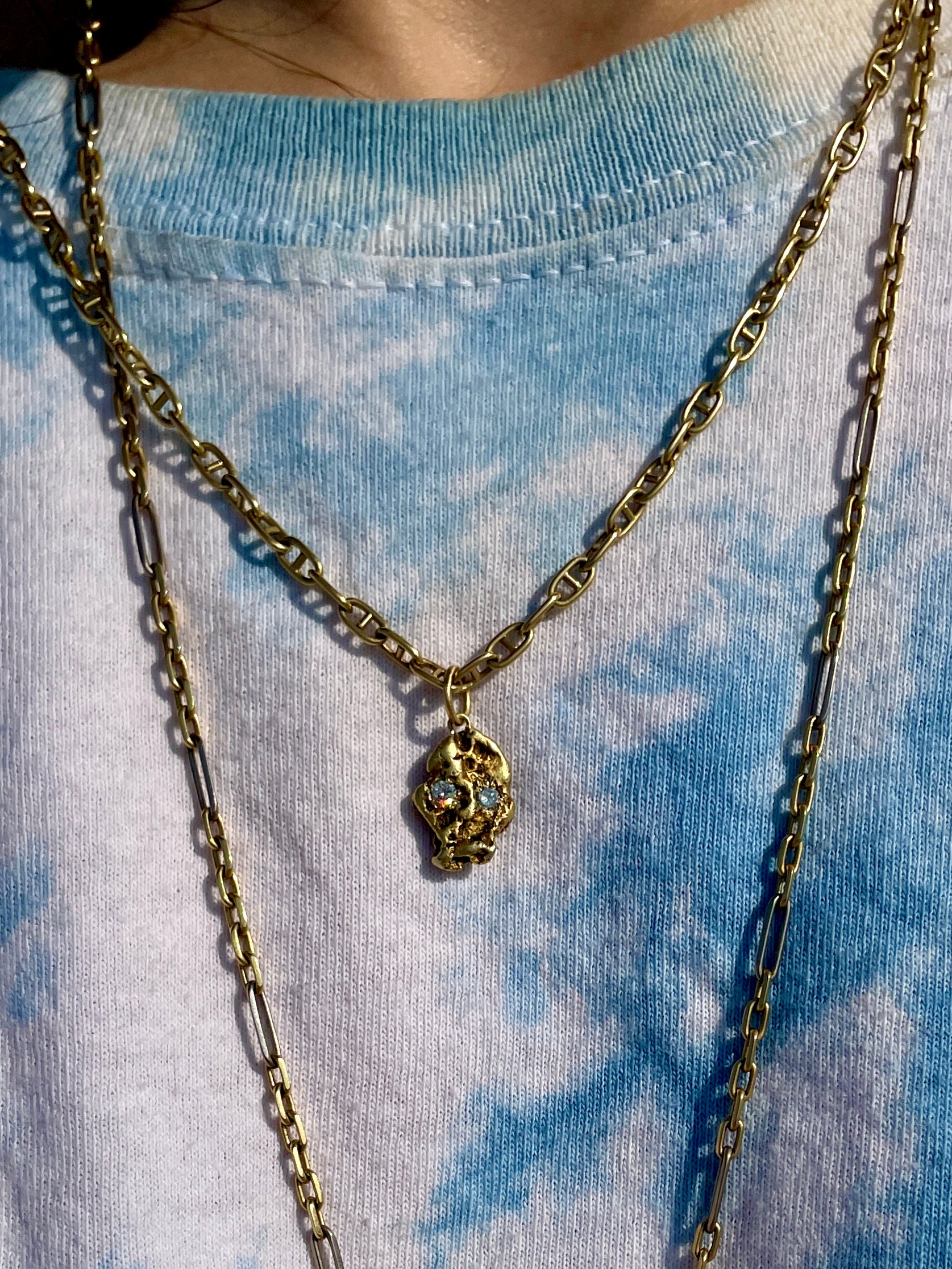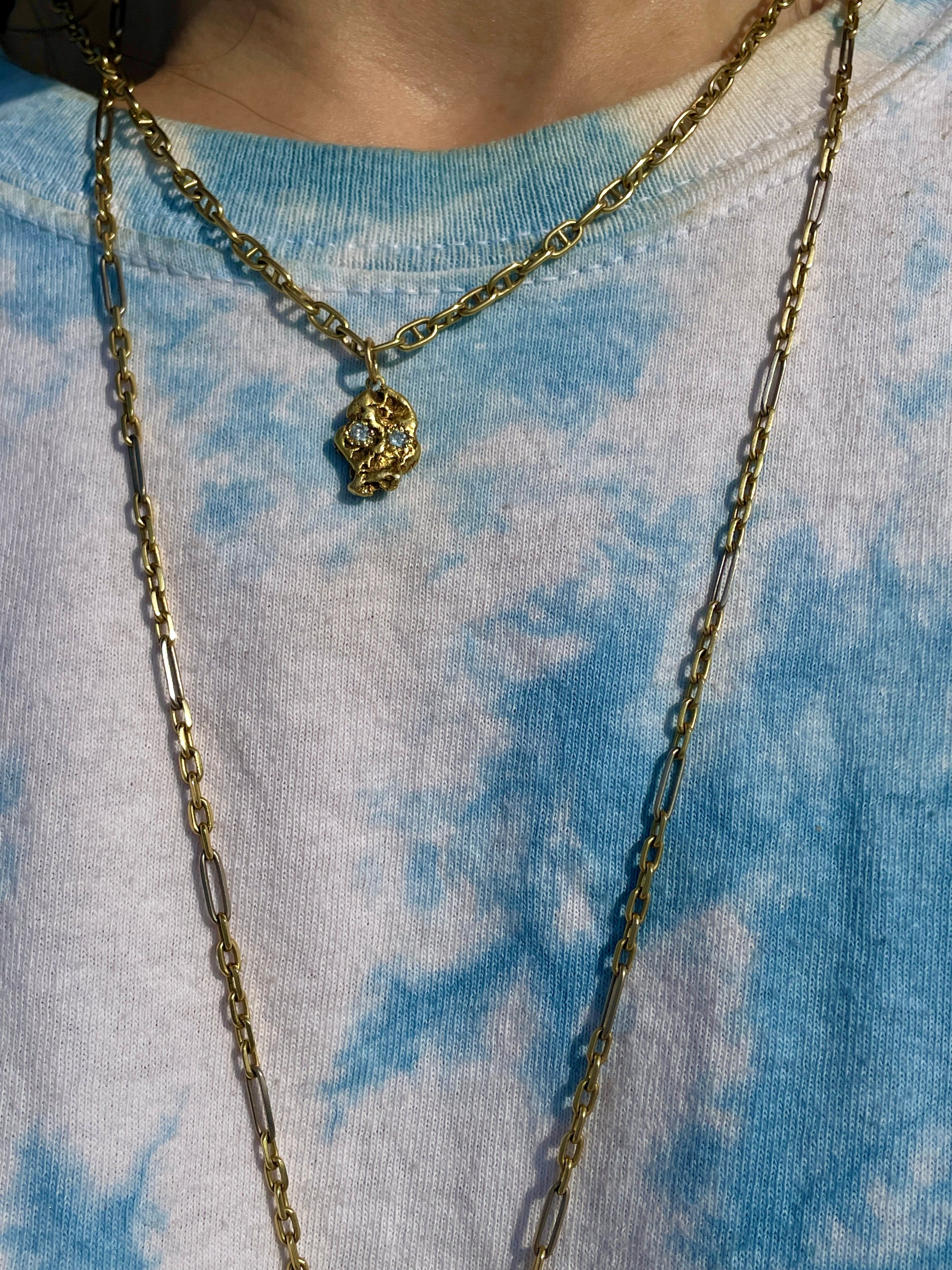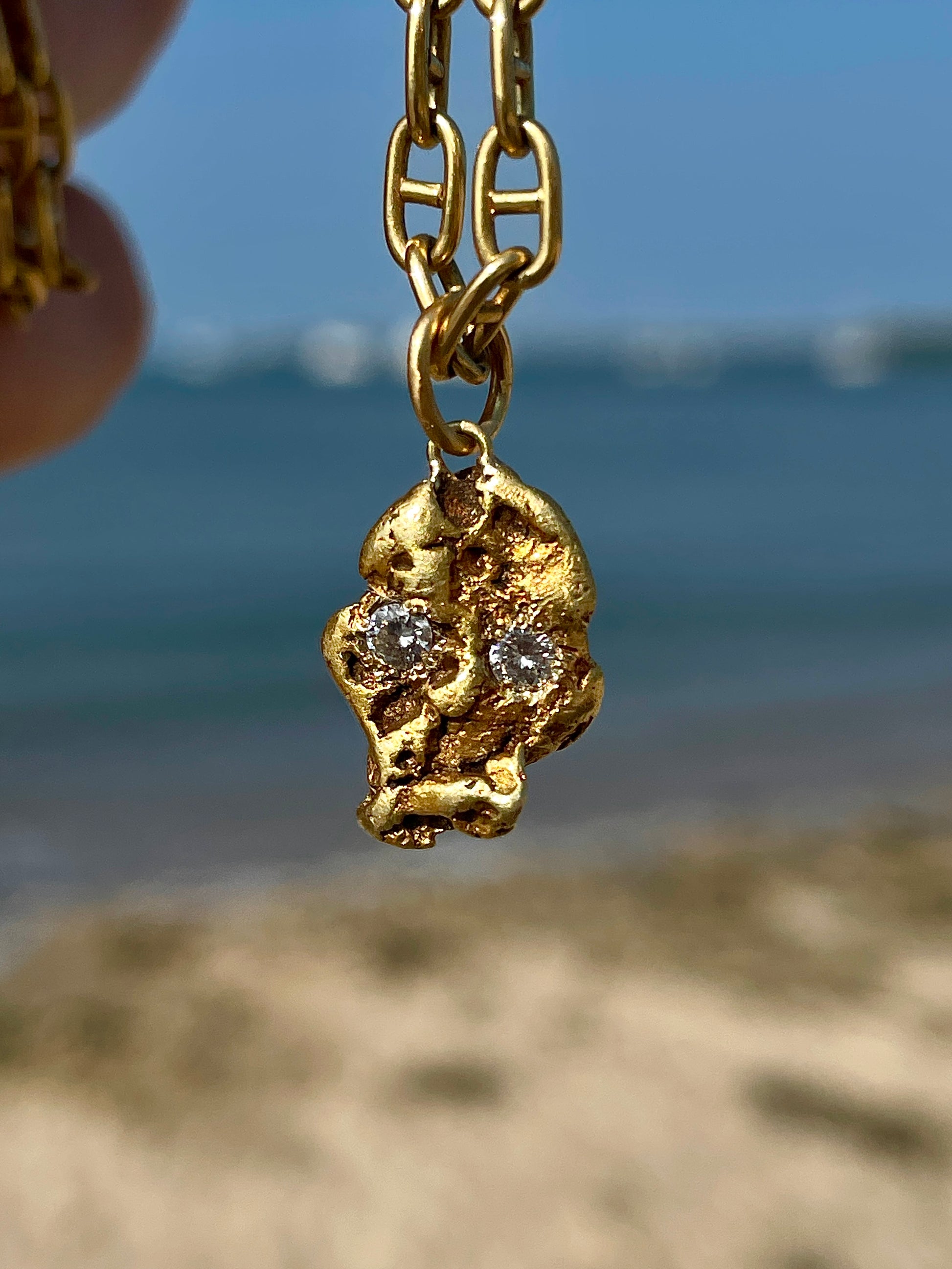 Found a vintage 22K-24K solid gold nugget stickpin that looked exactly like a funky skull to me making a face, so there was only one option — to ask my bench jeweler to add diamond eyes in the right position (I drew them on with marker) and transform it into a charm with a solid yellow 18K bale! Absolutely one of a kind - a charm that sparkles and glows and doubles as a fun conversation starter. You can decide if it has a tongue hanging out or not! To me, it sure does. He’s been to the beach with me and he’s ready to adventure with you.