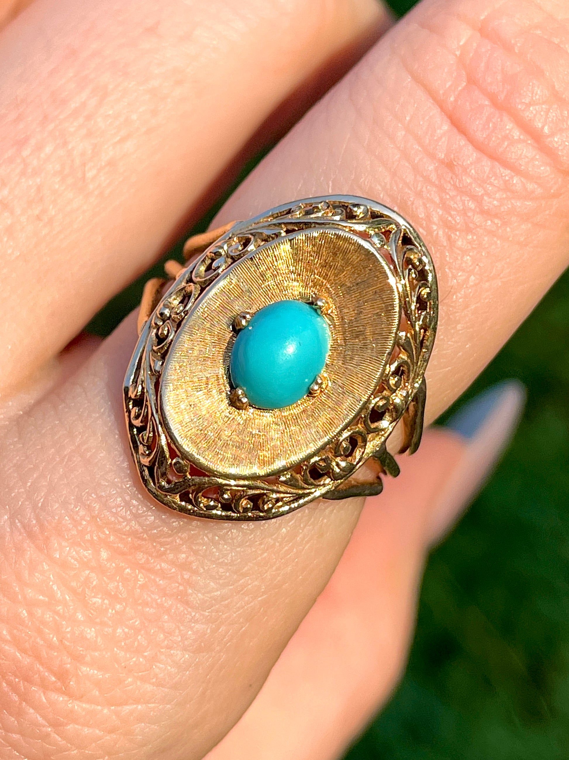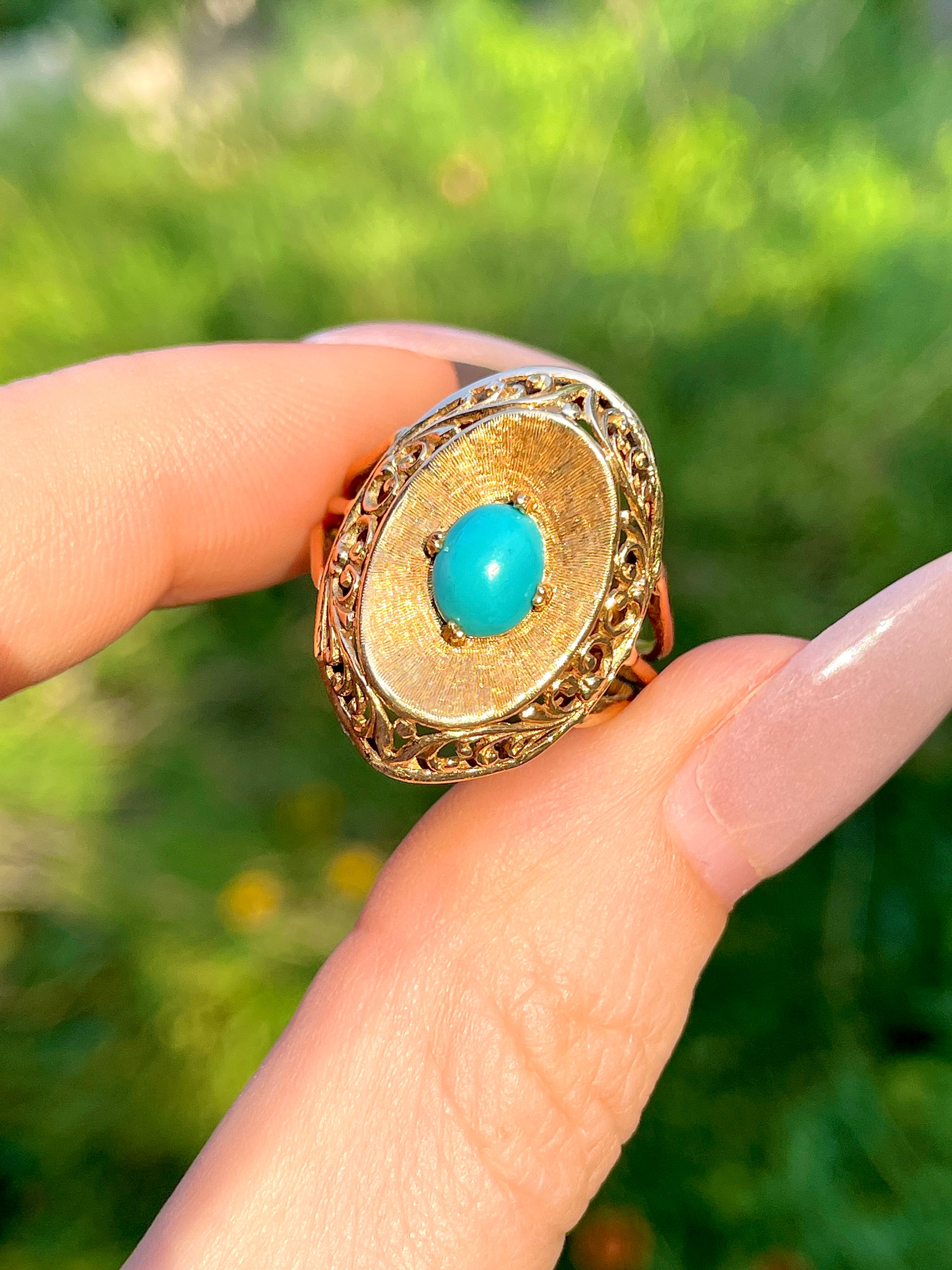 An absolute stunner in this Vintage circa 1950s yellow 18K turquoise oval scroll ring, size 7.25. Sizable. So many beautiful details in this design, from the hand etched florentine finish on the face, to the scroll cutouts, the low finger hugging concave profile, to the ribbed band itself. Turquoise cabochon measures 6.9 x 5.8 mm. Ring measures 22.3 mm widest. Weighs 4.6 grams. Hallmarked 18K. In very good preowned condition.
