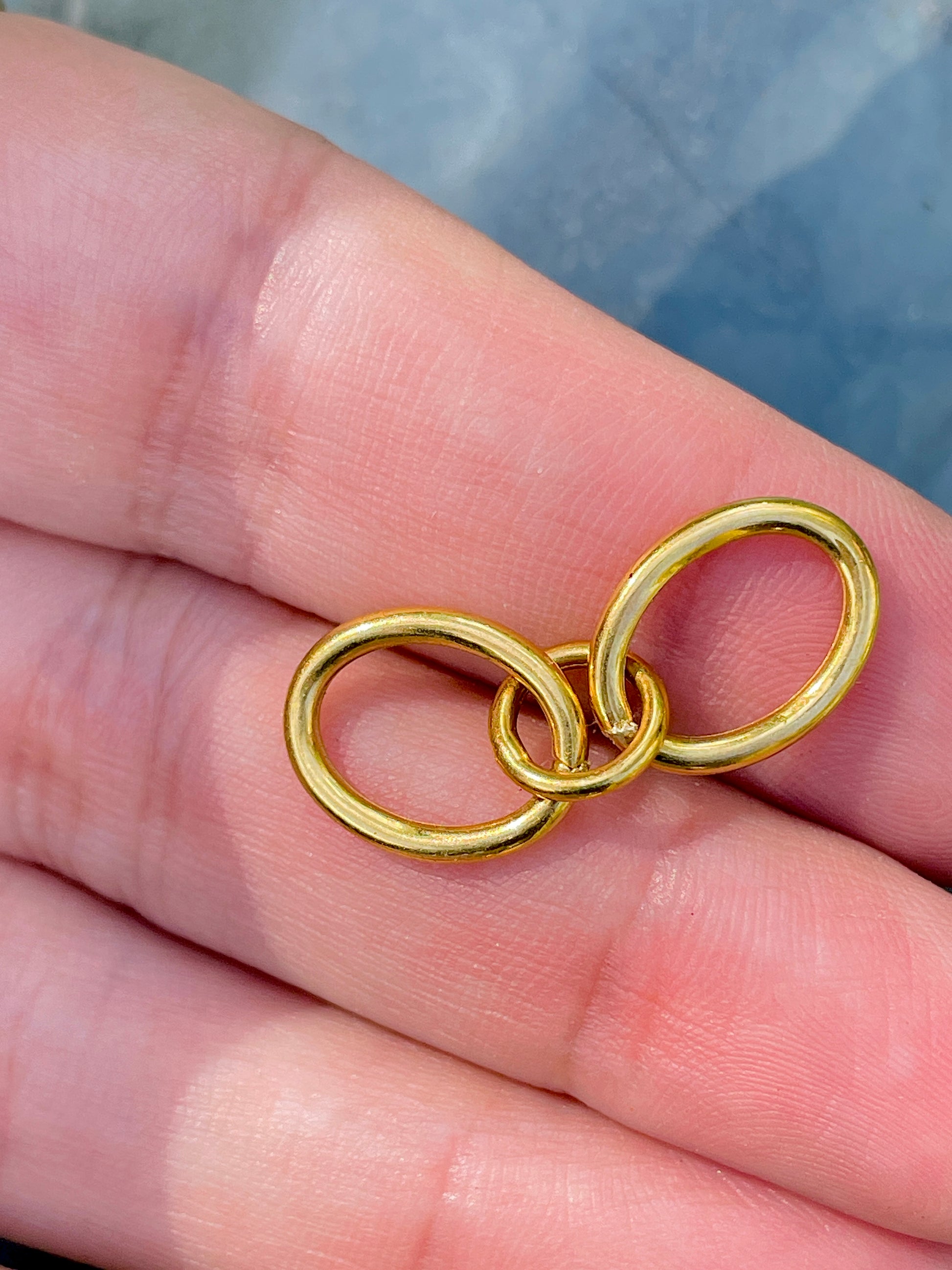A little Vintage yellow 19K link trio to dangle from an earring, a chain, or use to extend a chain (you will need a connector or a clasp to attach as the links do not open). Measure 27.7 mm long x 9.9 mm widest. Really buttery yellow. Links are hollow. In very good preowned condition.