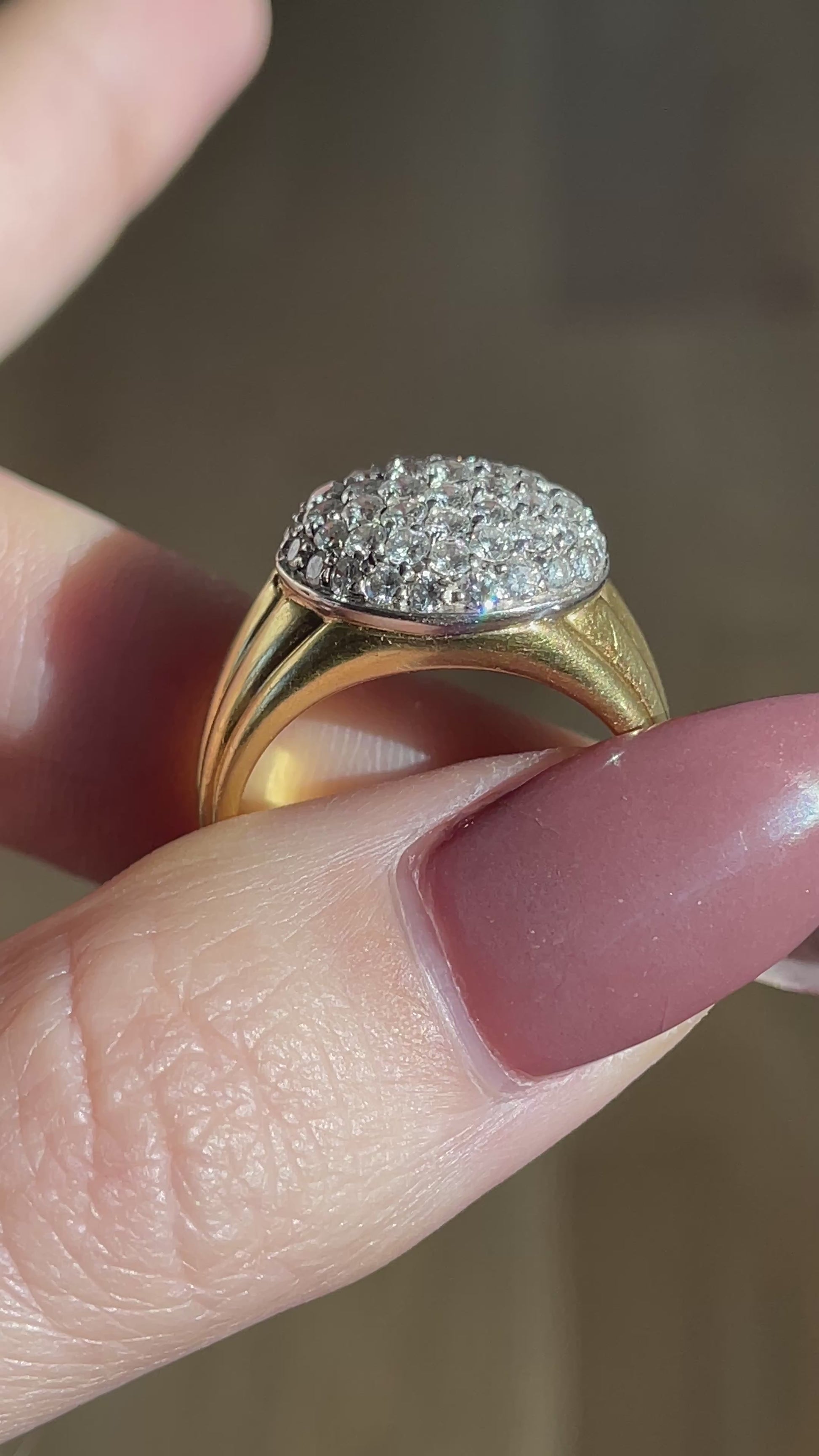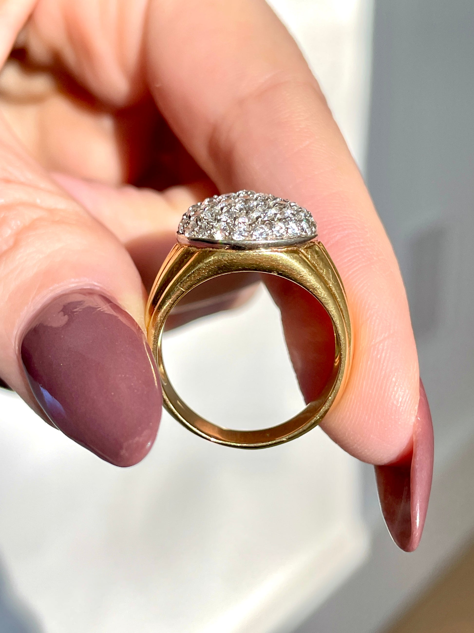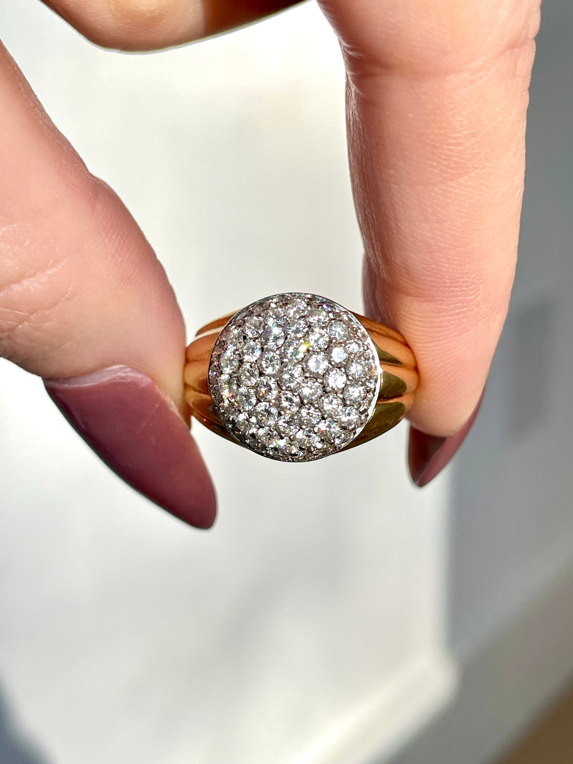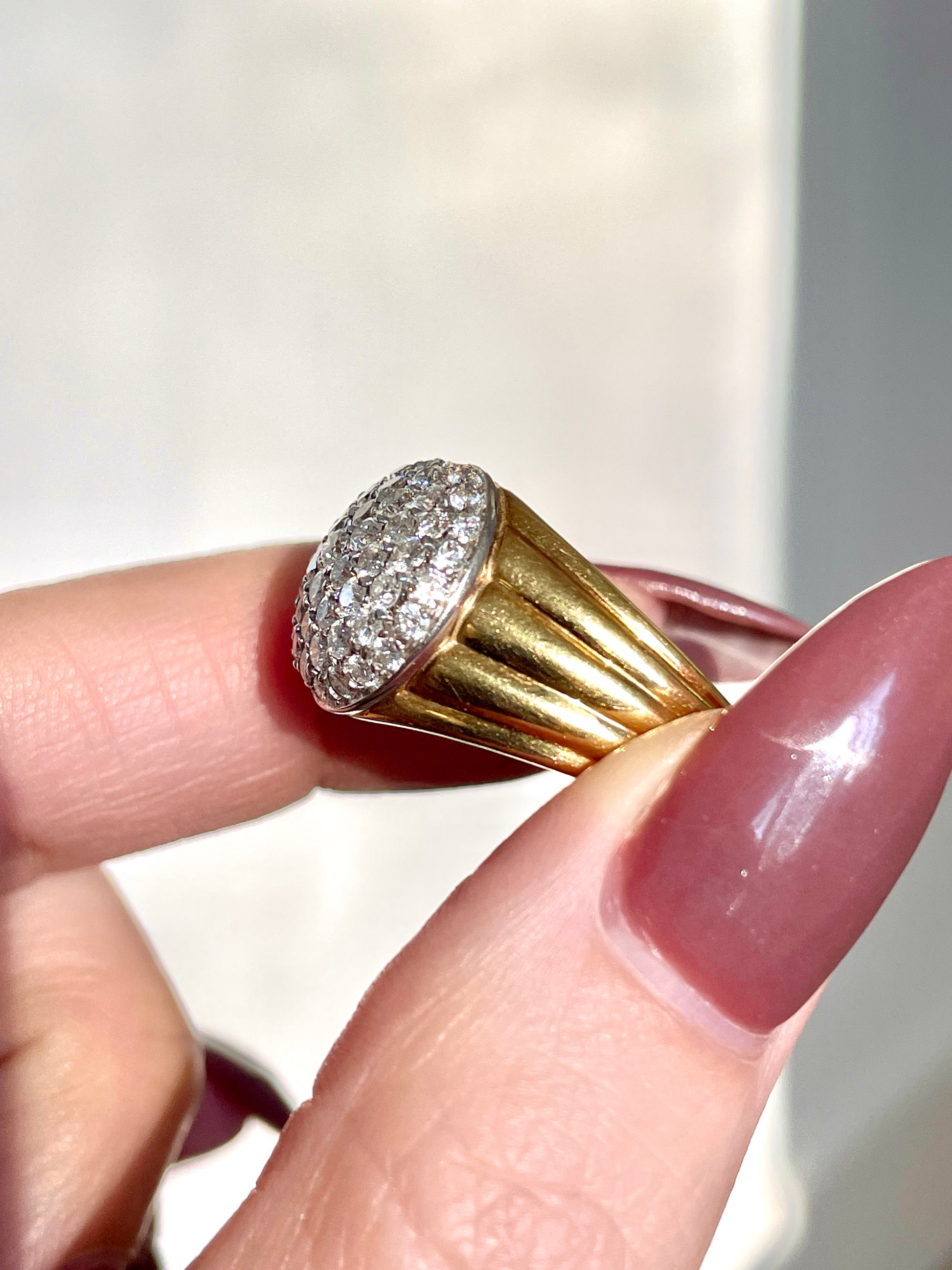 Vintage yellow 18K gold and platinum approx 1.2 ctw diamond dot signet ring with ribbed shoulders, size 7.75