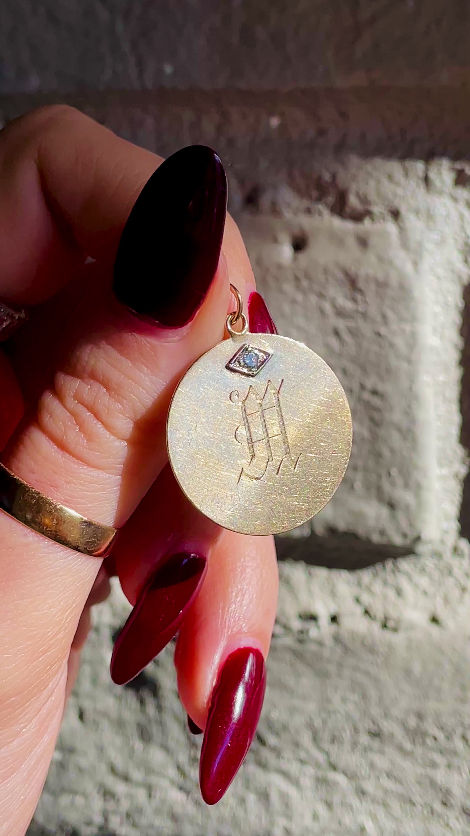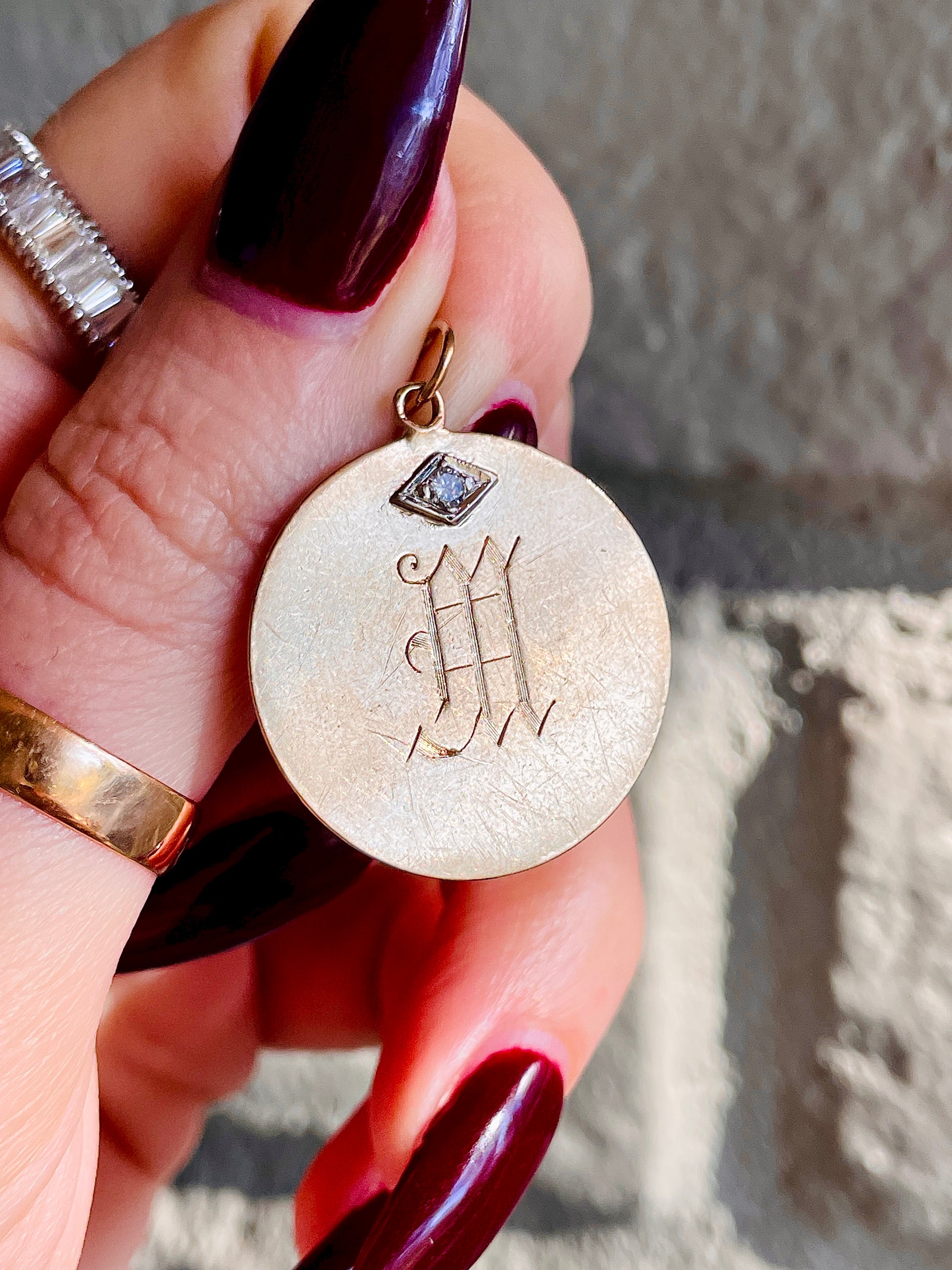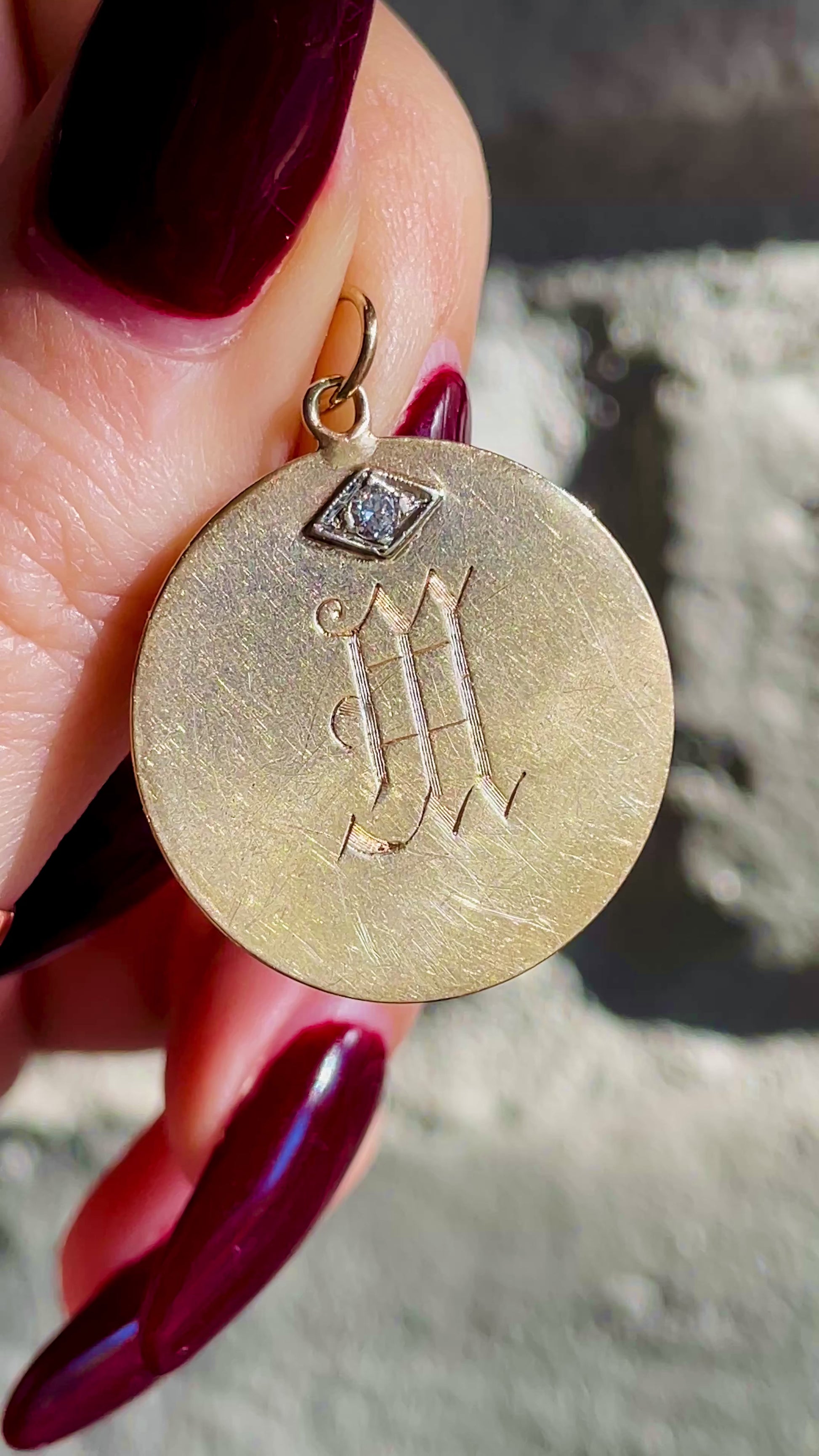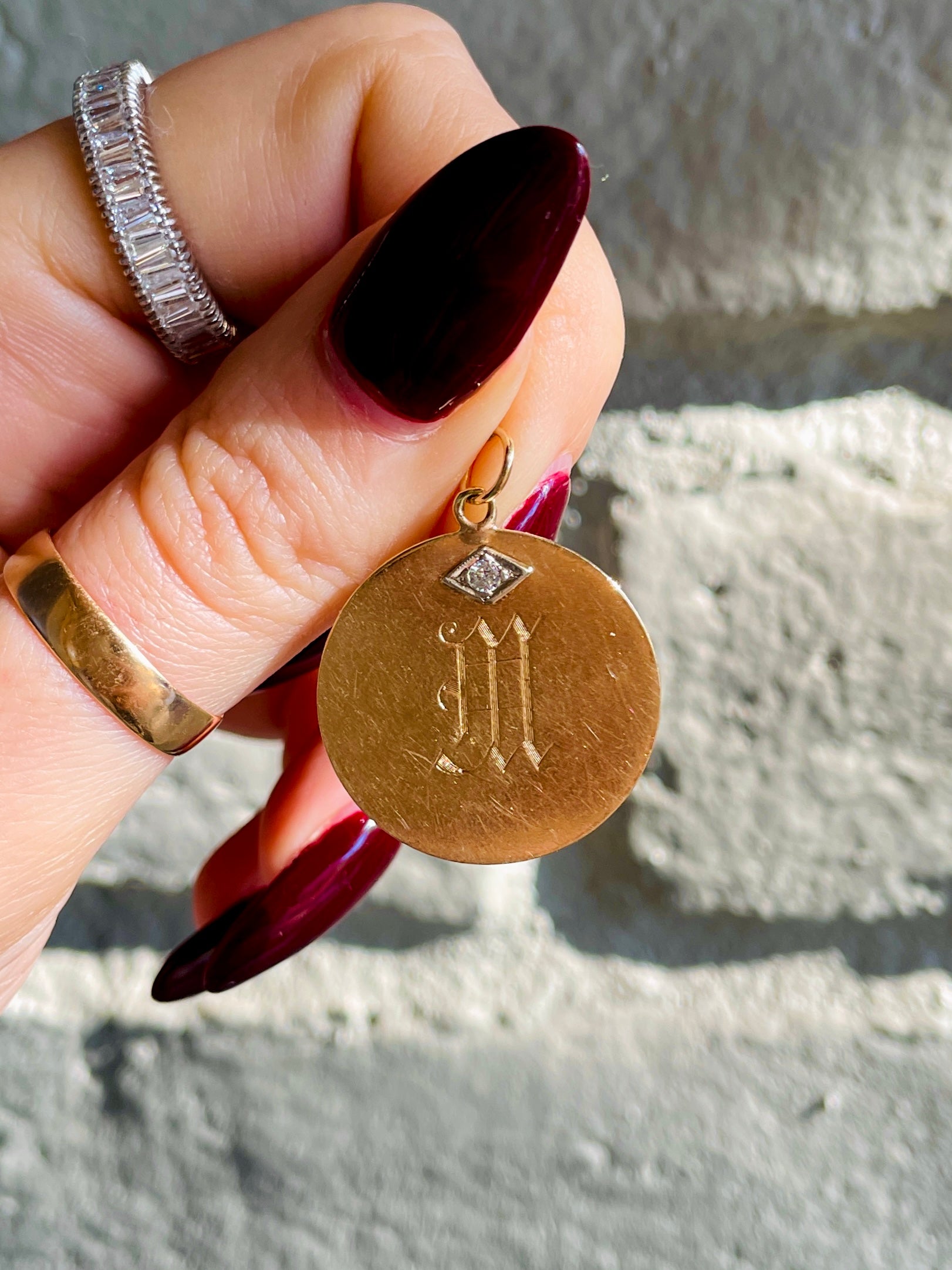 Vintage yellow and white 14K gothic letter M engraved medallion with .035 ctw diamond