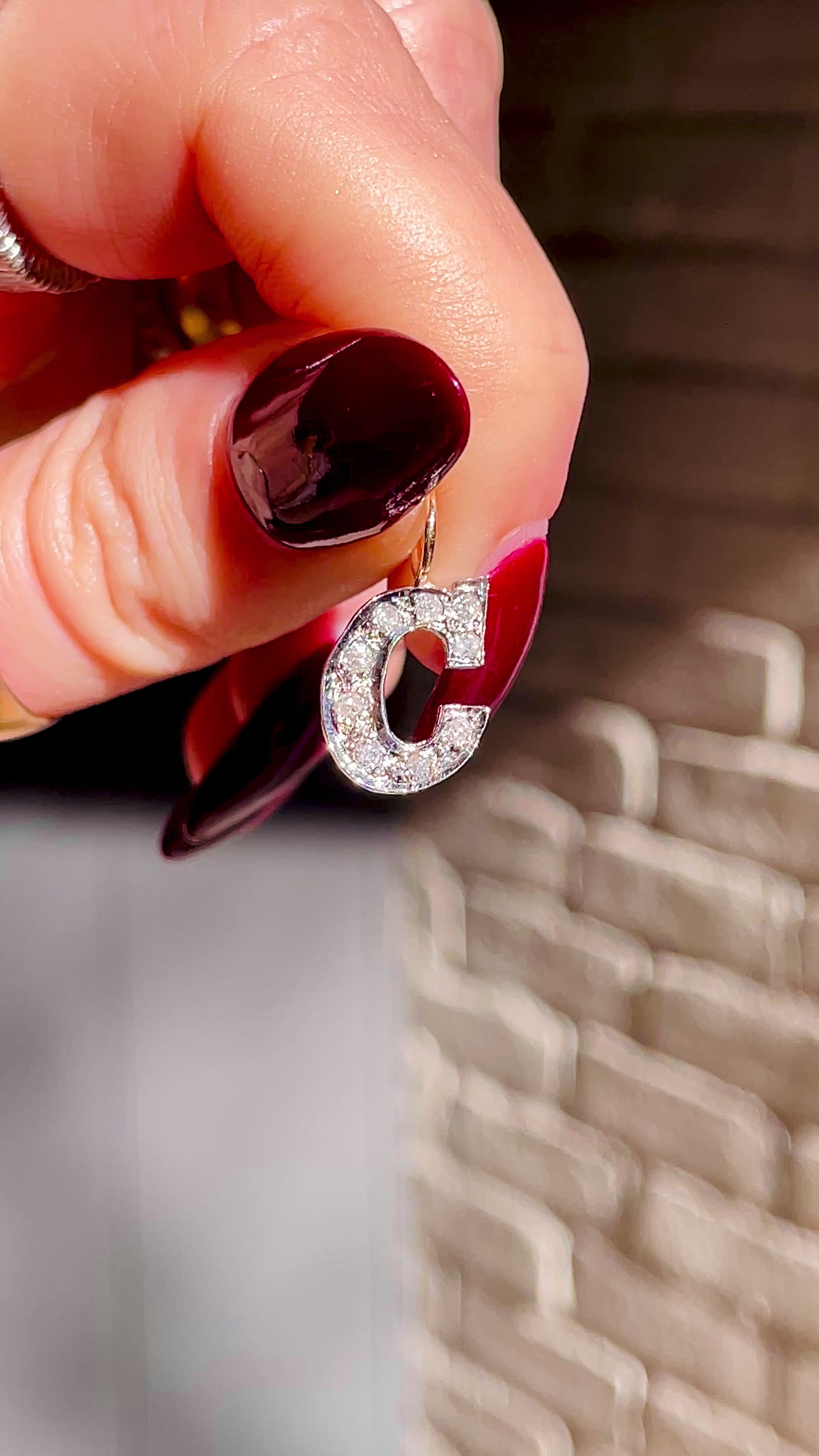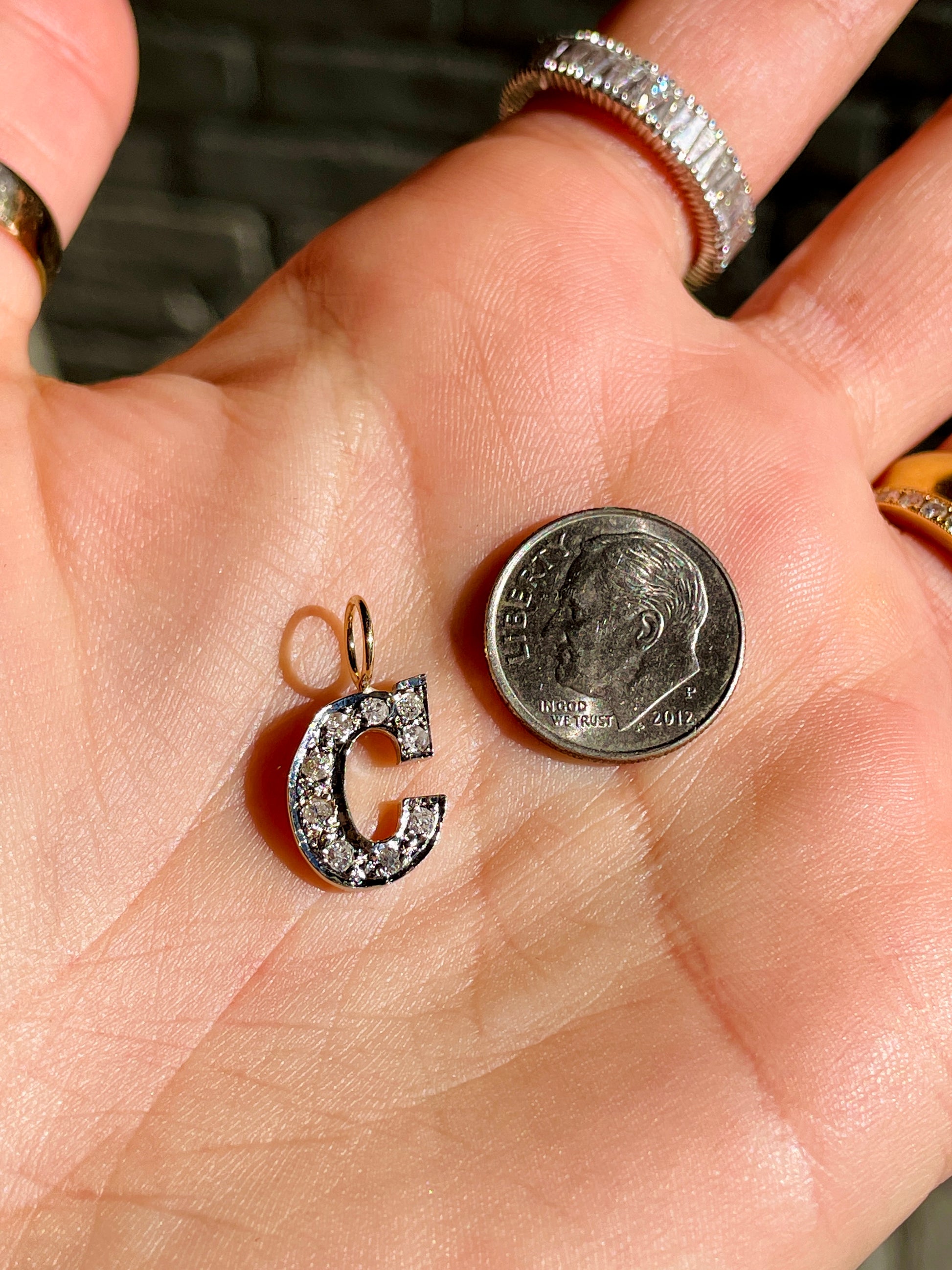 Really sweet and sparkly vintage yellow and white 14K letter C charm with approx .22 ctw diamonds with stationary bale. Measures 19.5 mm tall and 10.6 mm wide. Love this worn solo or in a stack with other charms. Weighs 1.4 grams. In very good preowned vintage condition.