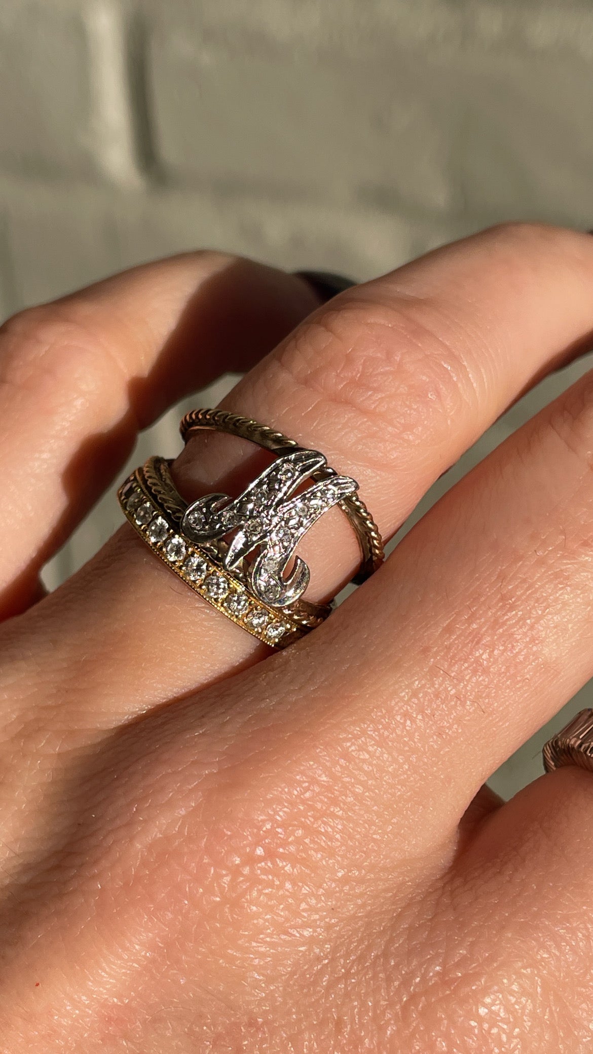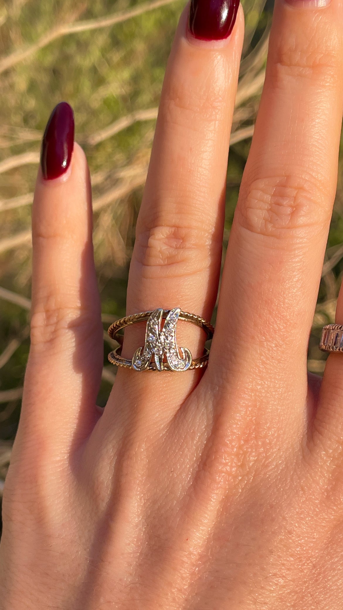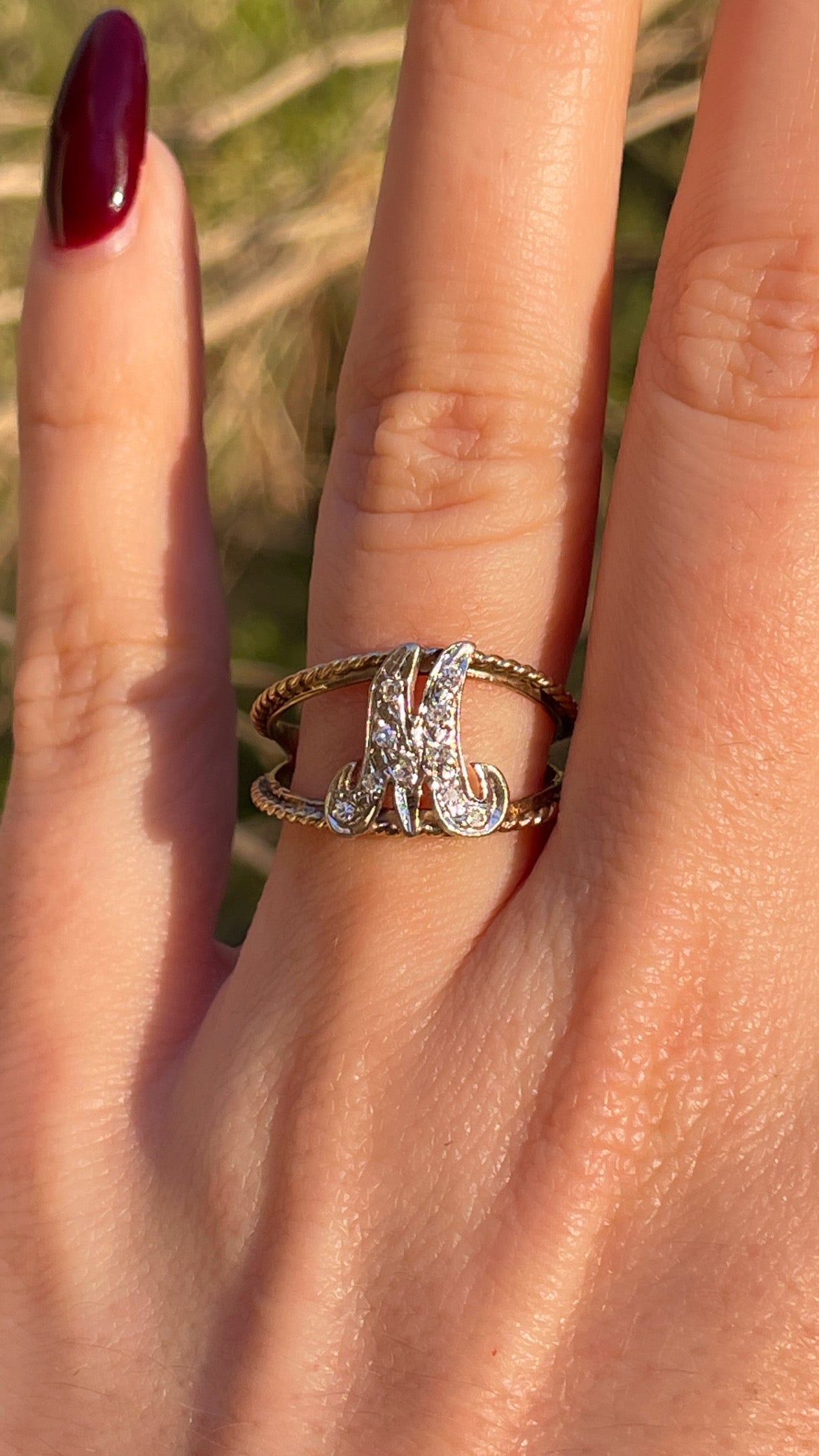 Vintage yellow and white 14K letter M ring with approx .19 ctw diamonds, size 7.25