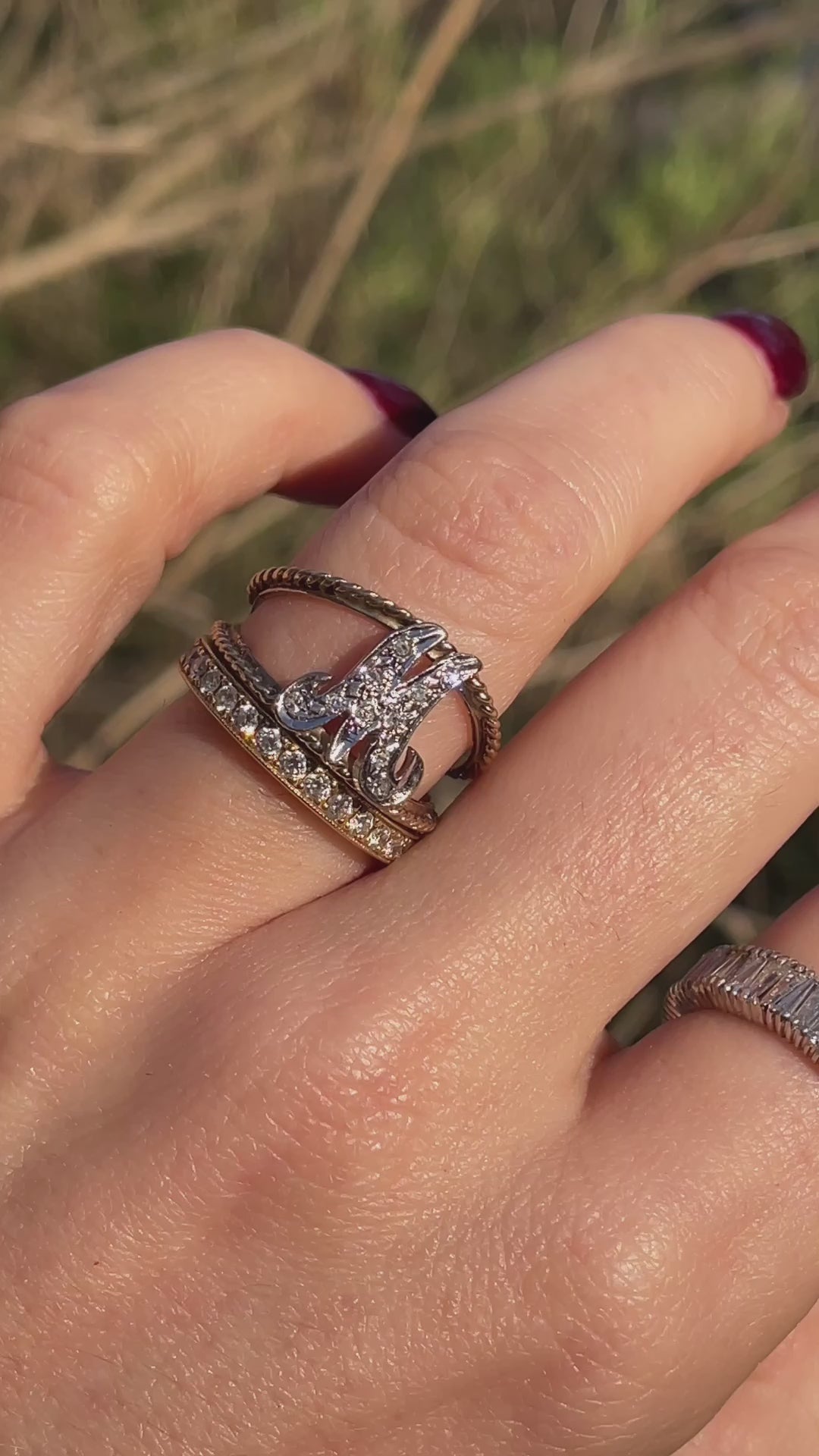 Really pretty vintage yellow and white 14K letter M ring with approx .18 ctw diamonds set in white gold, size 7.25 and sizable. Face of ring measures 11.8 mm wide. Total weight is 3 grams. Faint 14K gold hallmark. In very good preowned vintage condition.