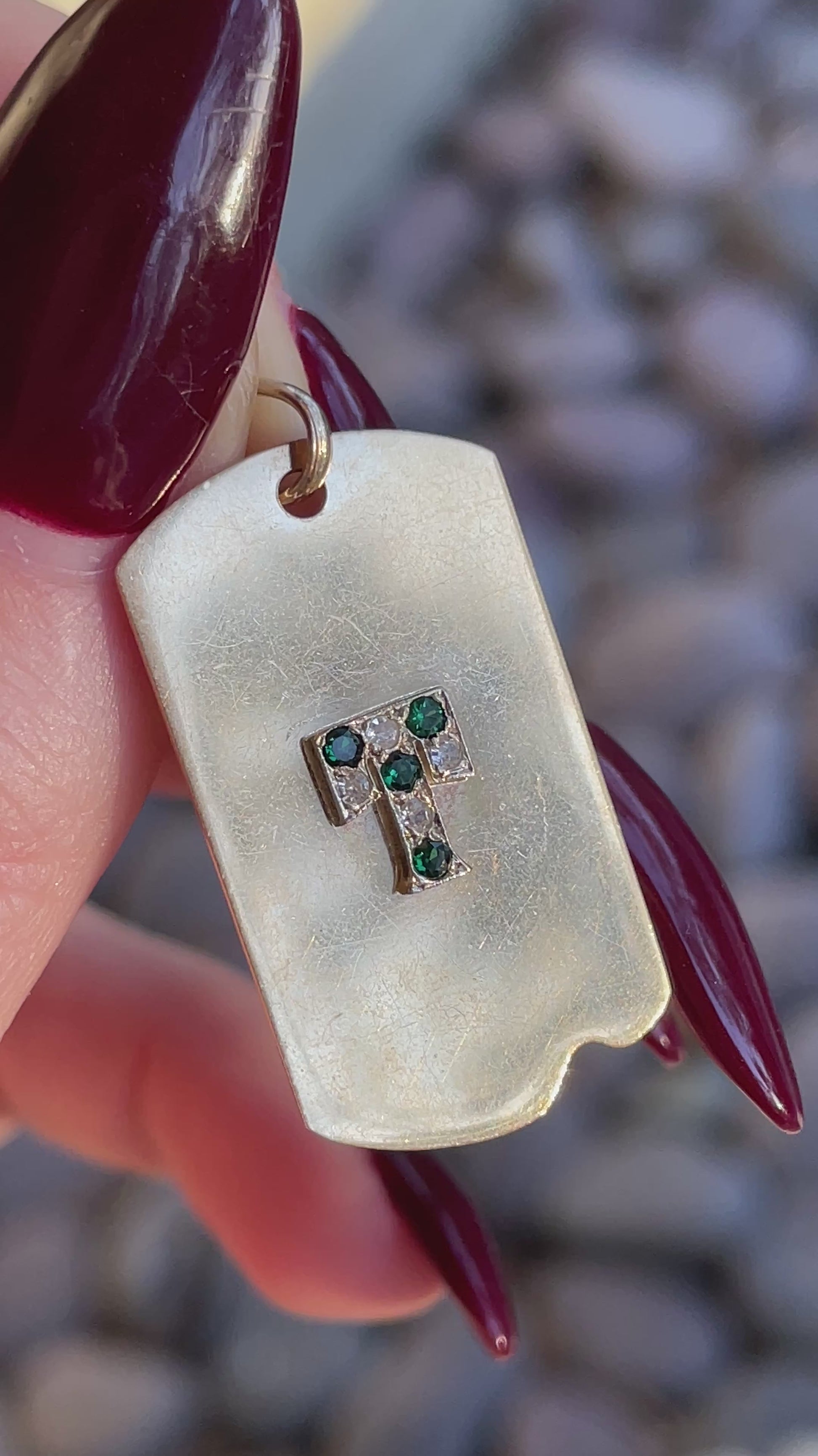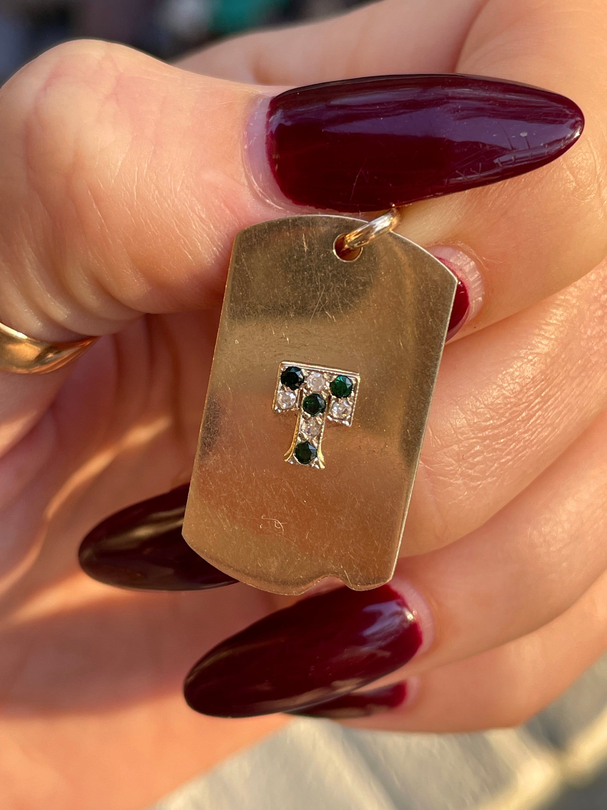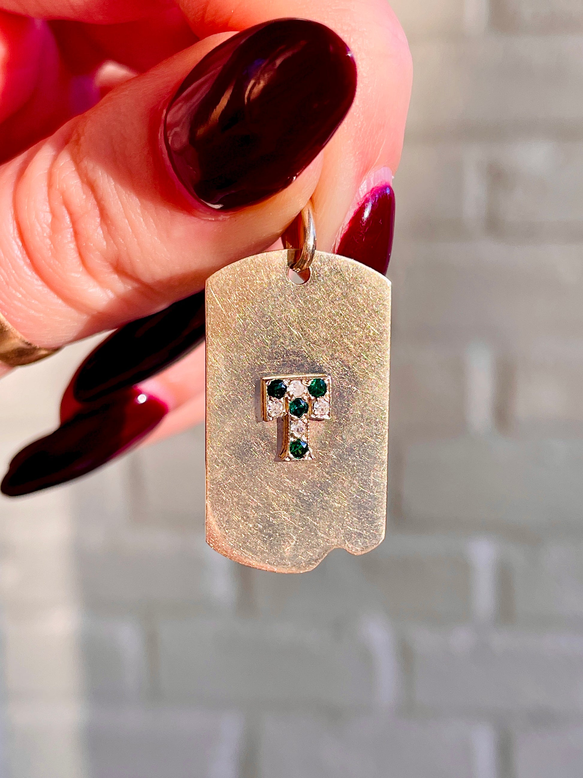 Vintage yellow and white 14K letter T tag charm with .07 ctw diamonds and emeralds