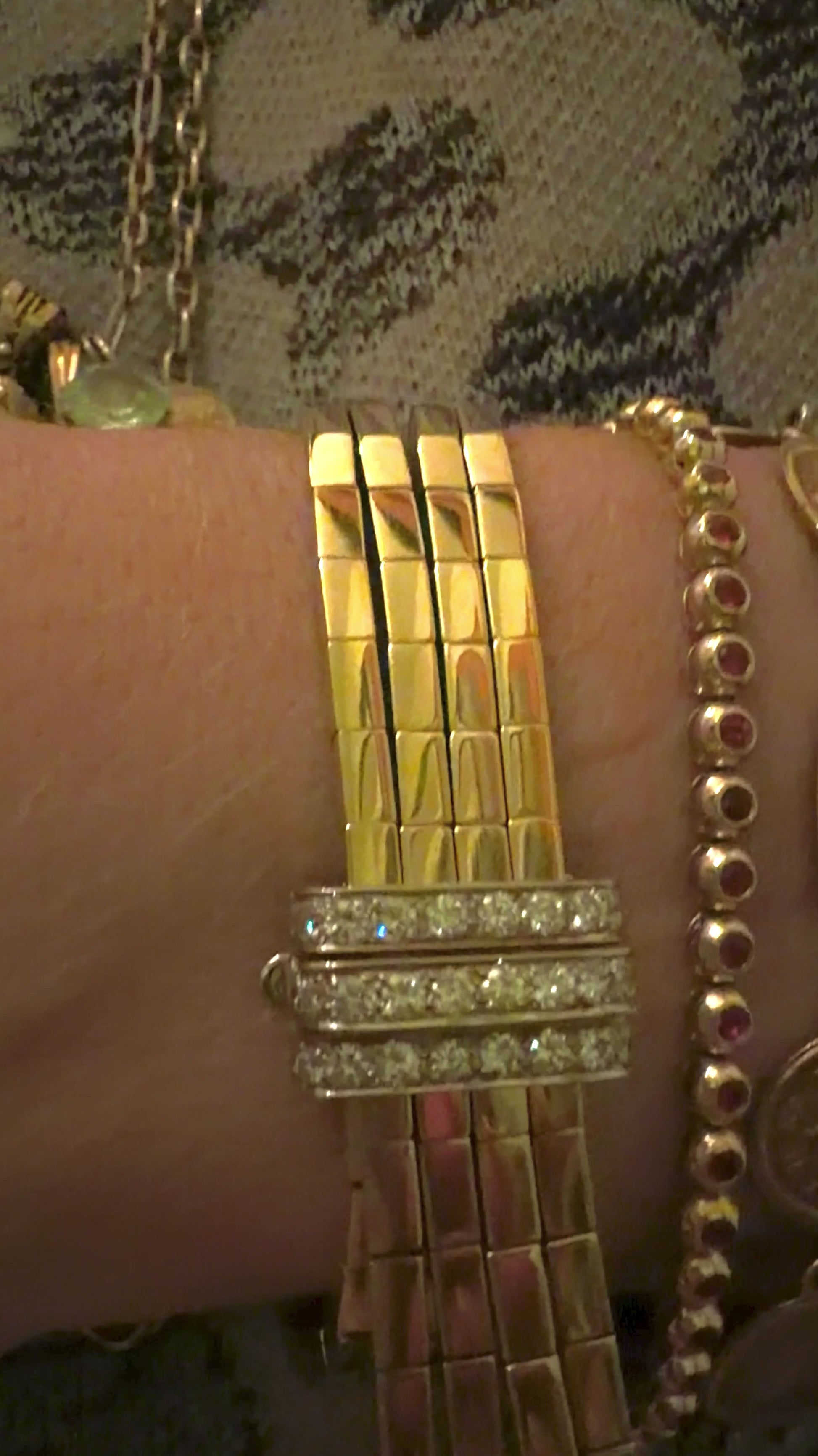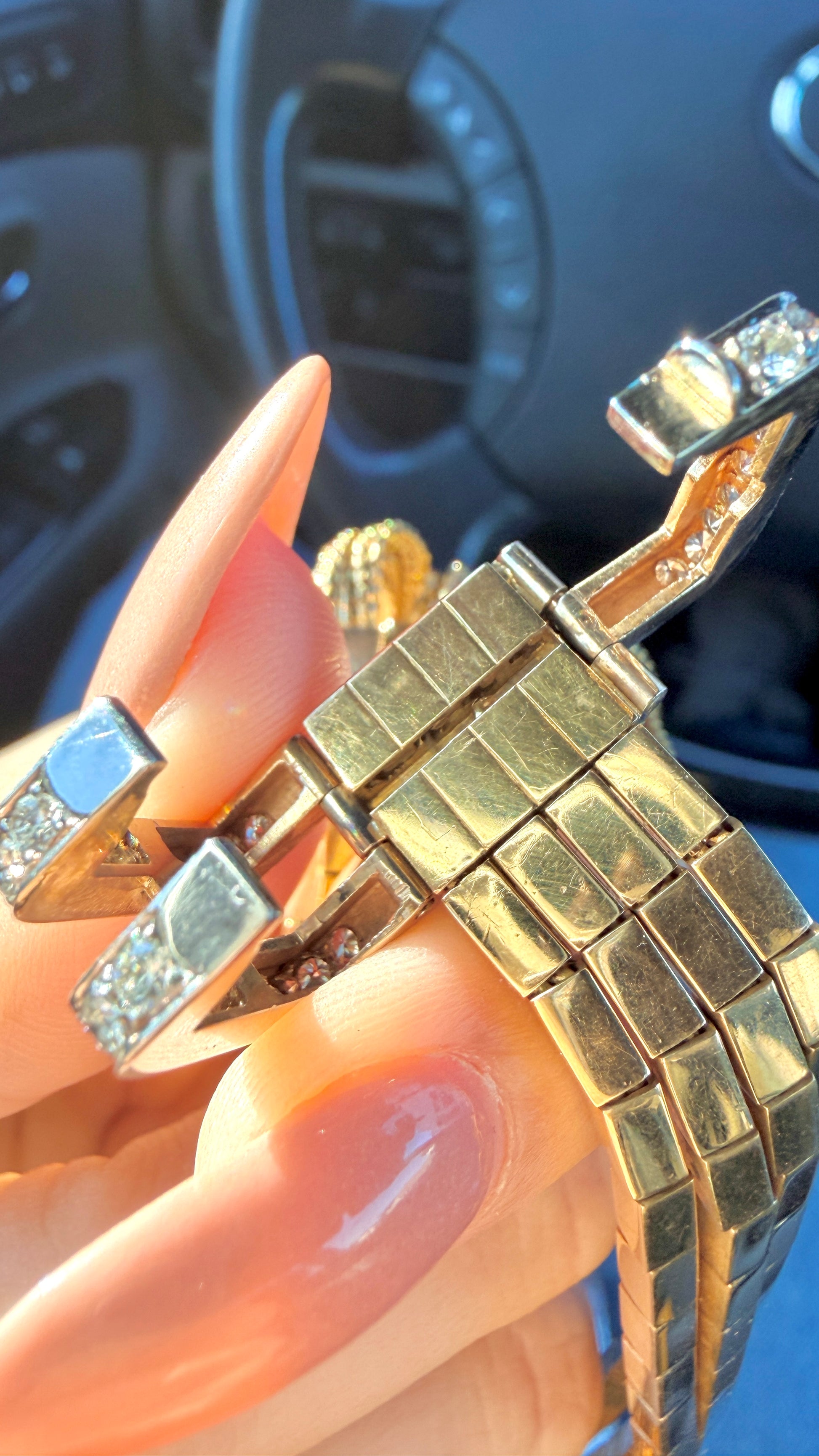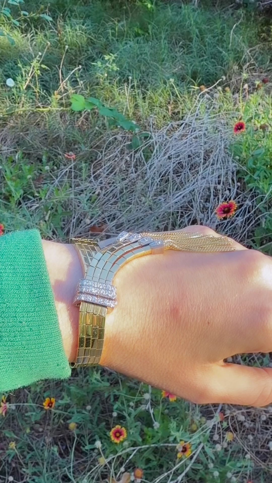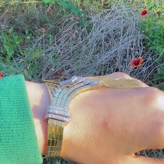 A absolutely gorgeous vintage yellow and white 18K approx 1.4 ctw diamond buckle bar link tassel bracelet, best I've ever seen, fits 6.25 inch wrist or smaller. It weighs over 78.4 grams, it’s in amazing condition, incredibly well made with approx 1.4 ctw of GH/SI avg clarity diamonds. Fits my 6.25 inch wrist fine, wouldn’t fit a larger wrist comfortably but smaller wrist would do fine as well. 18K hallmarked. It’s all 18K so the white metal is white 18K gold. It has a K18 hallmark and something next to it, but I can’t read it under a loupe. Bar links altogether are 11.1 mm wide and the diamond buckle is 16.8 mm wide. Held together the diamond caps on the tassels are 20 mm wide across.