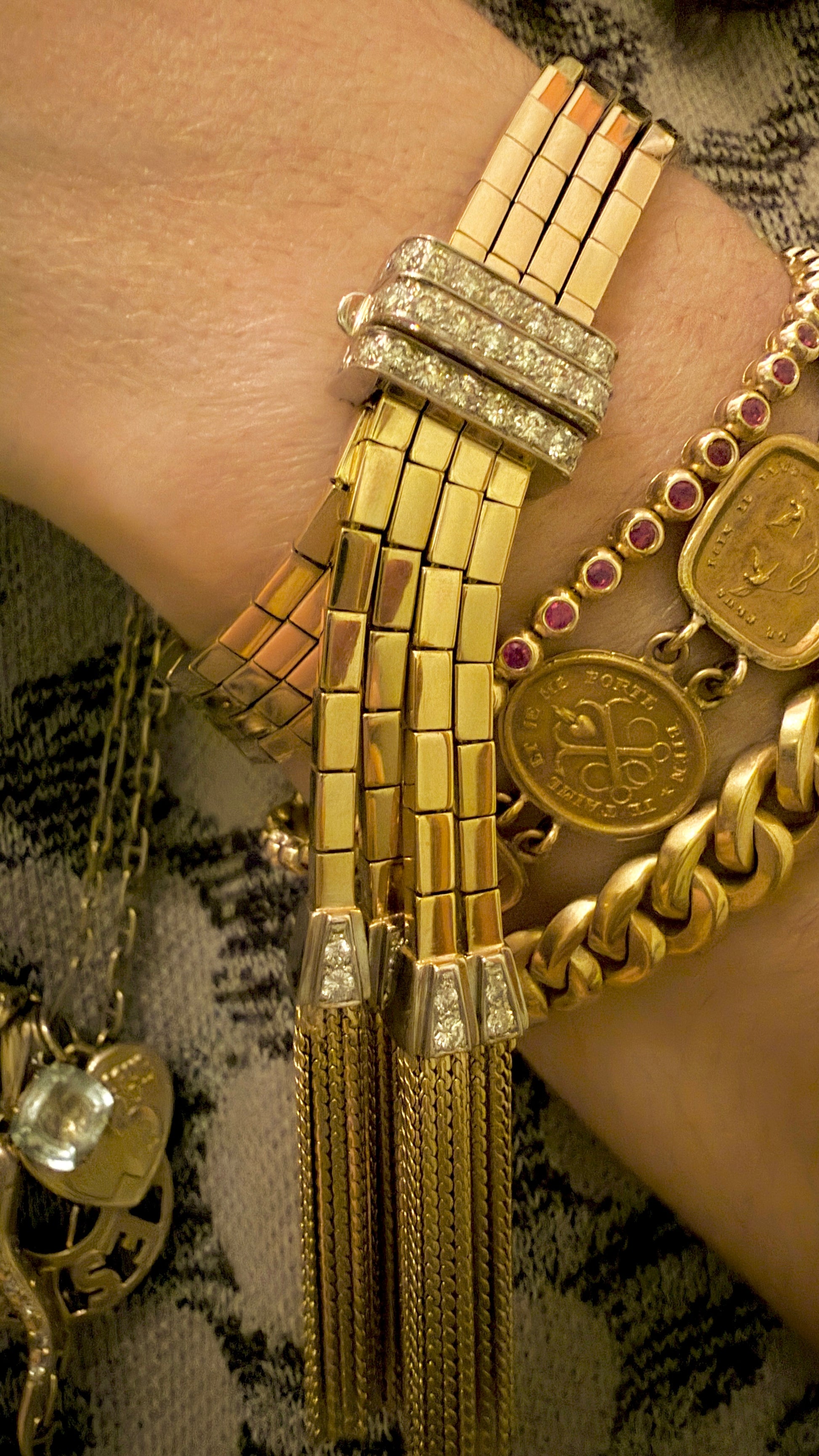 Vintage yellow and white 18K approx 1.4 ctw diamond buckle bar link tassel bracelet, fits 6.25 inch wrist or smaller