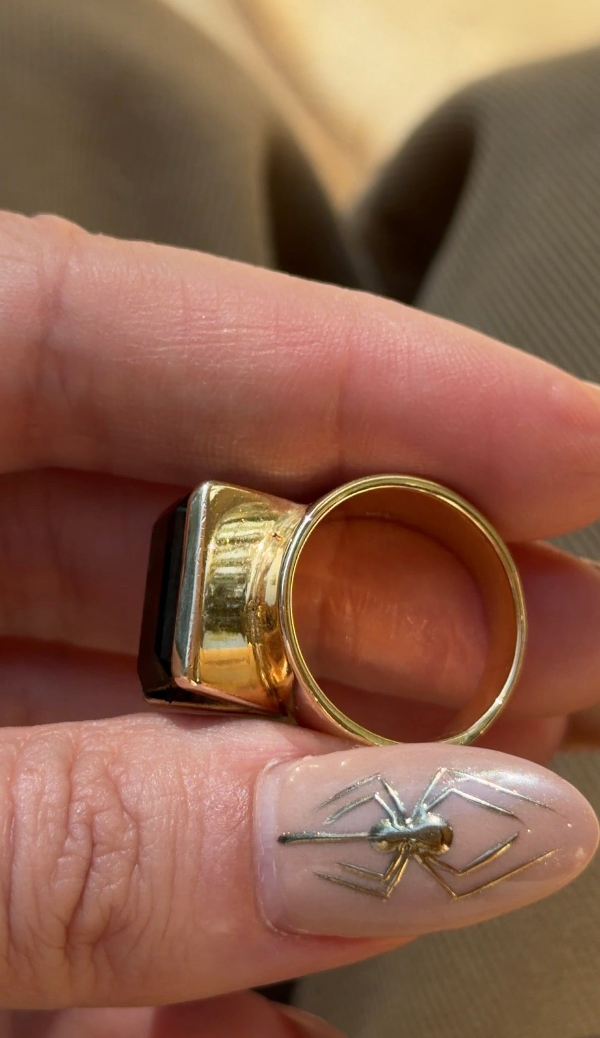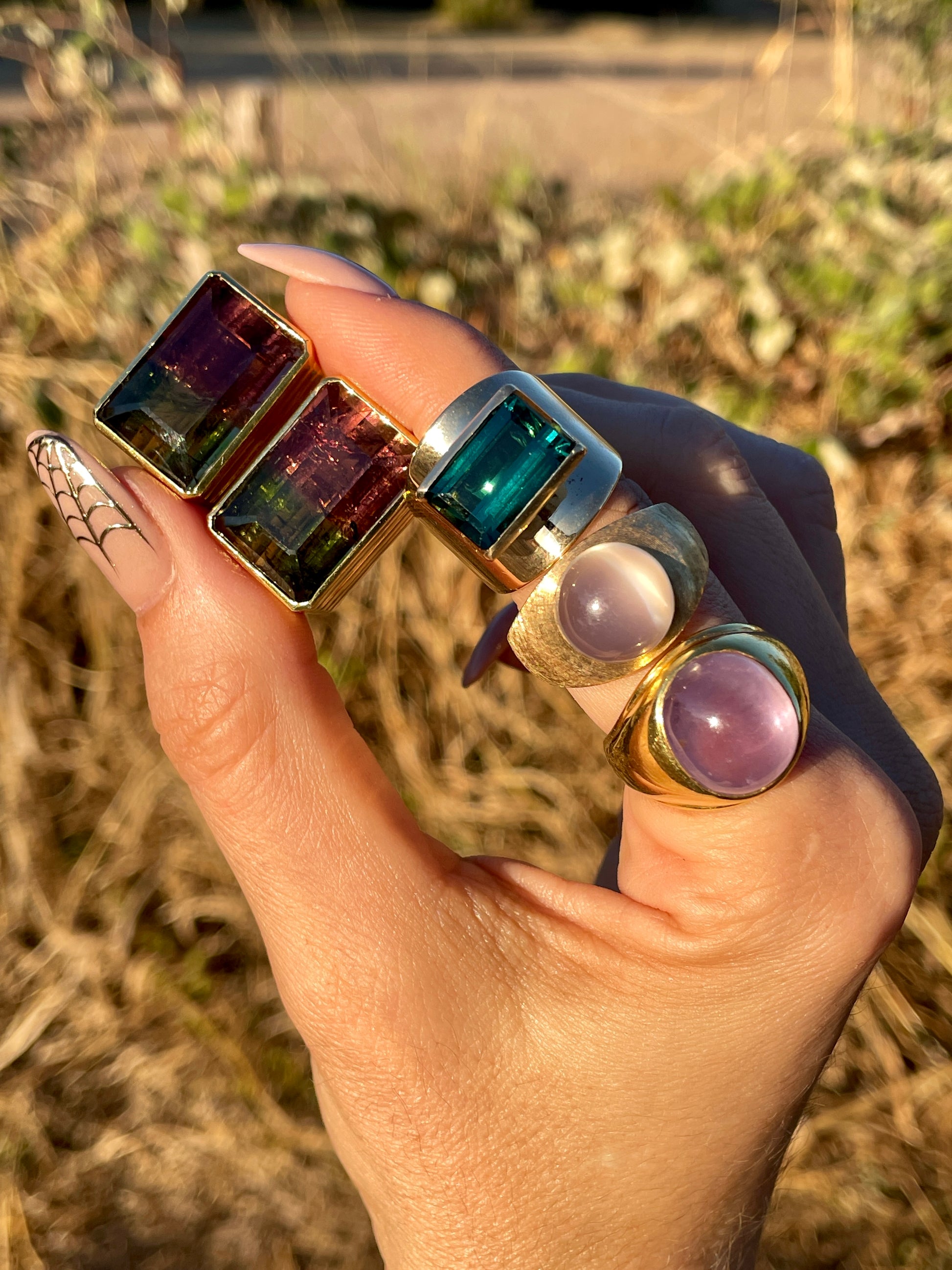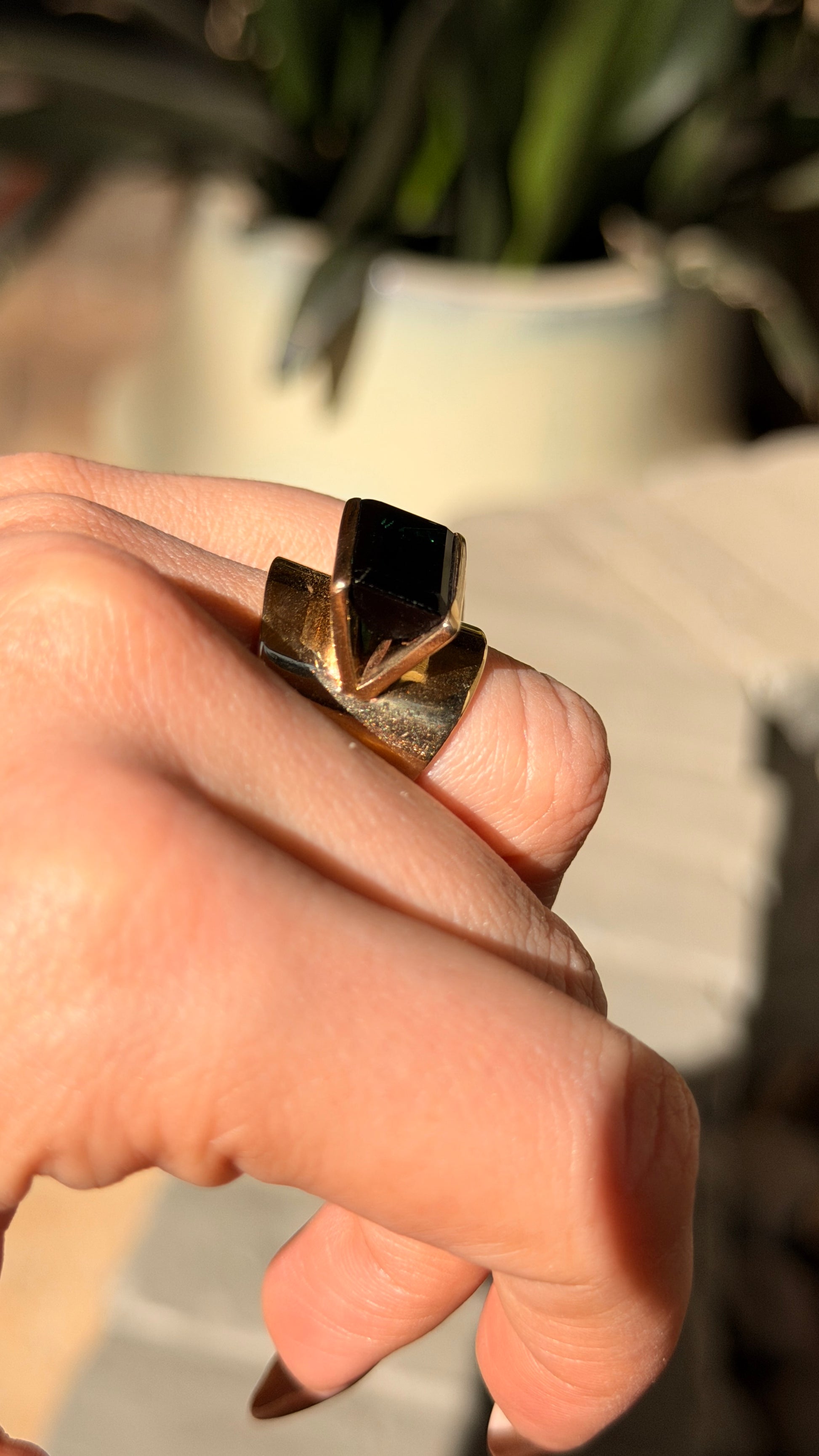 A bold Vintage yellow 14K gold channel set approx 9.6 ctw green tourmaline statement ring, size 6.75. The tourmaline is exceptionally clear and a gorgeous earthy dark teal green measuring 13.5 x 8.5mm. Band tapers from 19 mm in front to 9 mm at back. Prefer not to size this ring so as not to disturb stone setting. Super comfy! Weighs over 15.8 grams.